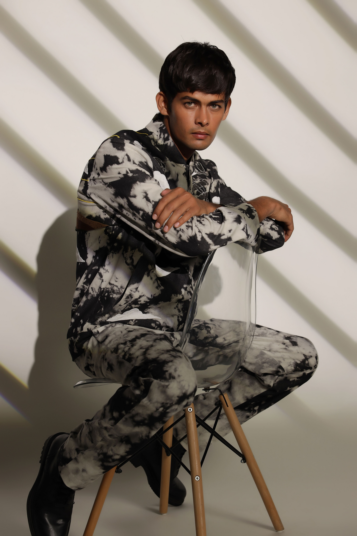 Double layer bomber with with airballoons, sun and clouds patchwork embroidery. The garment has gun metal buttons, gun metal zip and pockets. It is paired with matching joggers.