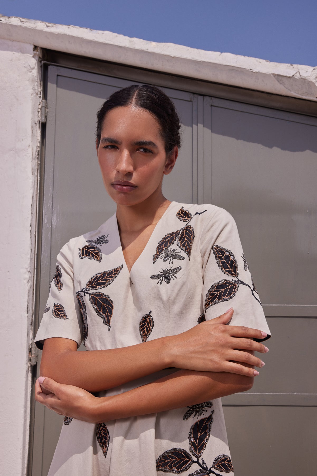 Circular dress with drifting branches embroidery. The garment has side concealed zip opening, attached leather belt, one side pocket and top stitching detail on bottom. It also has contrast color satin facing under sleeves and hem.