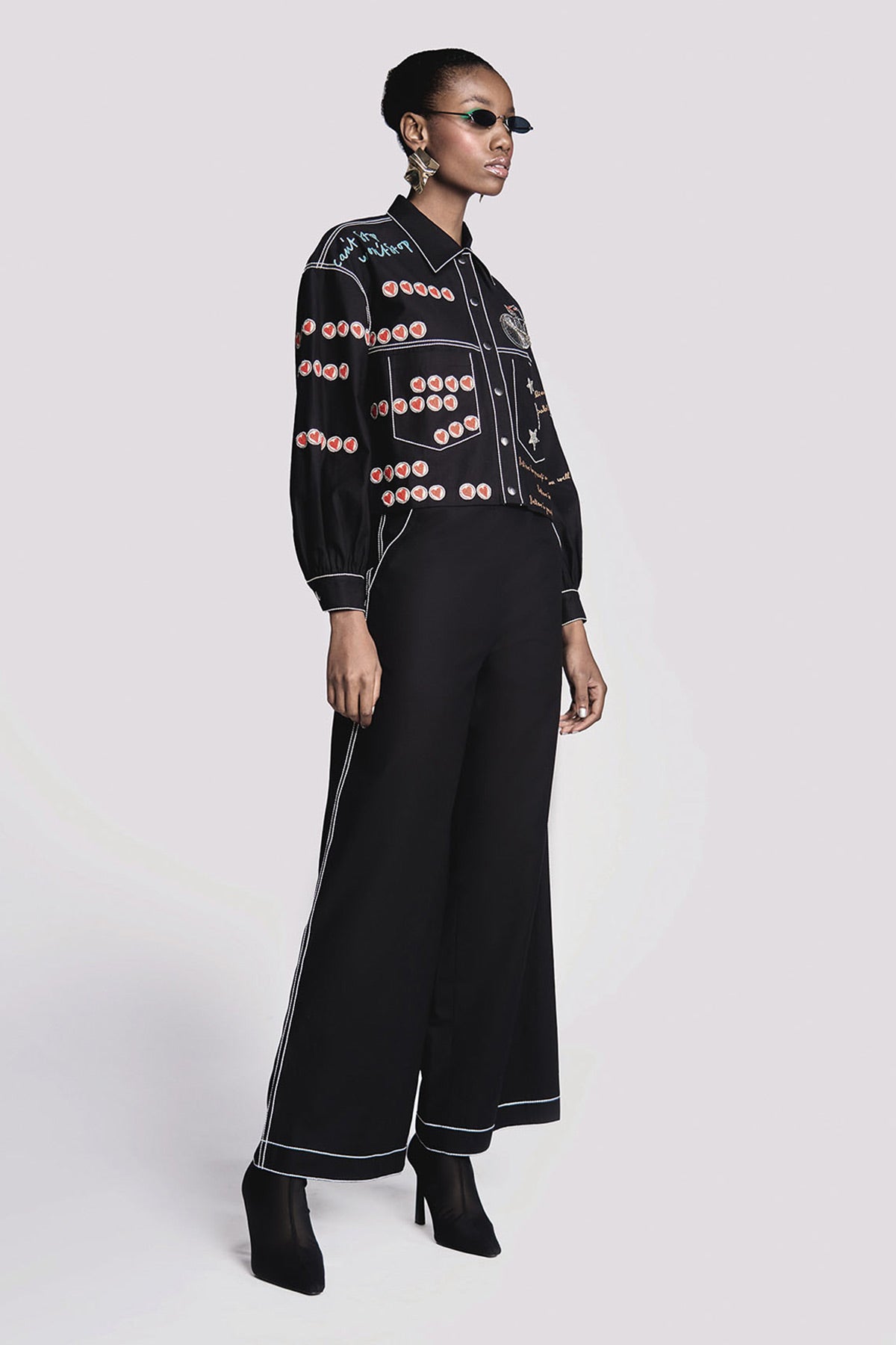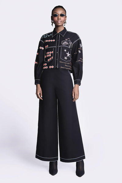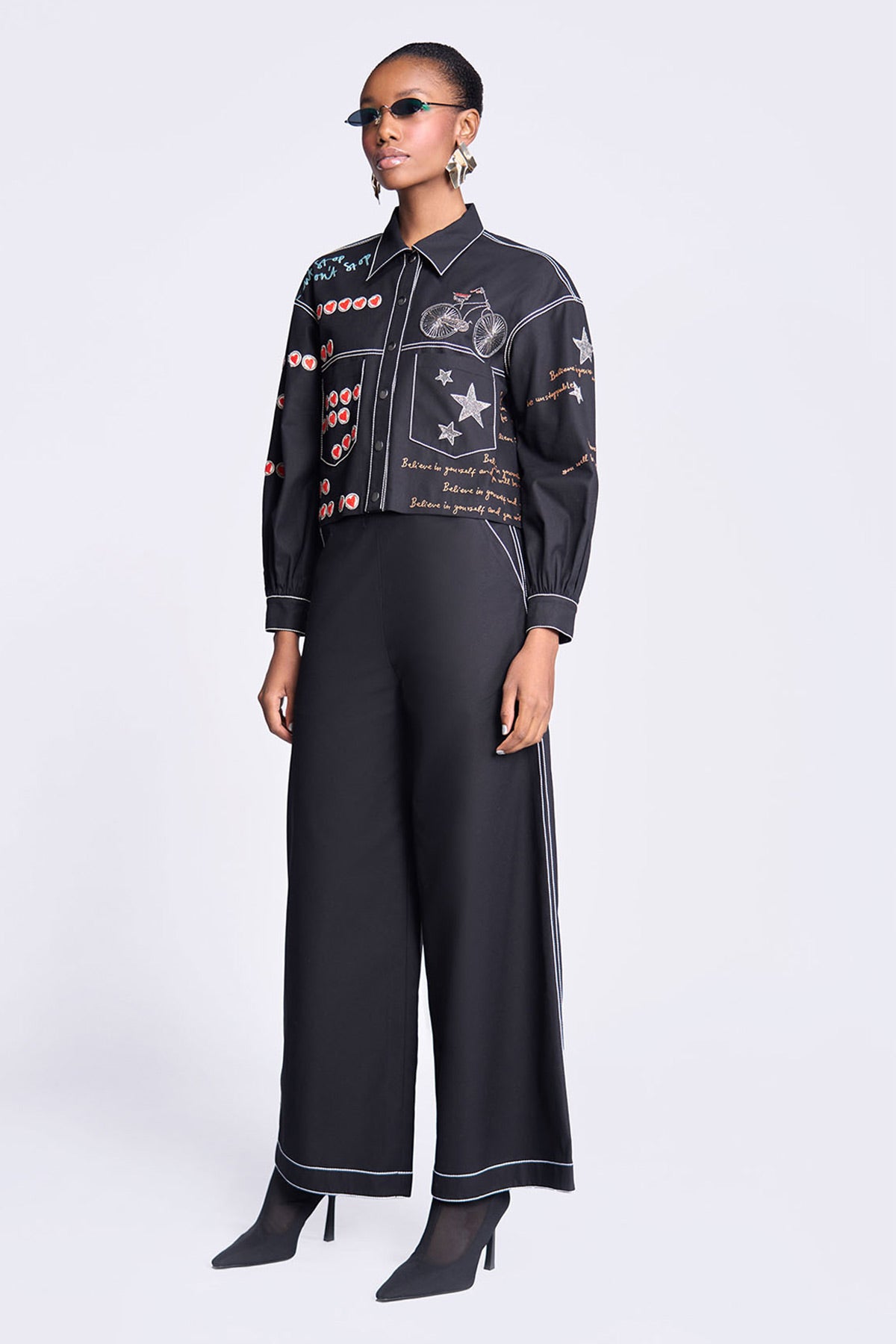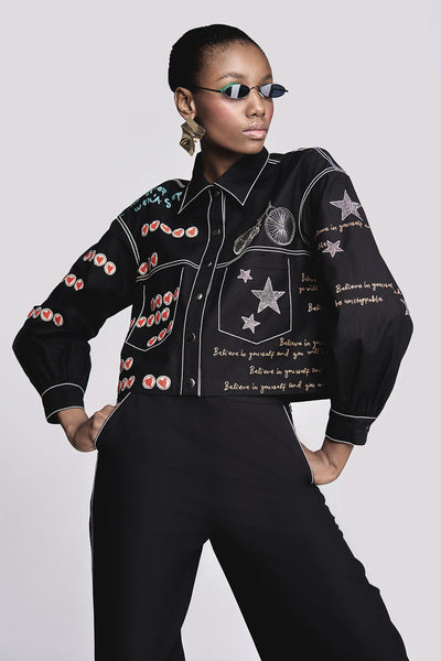 Short Jacket With Heart-embroidered Circle Patches, Vintage Bicycle, Stars and Believe in Yourself Text. It Has Metal Snap Buttons, Collar, Cuffs, Patch Pockets and Top Stitching Detail.