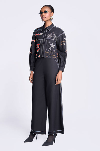 Flared Pants With Side Concealed Zip Opening, Side Pockets and Top Stitching Detail.