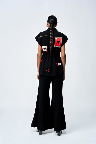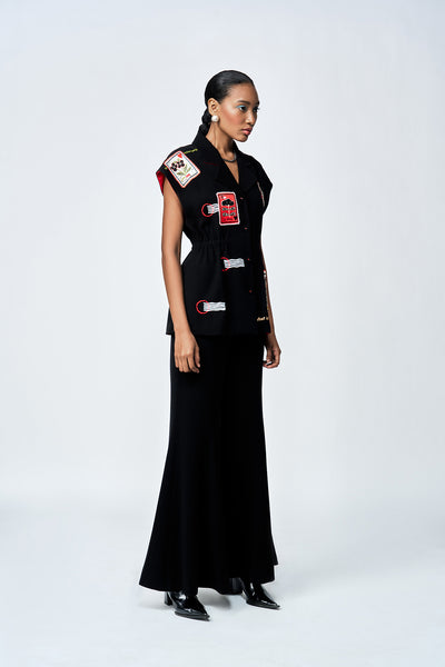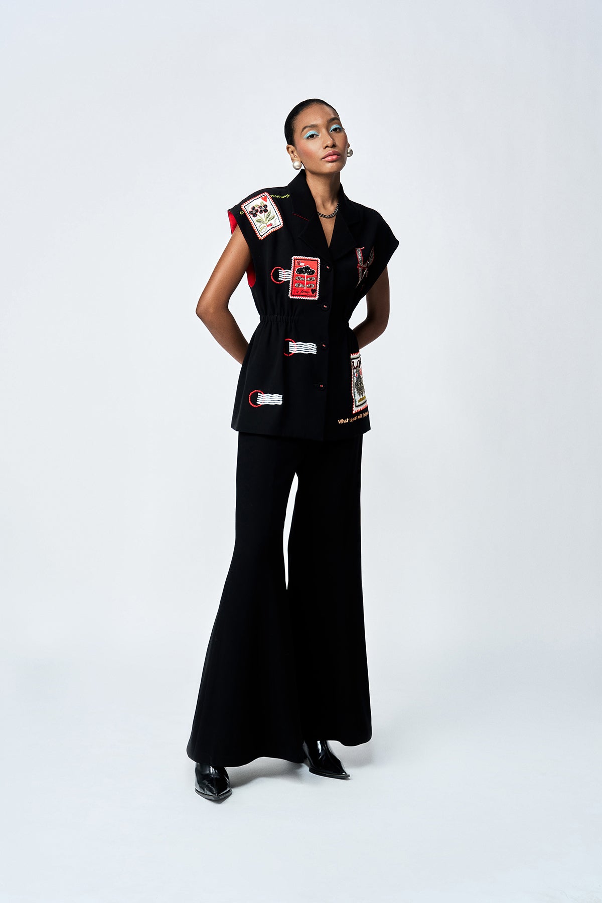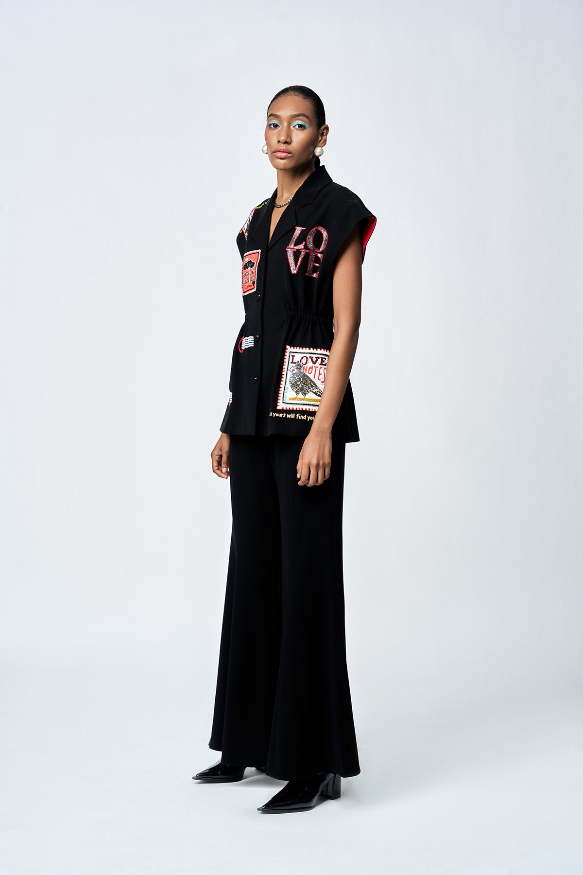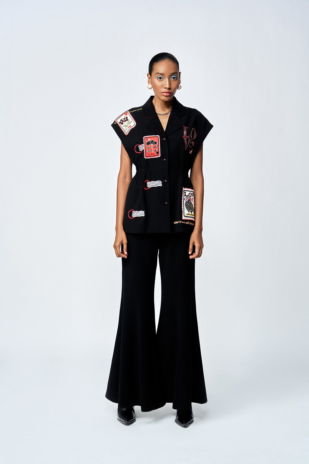 Robe jacket with embroidered satin stamp patches, and text, featuring a notch collar, elasticated waist, and fabric-covered buttons. It has contrast color facing under the armhole, waist elastic, and hem. Paired with matching bell-bottom pants.