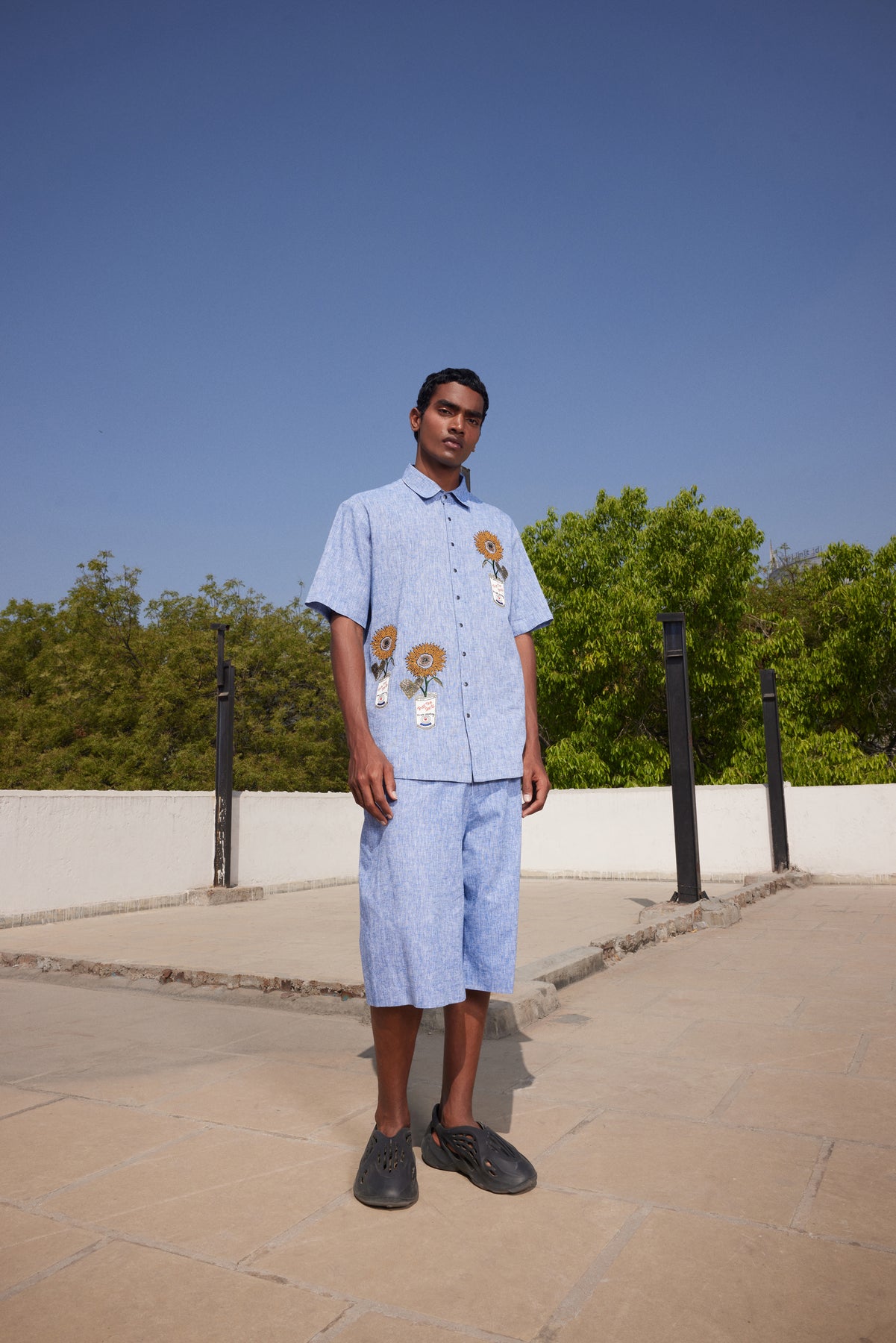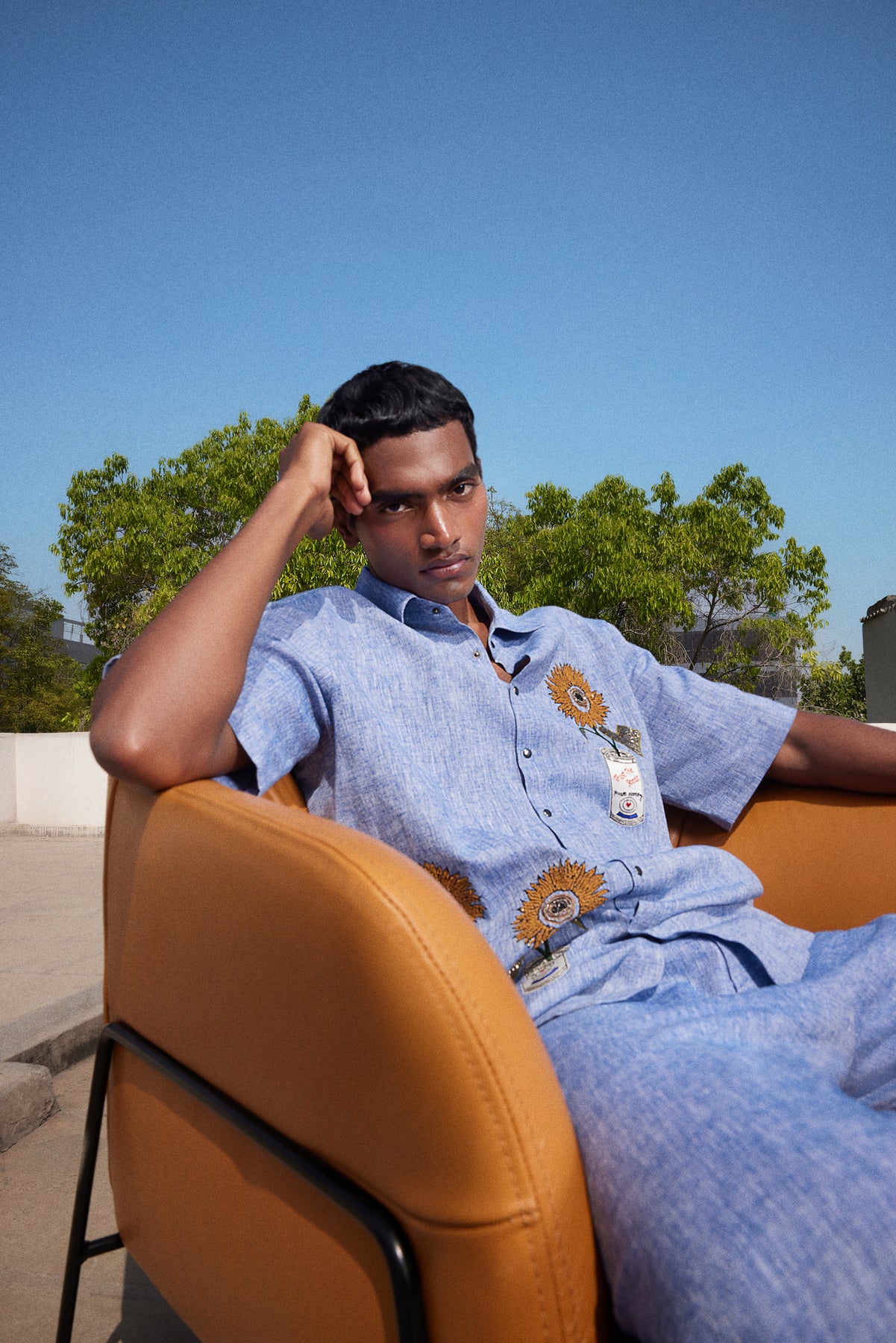 Half sleeves shirt with embroidery of Pop can with flower. It has collar, metal snap buttons. It also has top stitching detail.