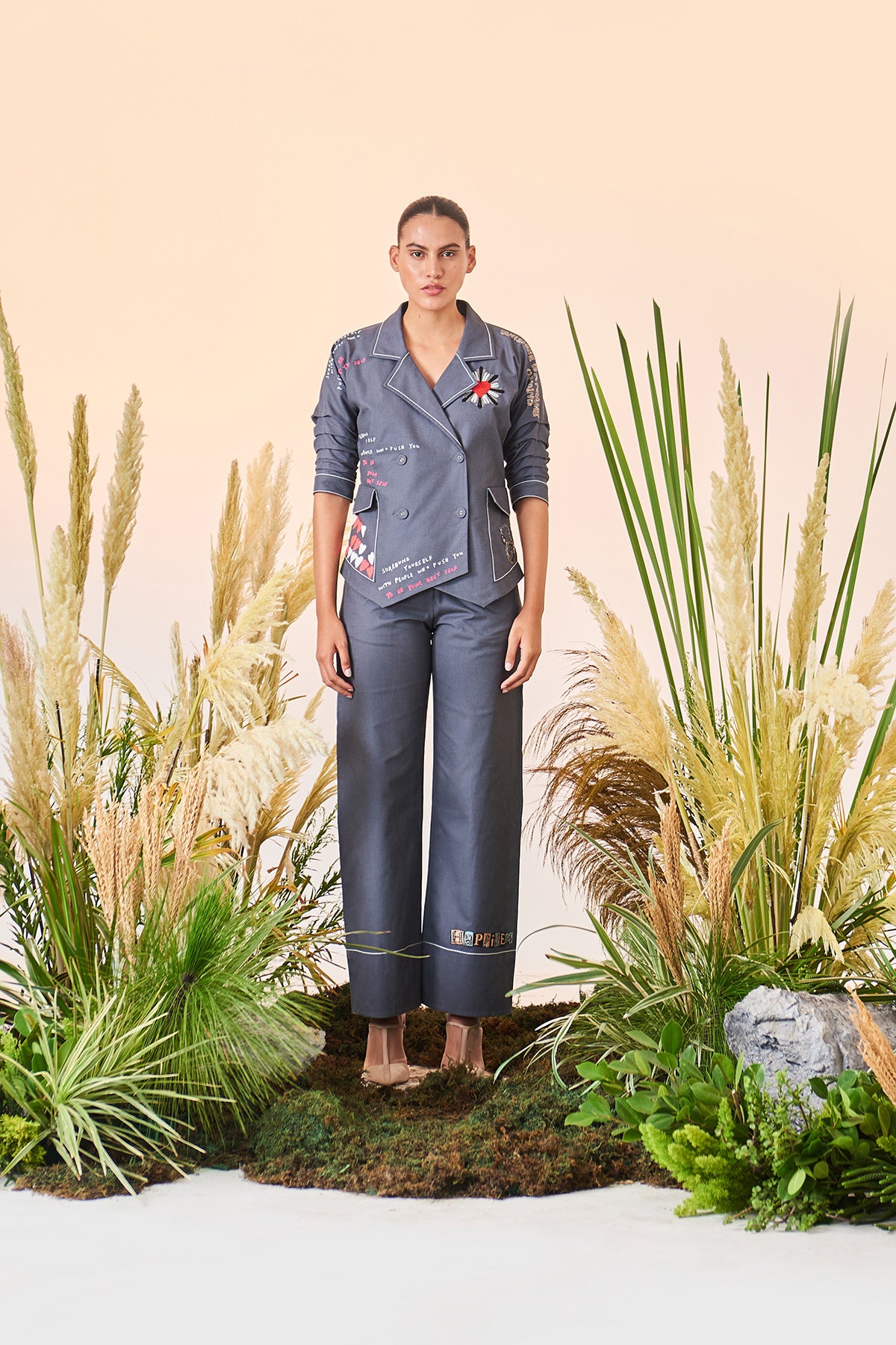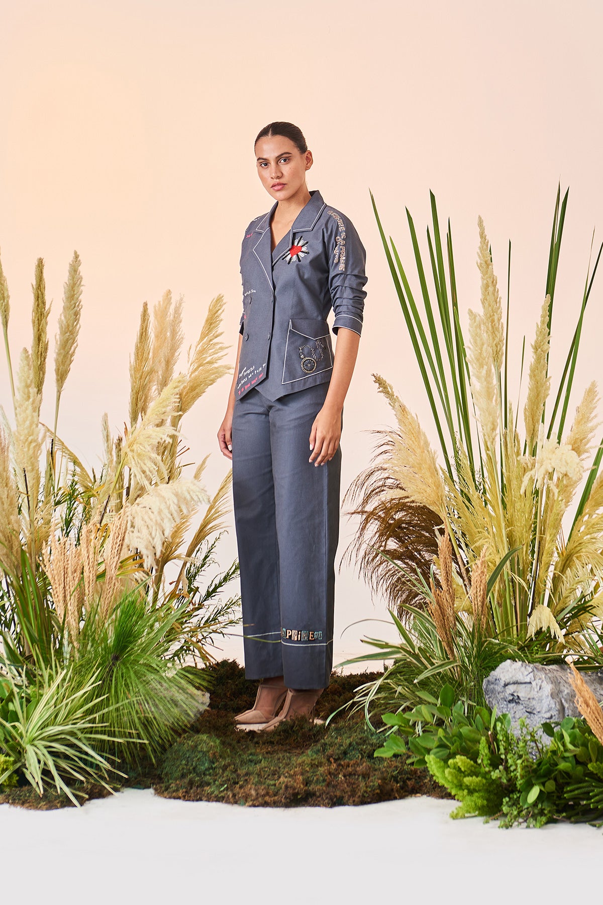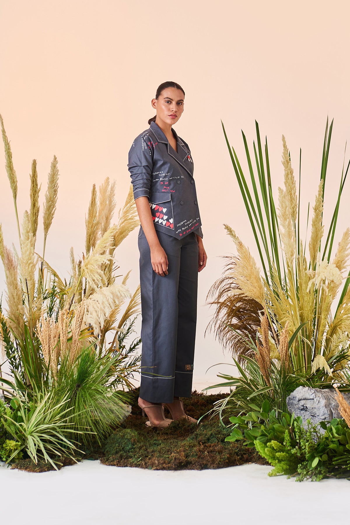 Waist coat jacket with funky motifs like blinking heart, texts, stars, pocket watch etc. The jacket has top stitching details, fabric covered buttons, pockets, and pleated dolman sleeves.