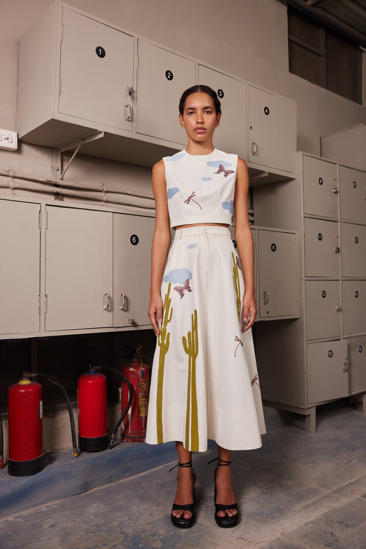 Crop top with embroidery of Cactus. It features side and back concealed zip openings.