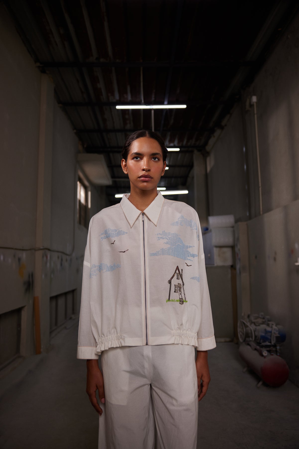 Shacket with intricate hand-embroidery of Outhouse. It features a front metal zip opening with collar and an elasticated hem. It is paired with matching side-elastic pants.