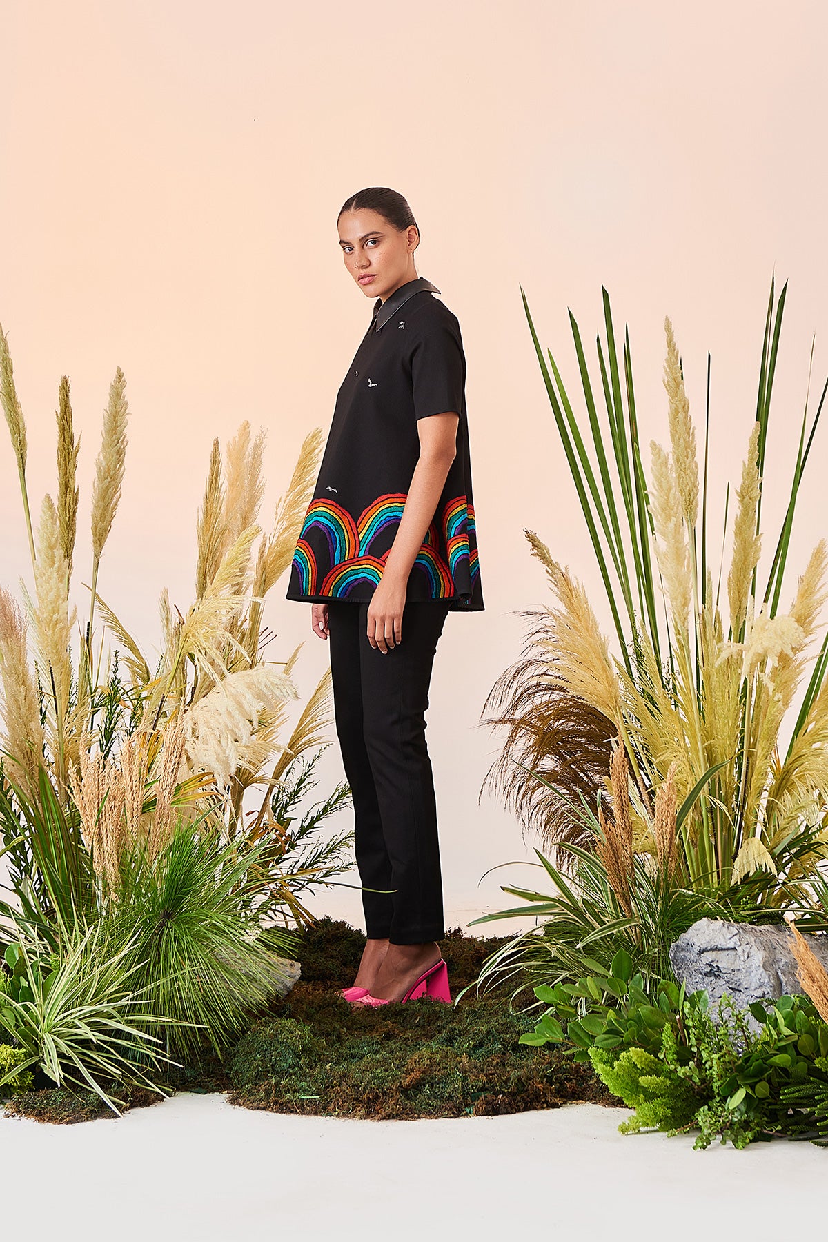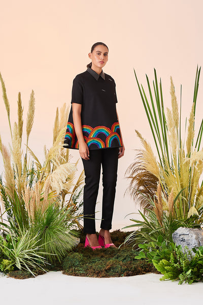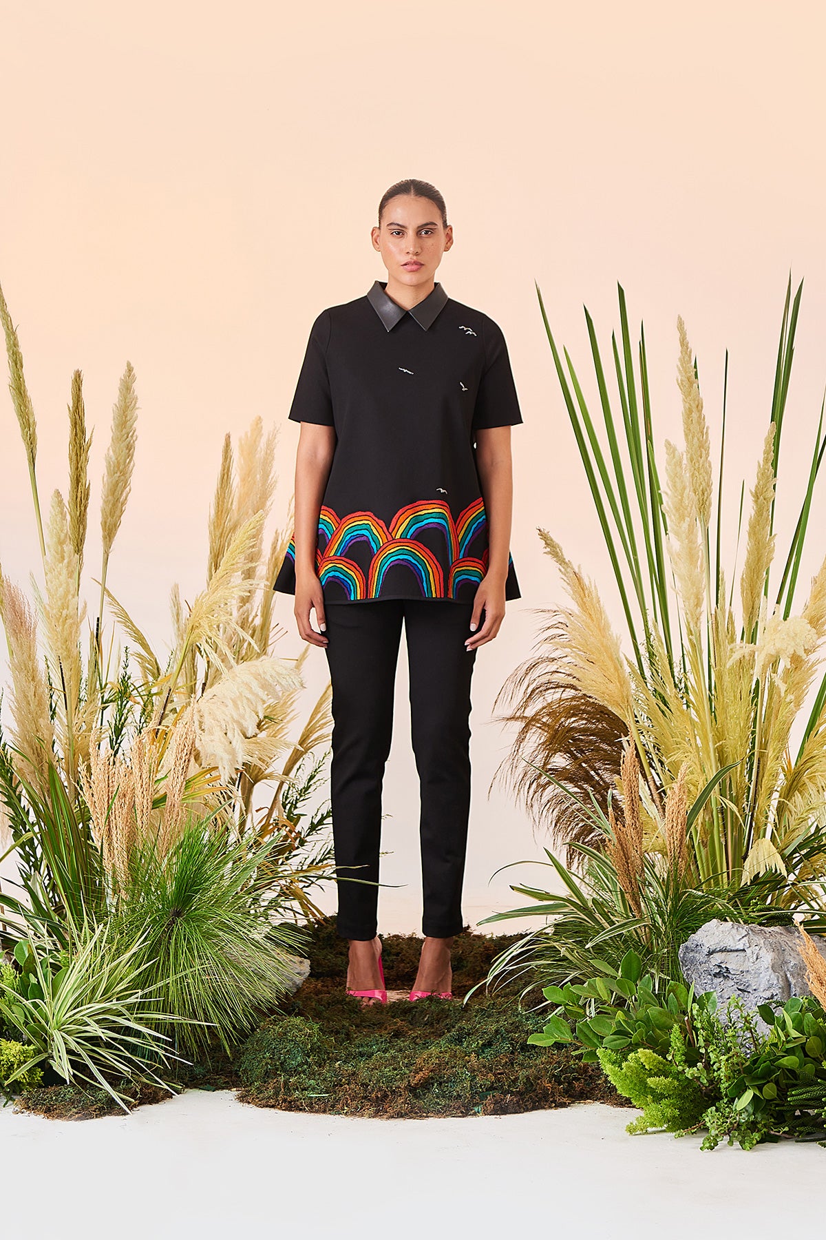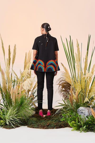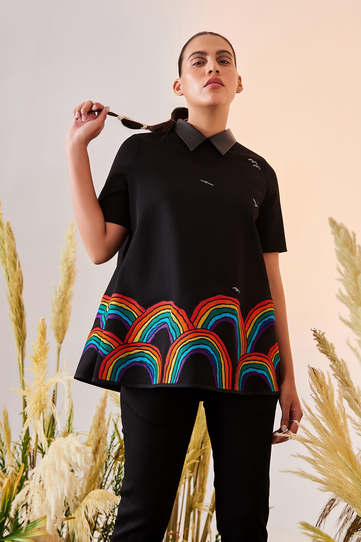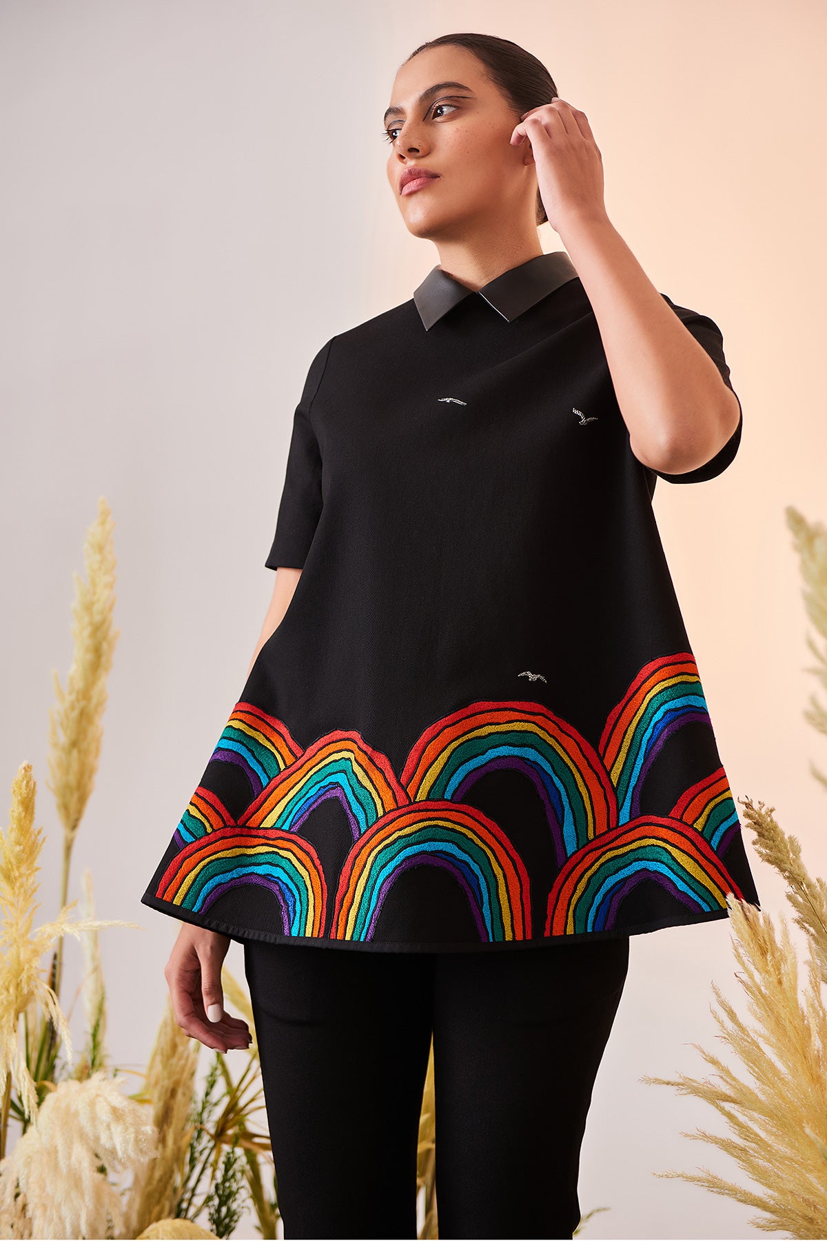 Flared top with rainbow and birds embroidery.The garment has leather collar, half sleeves and concealed zip at the back.
