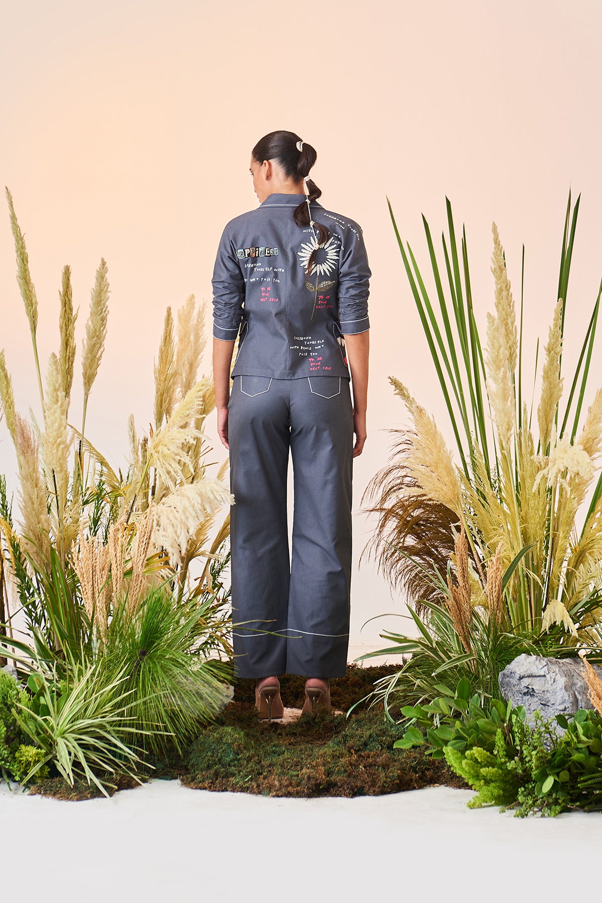 Pants with embroidery on one side at the bottom, has top stitching detail, a patch pocket at the back and has side pockets.