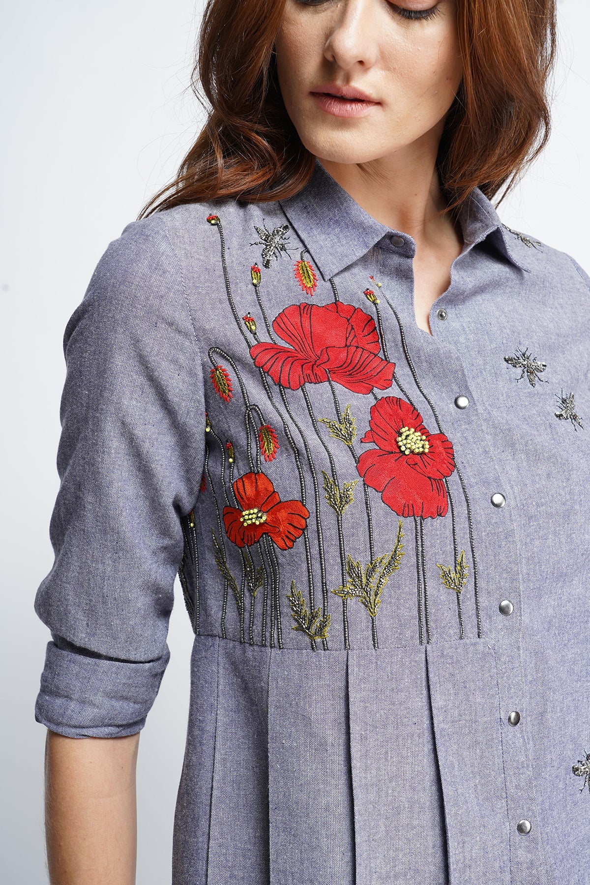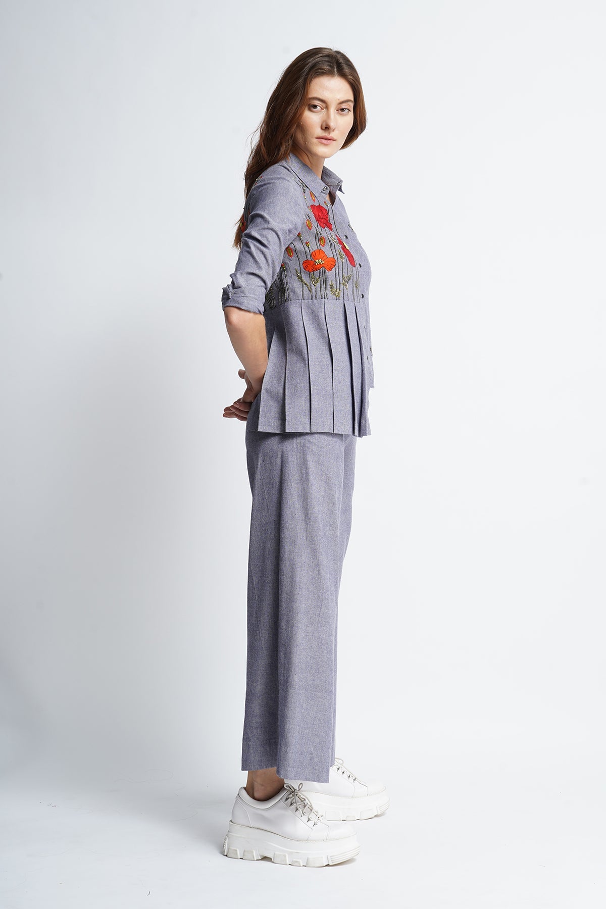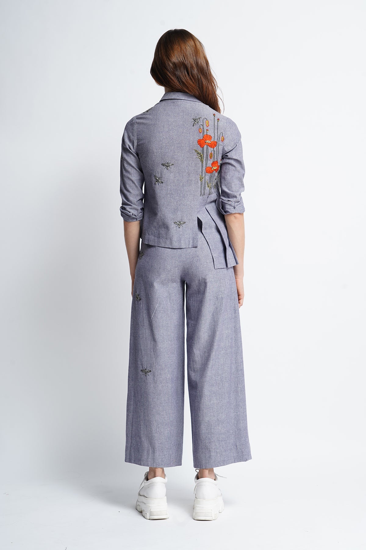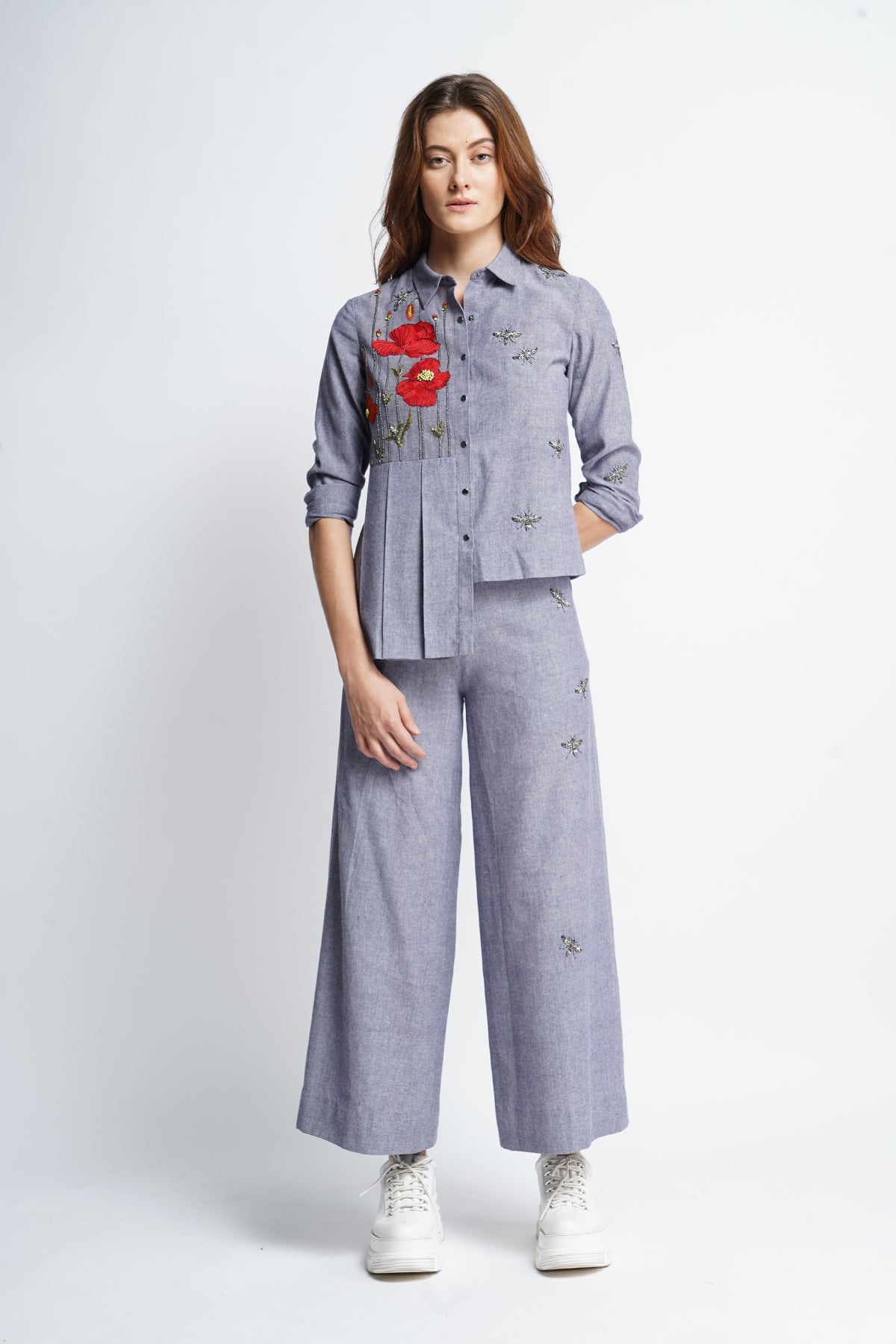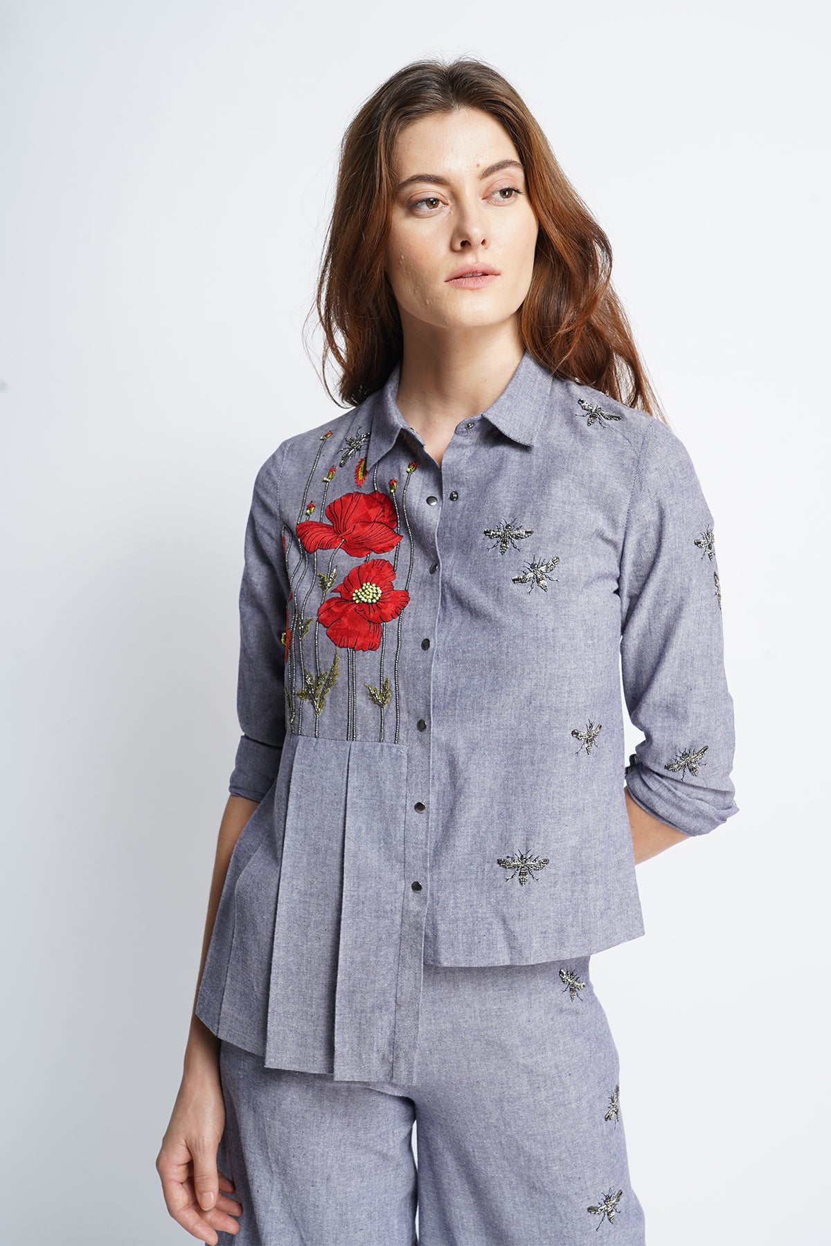 Side pleated shirt with poppy flowers and bees embroidery. The garment has cuff, collar , knife pleat and snap buttons. Its paired with flared pants with bees embroidery.