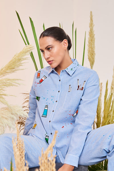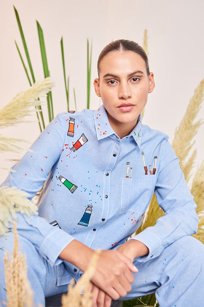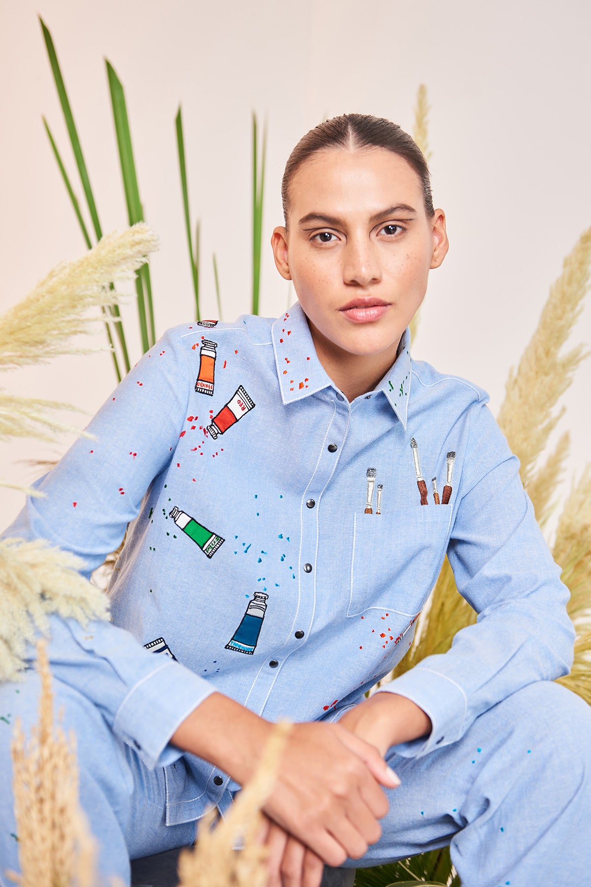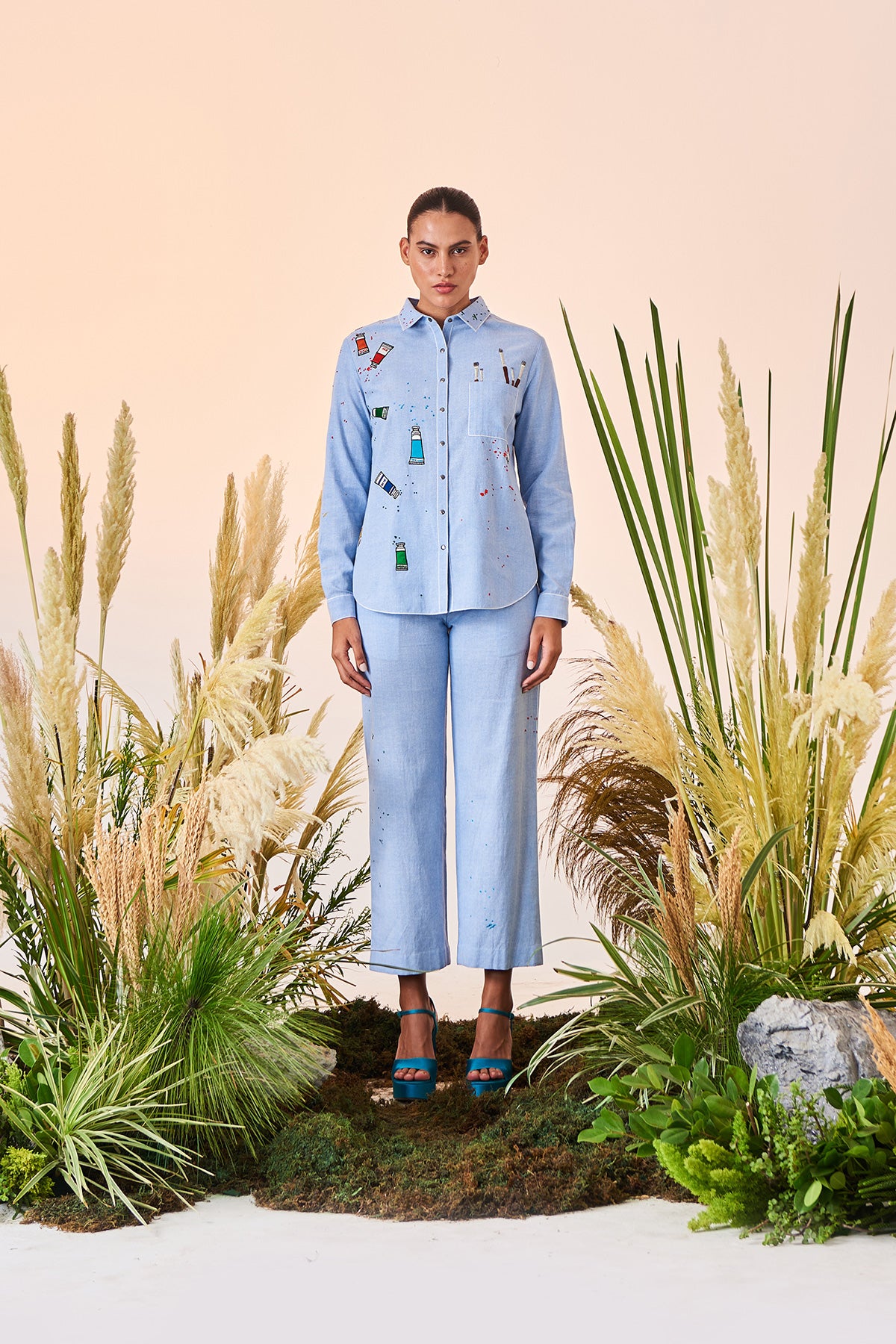 Chambray straight pant with paint splash embroidery. The garment has side pockets and top stitching on side seams.