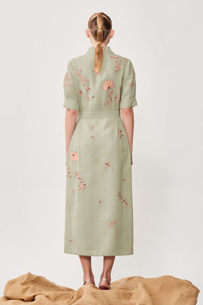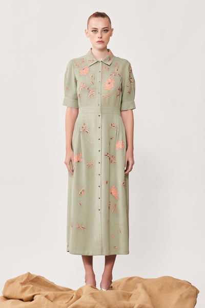 Shirt Dress With Abstract Rose Embroidery. The Garment Has Pleats,collar, Cuffs and Snap Buttons Placket With Top Stitching Detailing.