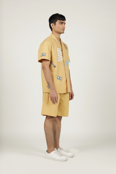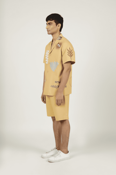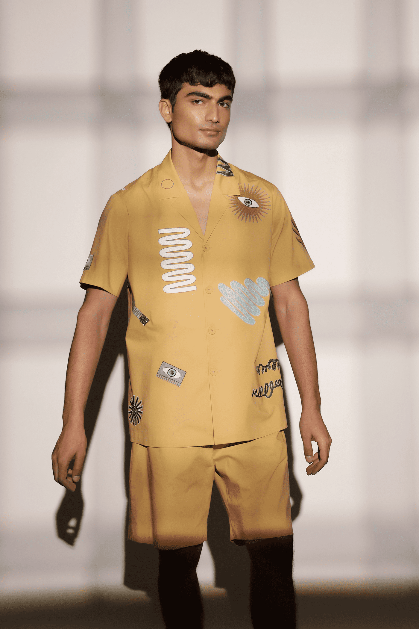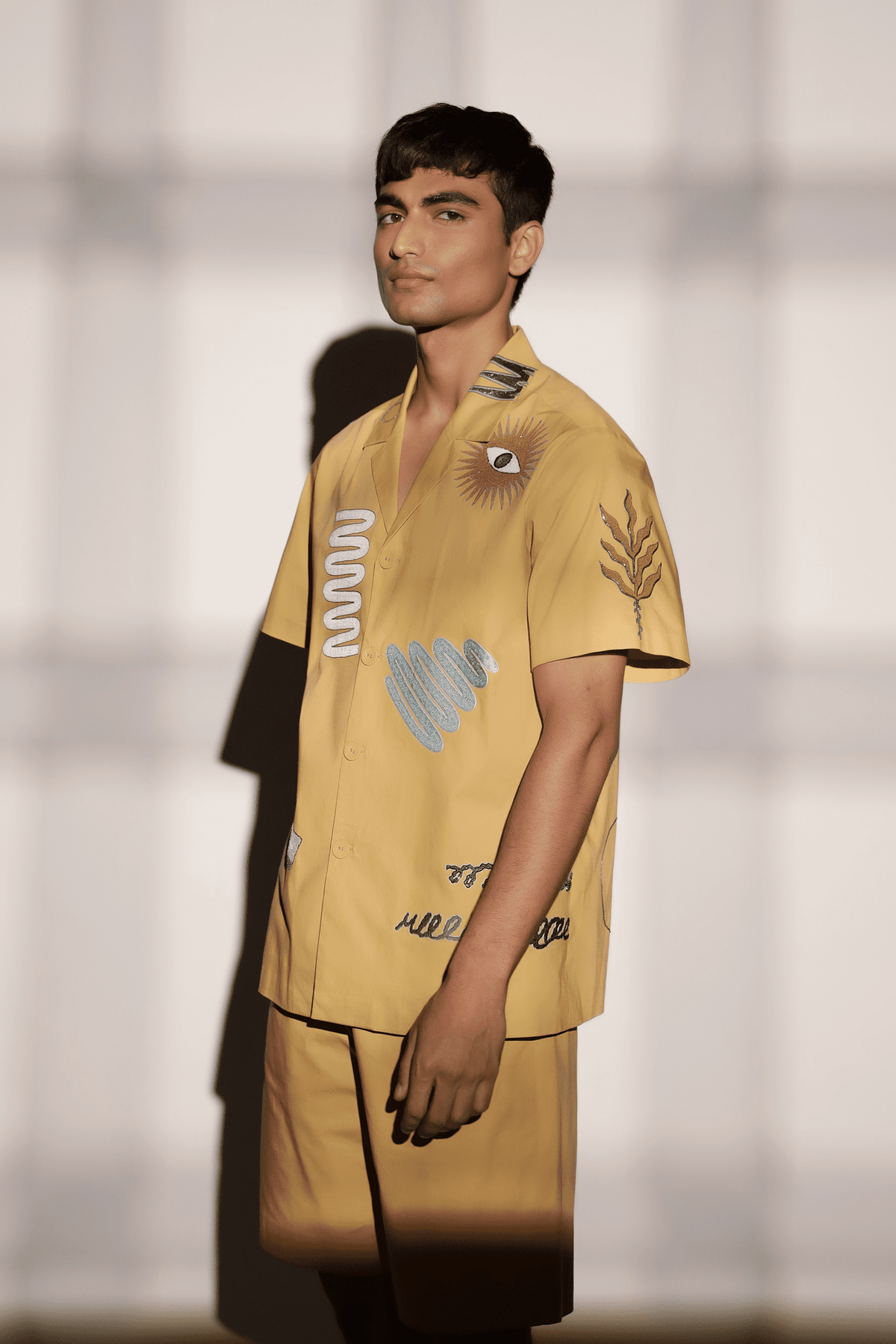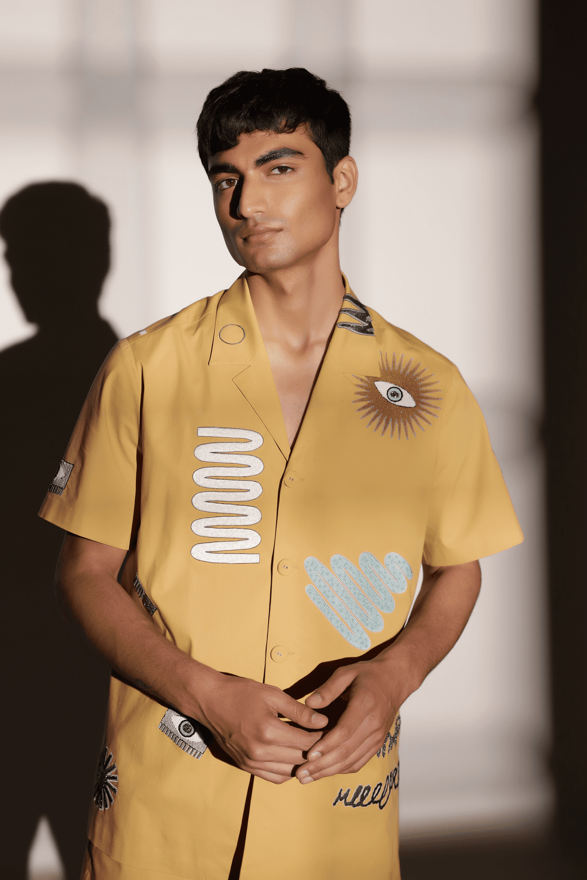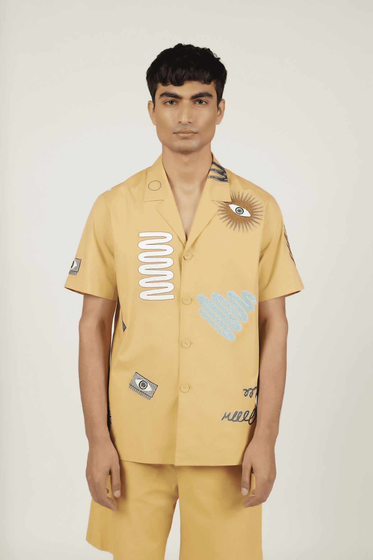 Abstract shapes shirt with interesting shapes embroidery. The garment has collar, fabric covered buttons. It also has a top stitching on back yoke.