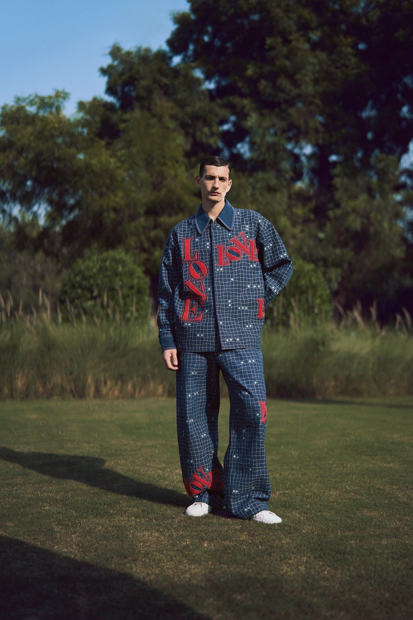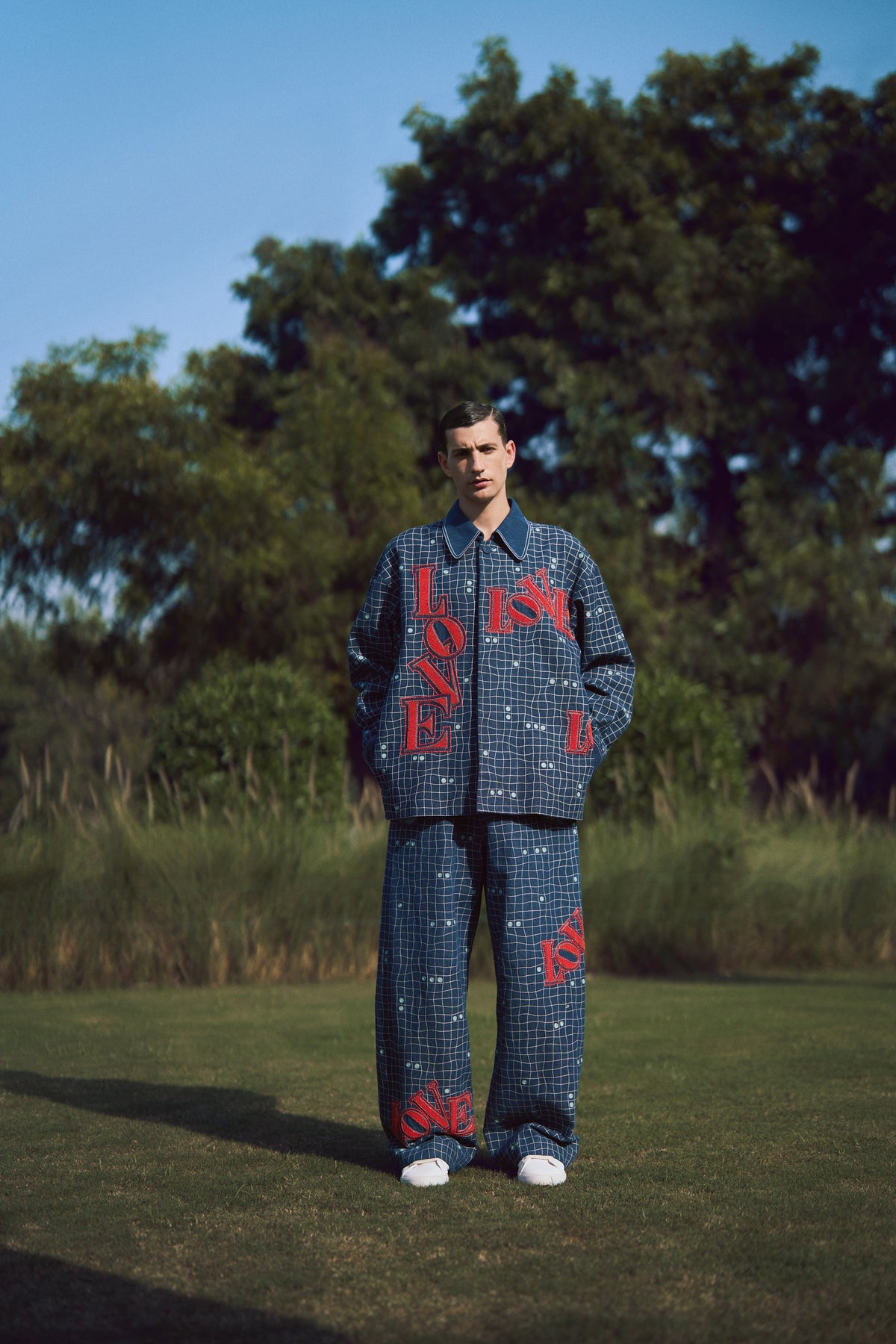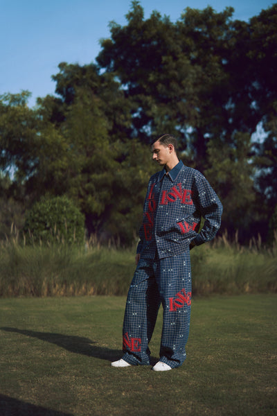 Baggy pants with embroidered checks and text. It has front zip opening, fabric covered button, top stitching detail and front cross pockets.