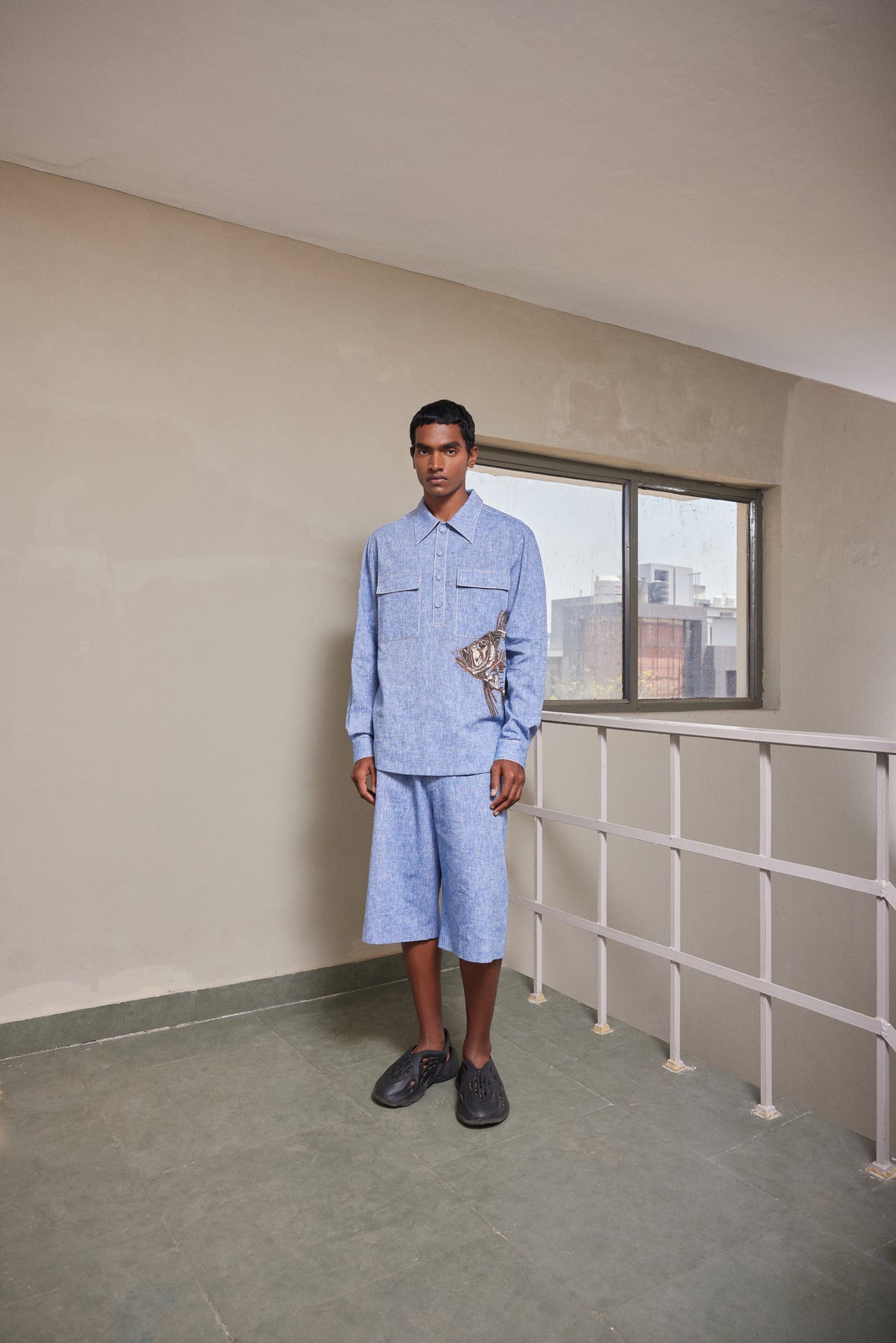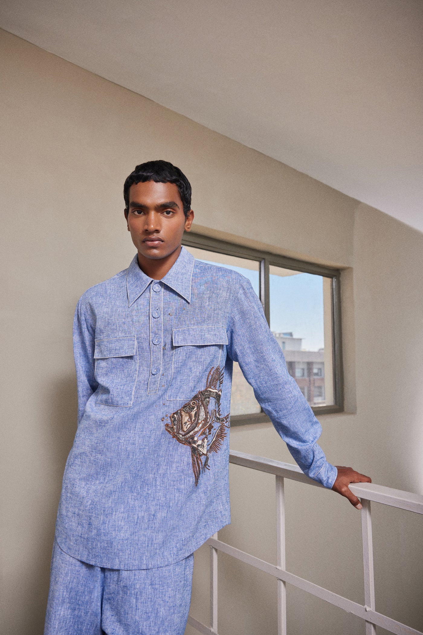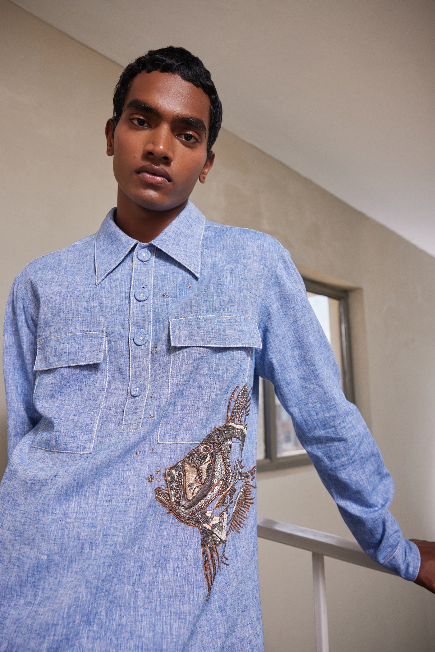 Full sleeve shirt with intricate hand-embroidered Big Fish. It has collar, half placket with fabric covered buttons and flap chest pockets. It also has top stitching details.
