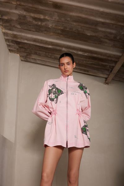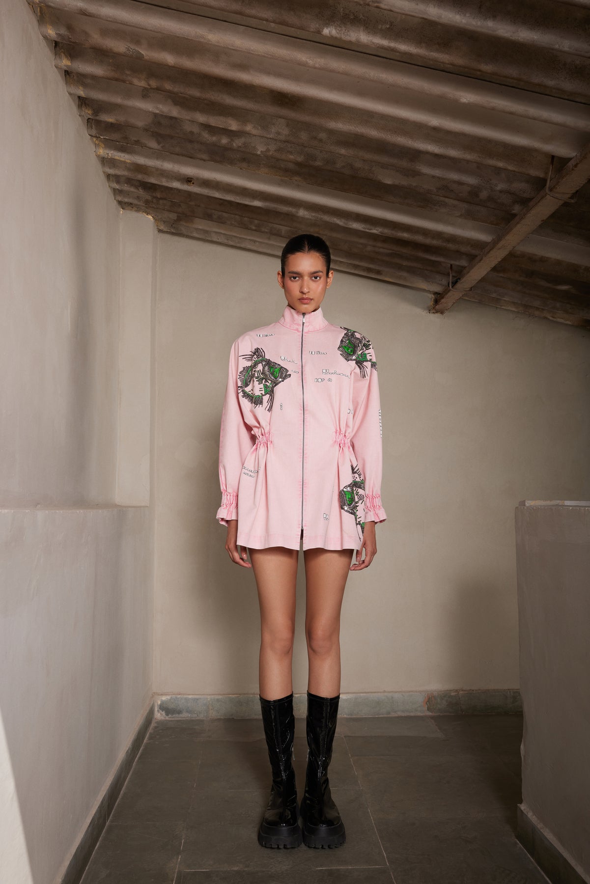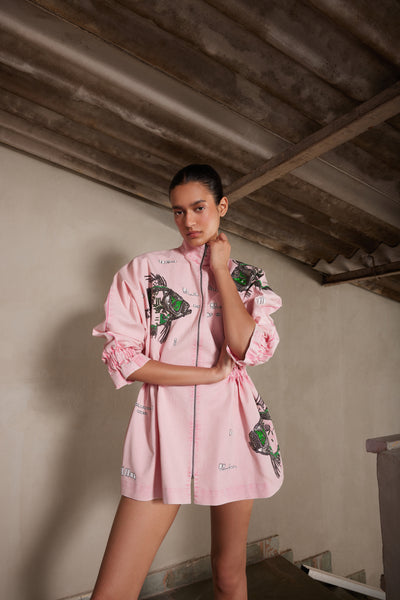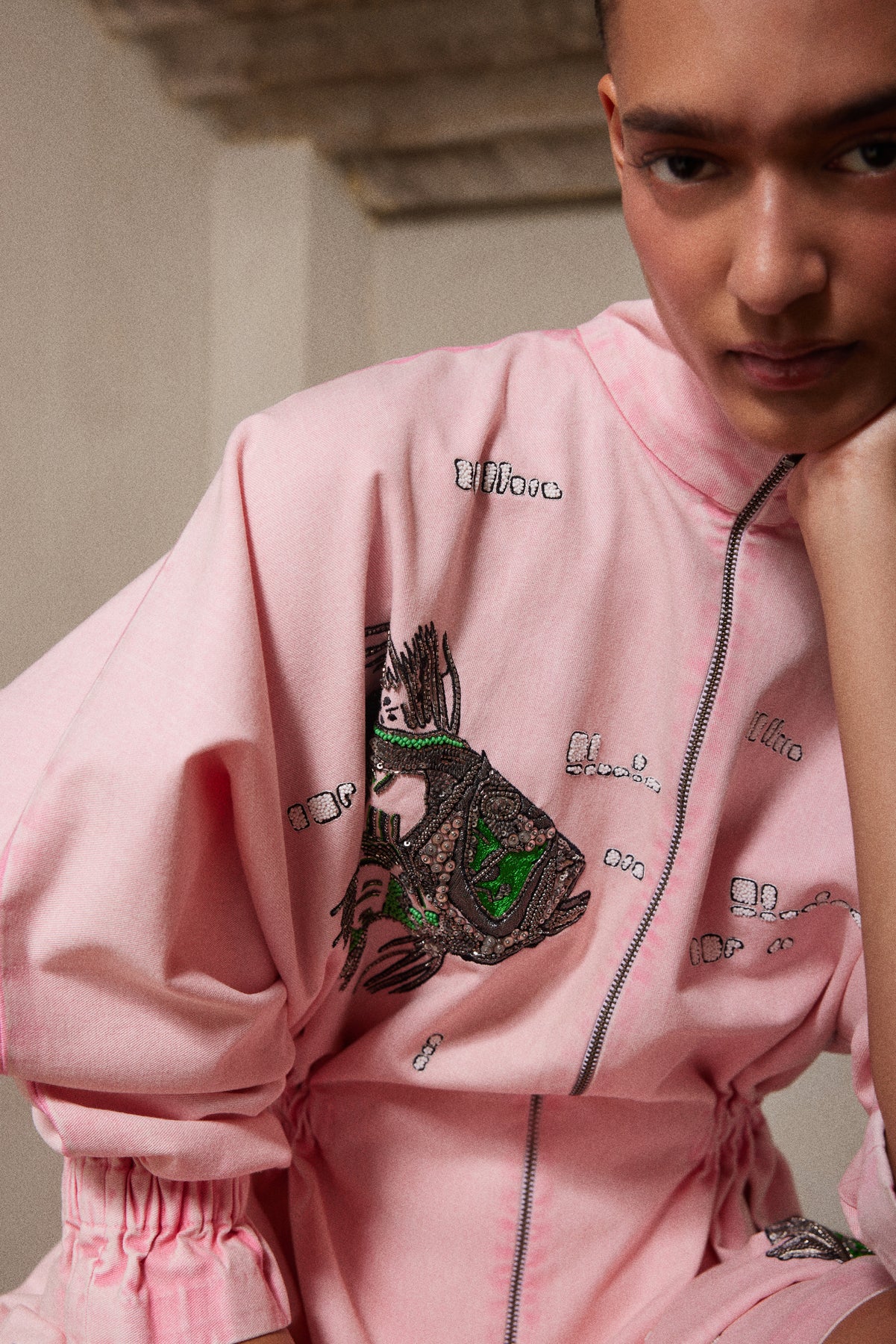 Jacket dress with hand-embroidered Big Fish. It features full sleeves with elasticated cuffs, a partially elasticated waist, and a front metal zip opening.