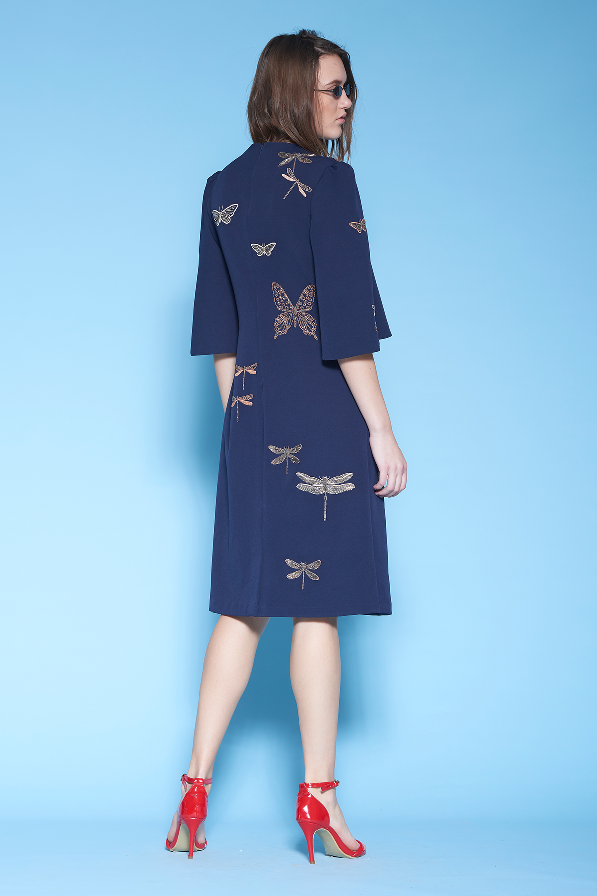 Midi dress with butterfly embroidery. The dress has back concealed zip, side pockets and gathers on sleeves.