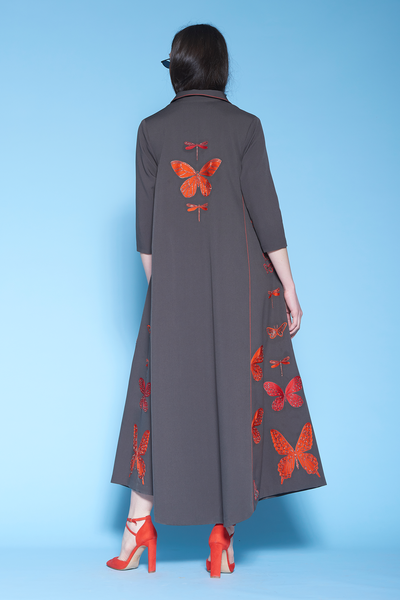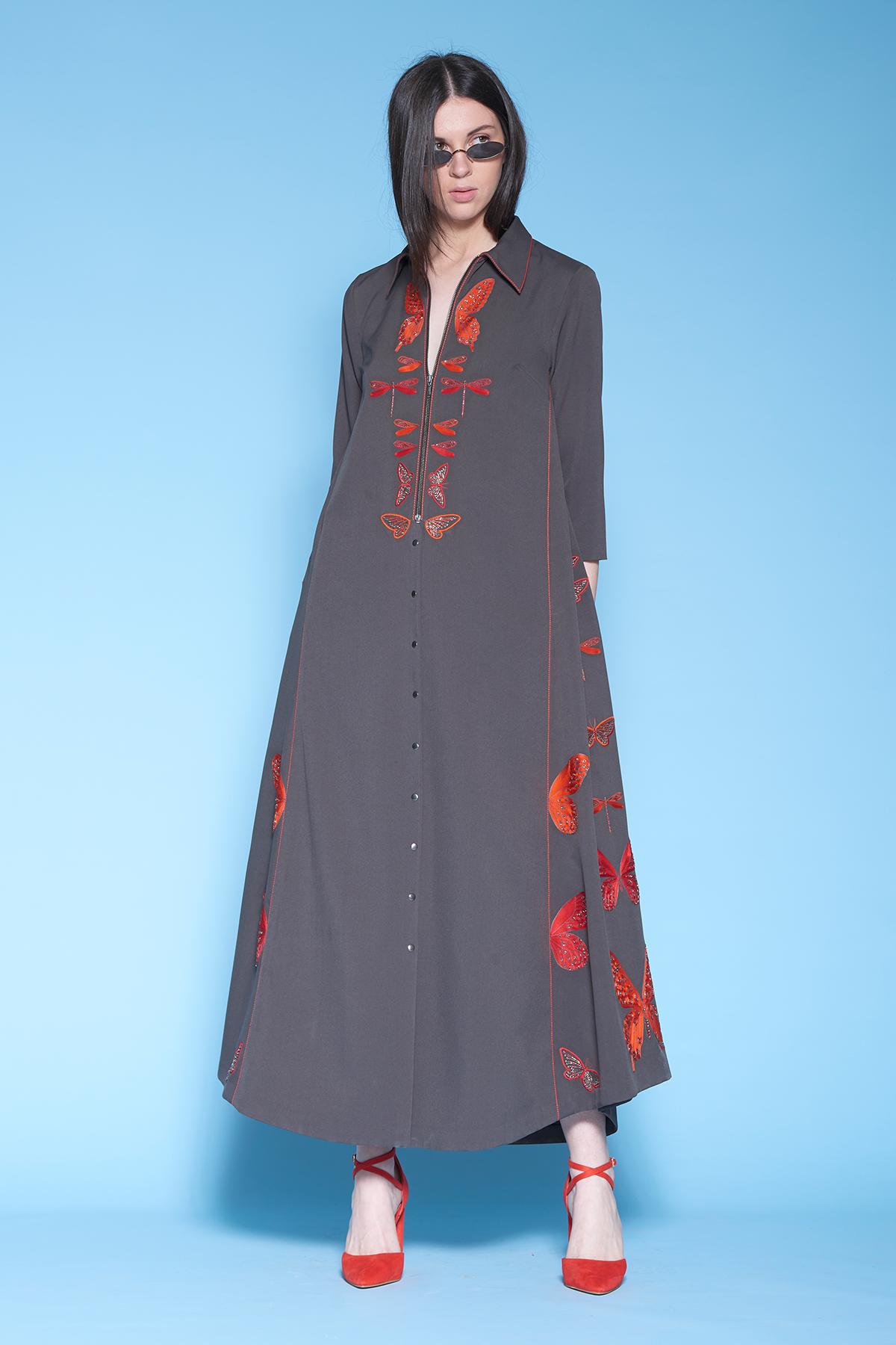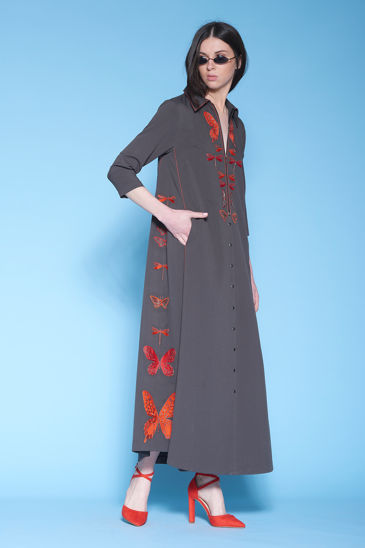 Embroidered butterflies long side triangle shirt dress with top stitching details and pockets. The garment has partial metal zipper and snap buttons.