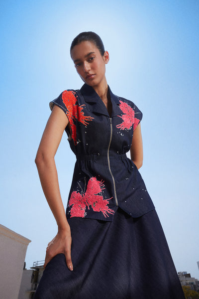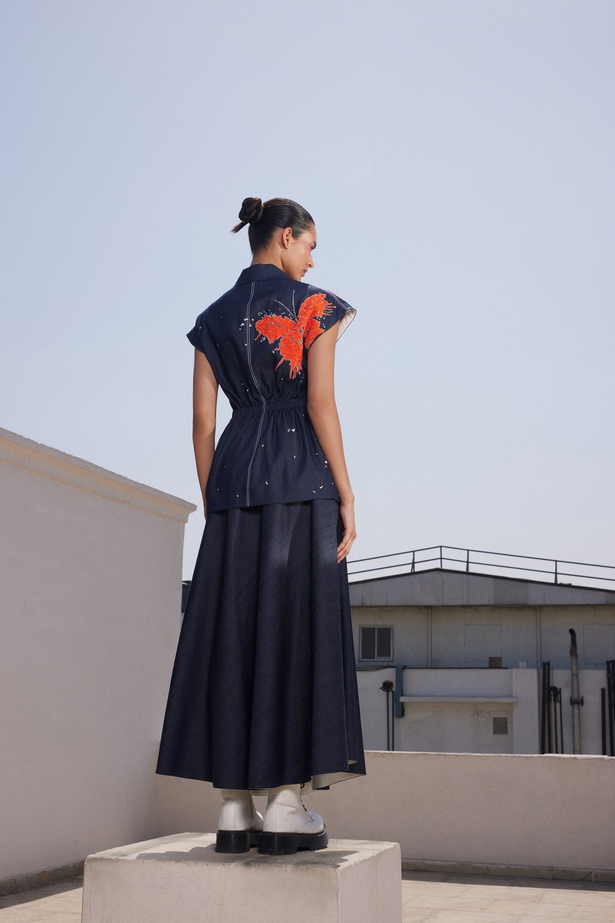 Robe jacket with hand-embroidered Butterfly Splashes. It features a notch collar, elasticated waist, front metal zip opening, and contrast colour facing under the armholes. Paired with matching circular skirt.