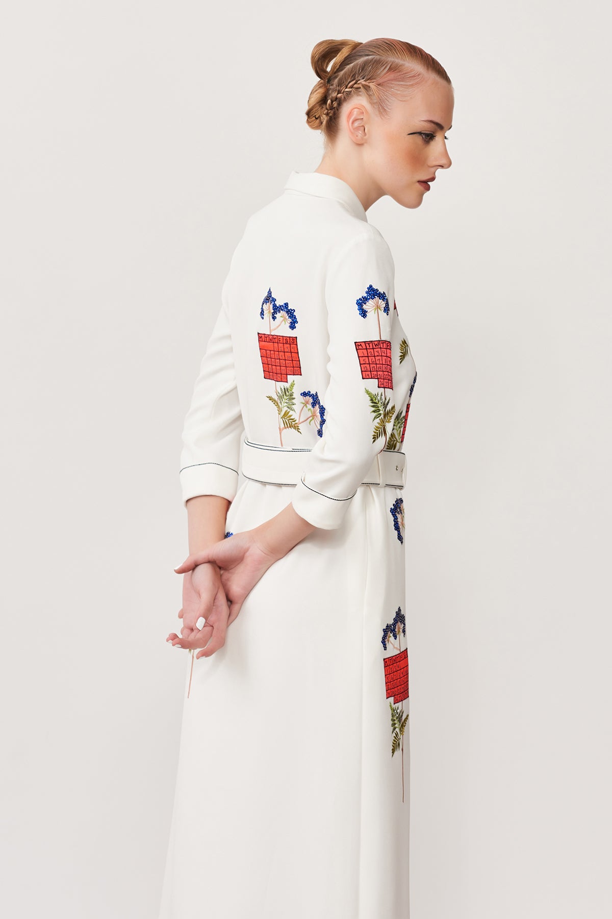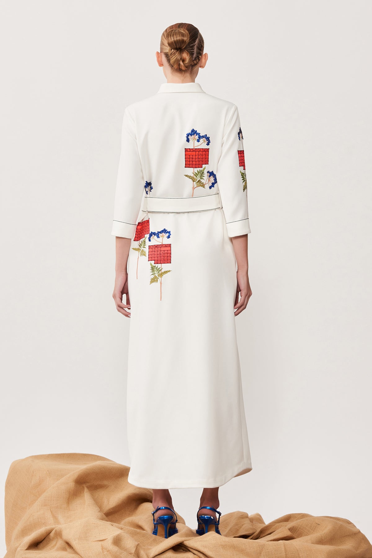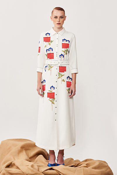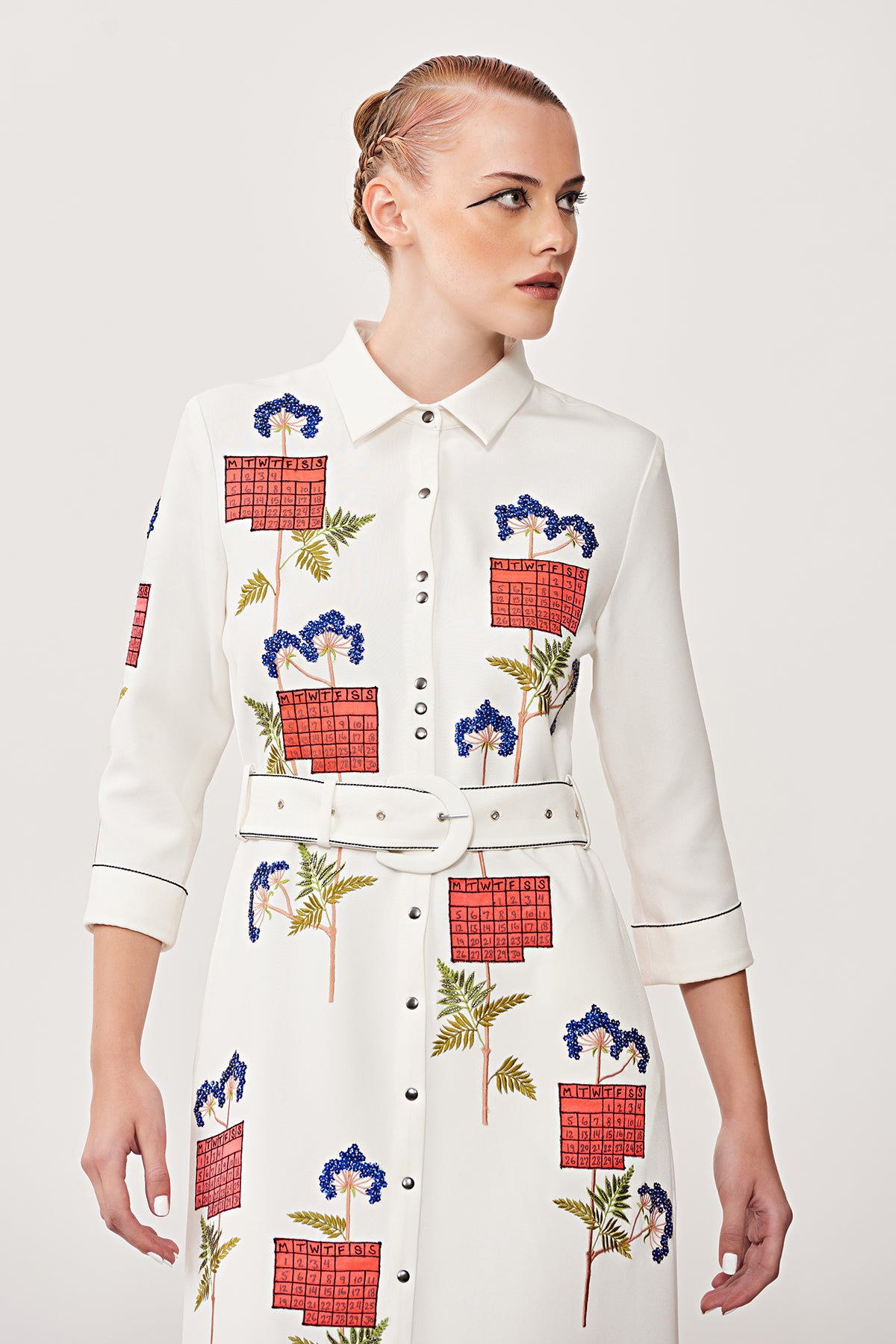 Long Shirt Dress With Intricate Calender Embroidery. The Garment Has Collar, Side Pockets, Snap Buttons, Turnup on Sleeves and Seperate Buckle Belt With Top Stitching Detail.