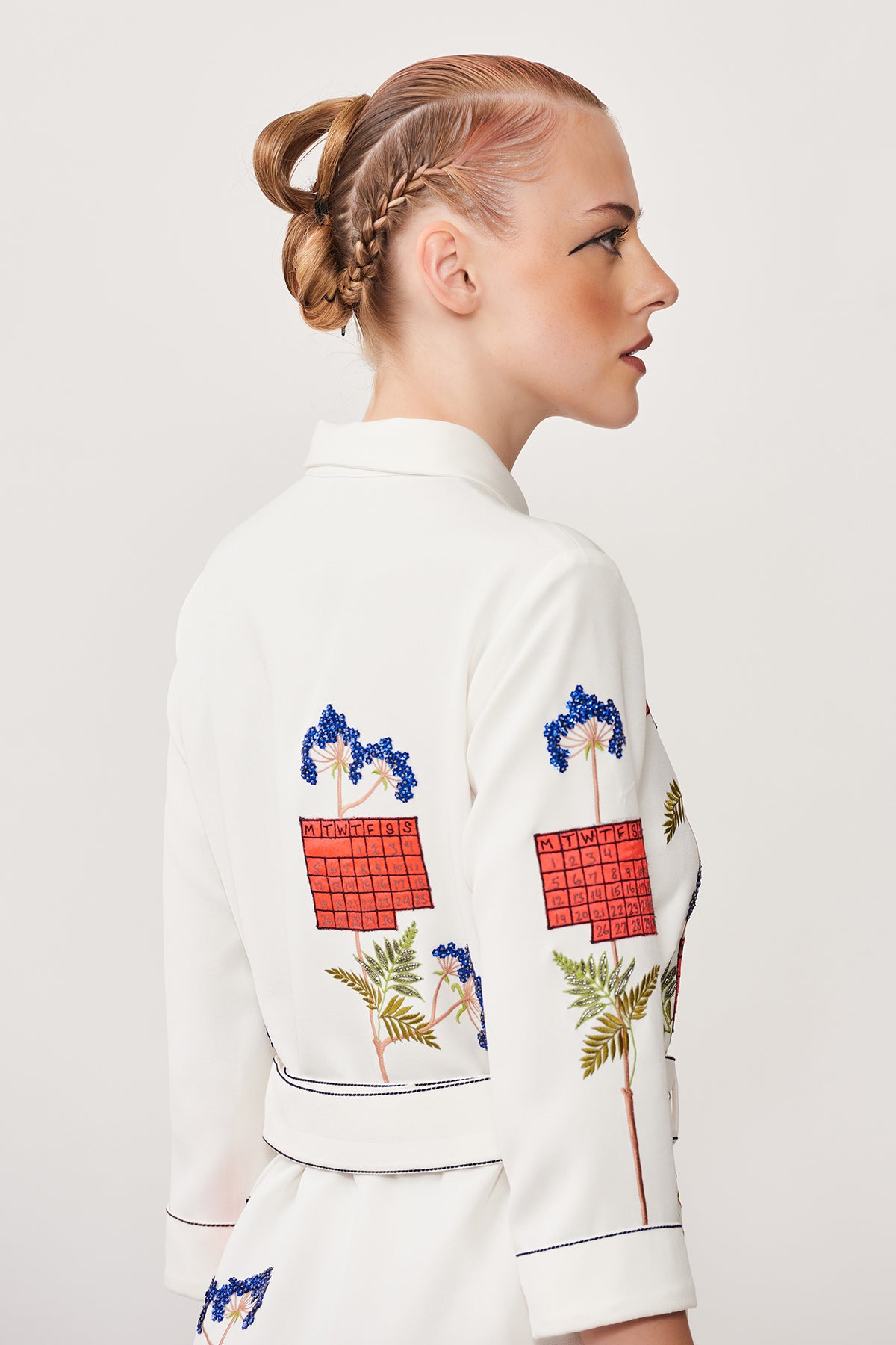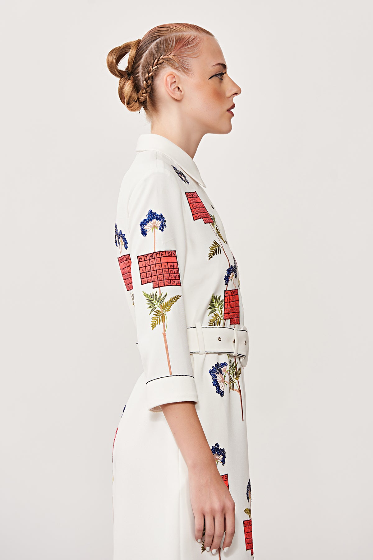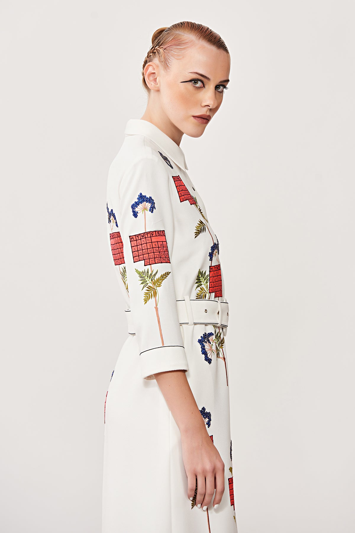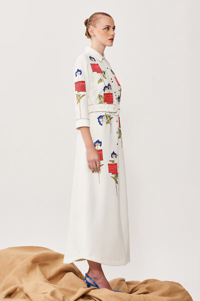Long Shirt Dress With Intricate Calender Embroidery. The Garment Has Collar, Side Pockets, Snap Buttons, Turnup on Sleeves and Seperate Buckle Belt With Top Stitching Detail.