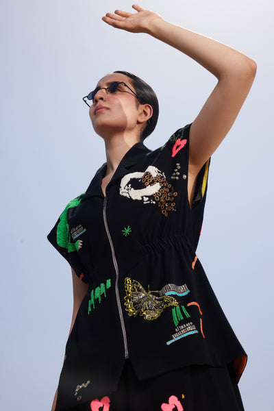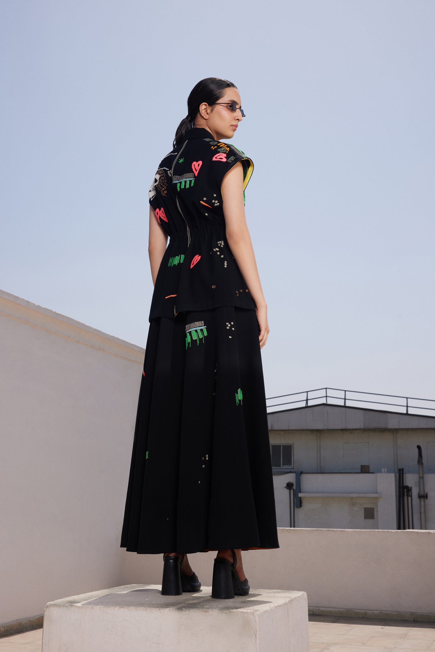Embroidered circular skirt with a side concealed zip opening and pocket detailing.