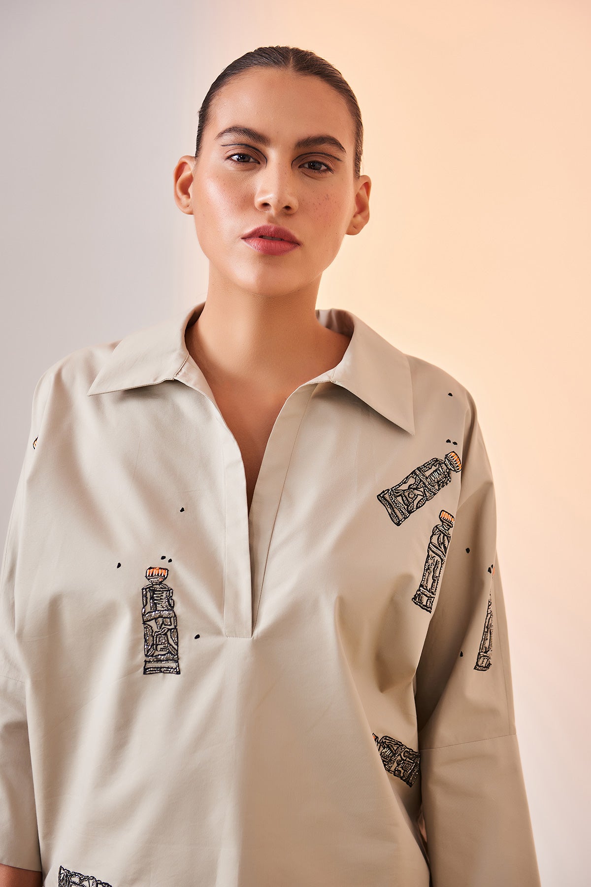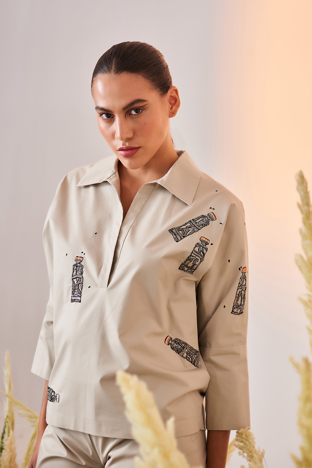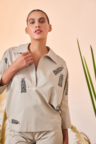 Top with paint tubes embroidery. It is paired with matching flared shorts.
