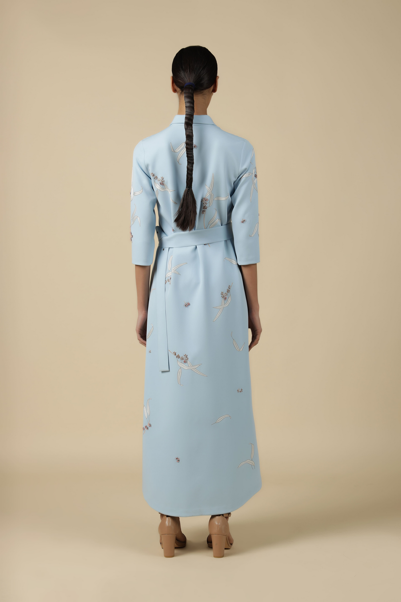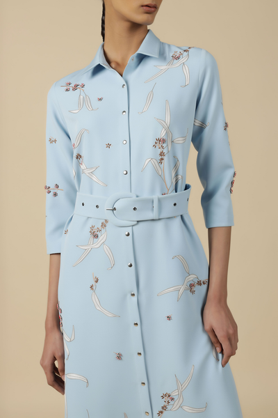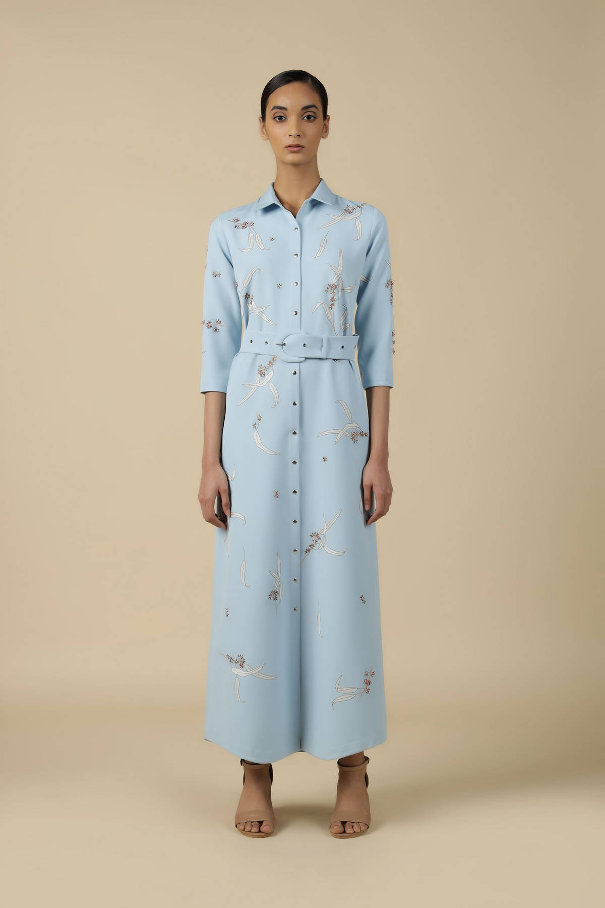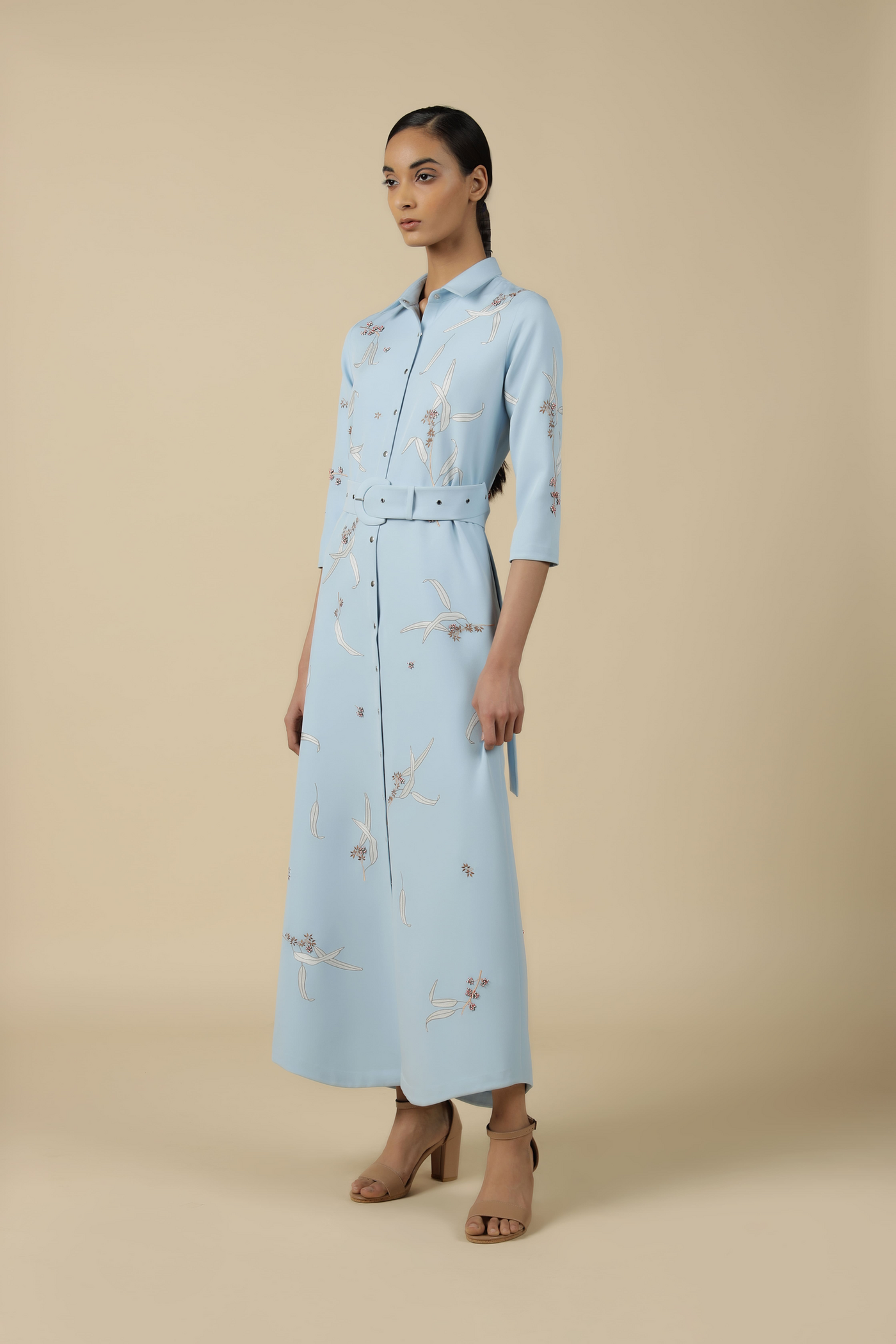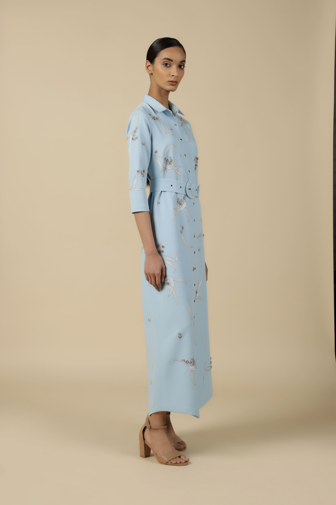 Long shirt dress with Eucalyptus leaf embroidery. It has Collar, Gun metal snap buttons and Side concealed pockets. The garment comes along with a "D" Buckle belt.