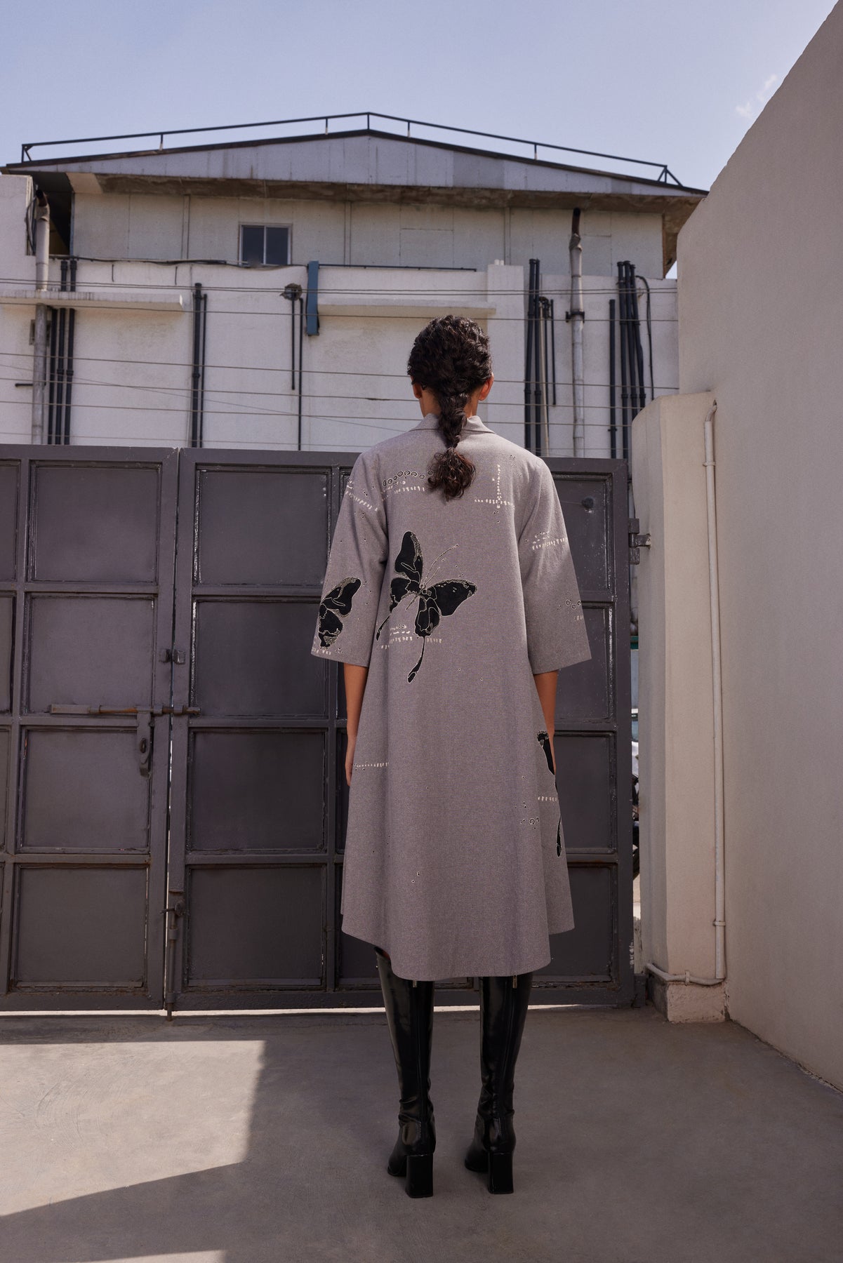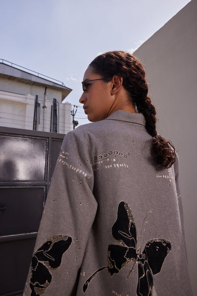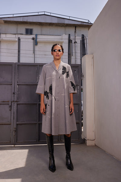 Shawl collar flared dress with embroidered fading butterfly. It features a shawl collar, fabric-covered buttons, and top stitching detail. Includes contrast colour facing under the sleeves and hemline.