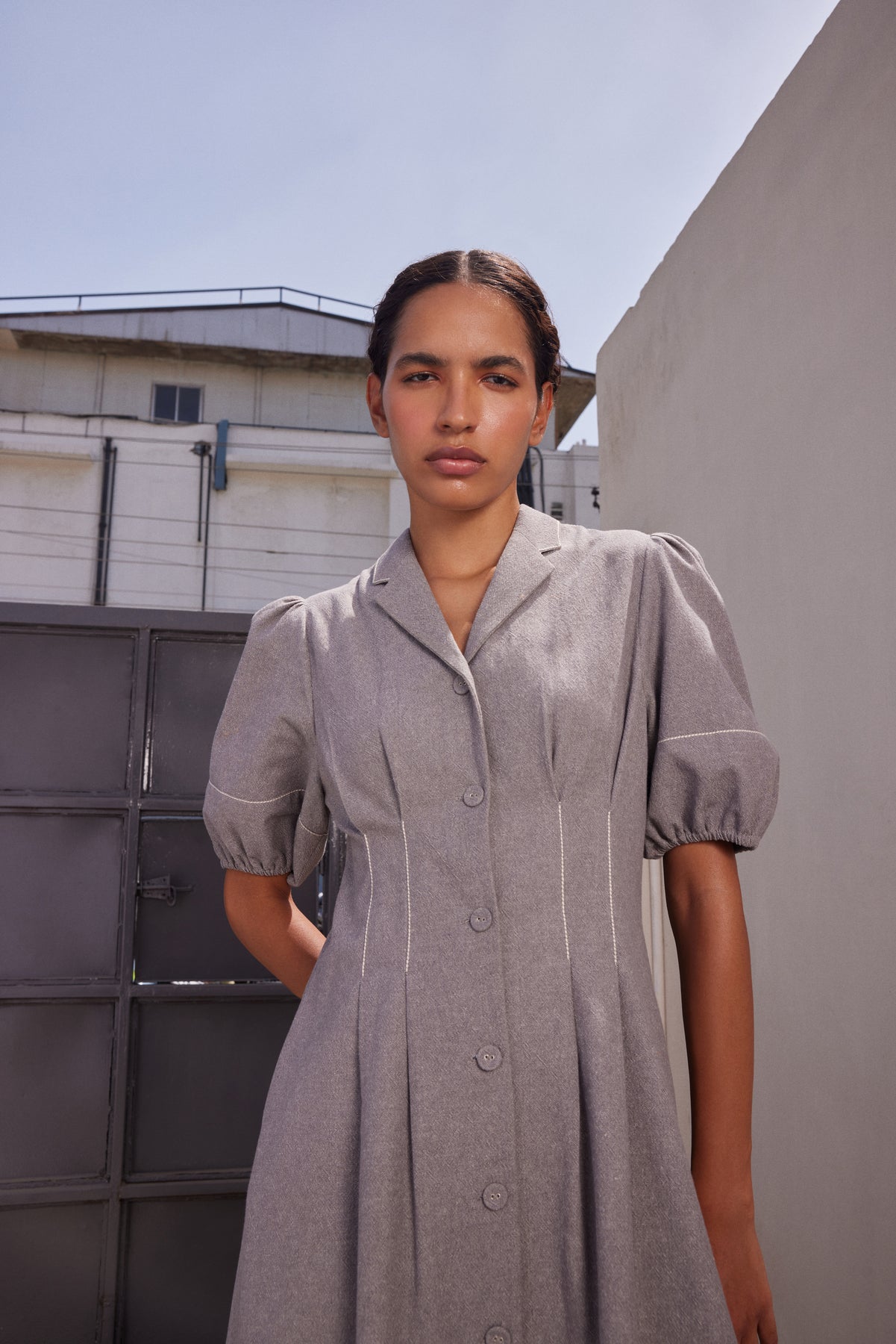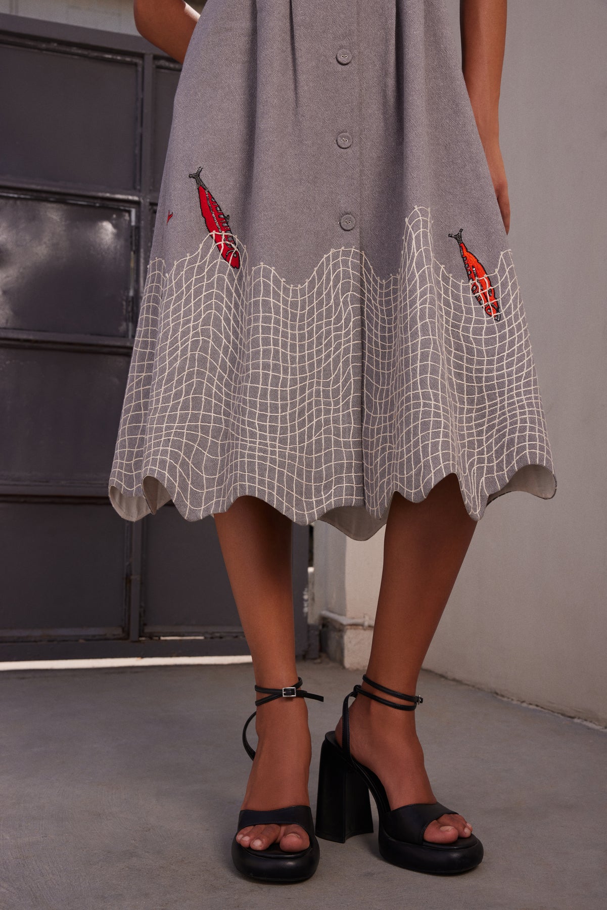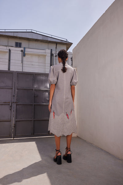 A waist-pleated flared dress with delicate hand embroidery of Fish in the Net. The front waist is detailed with pleats. It has fabric-covered buttons, top-stitching detail, elasticated sleeve hems, and front opening. It also has contrast color facing under the collar and hemline.