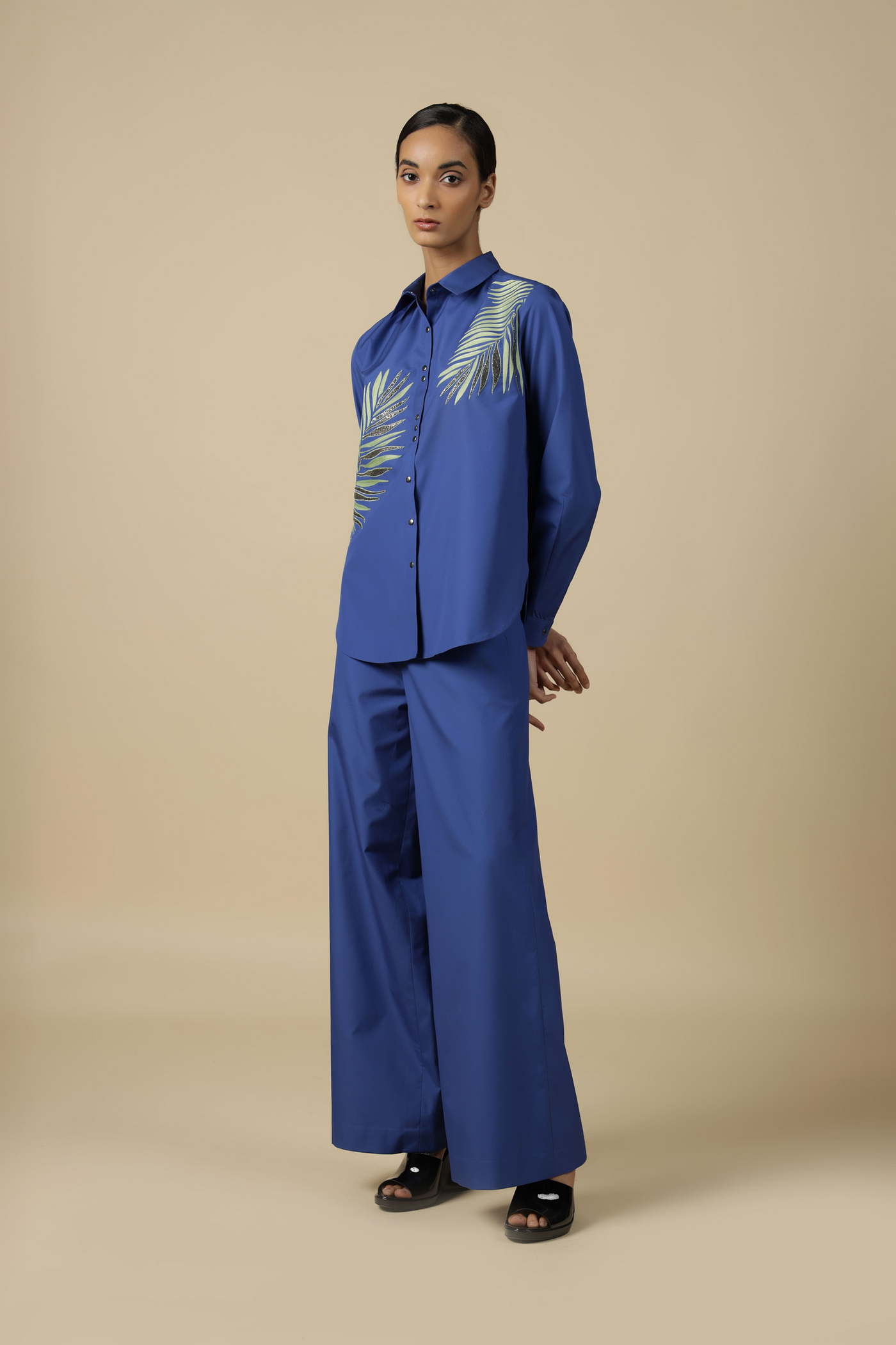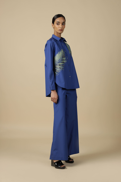 Flared pant with side conceal zip. It also has cross pockets.
