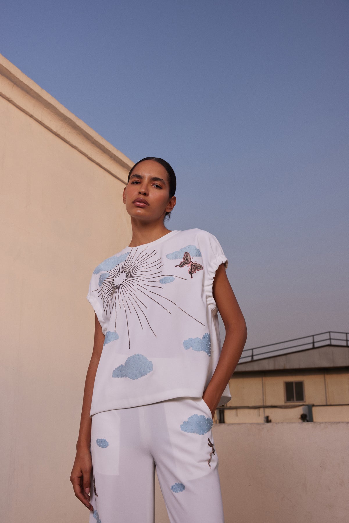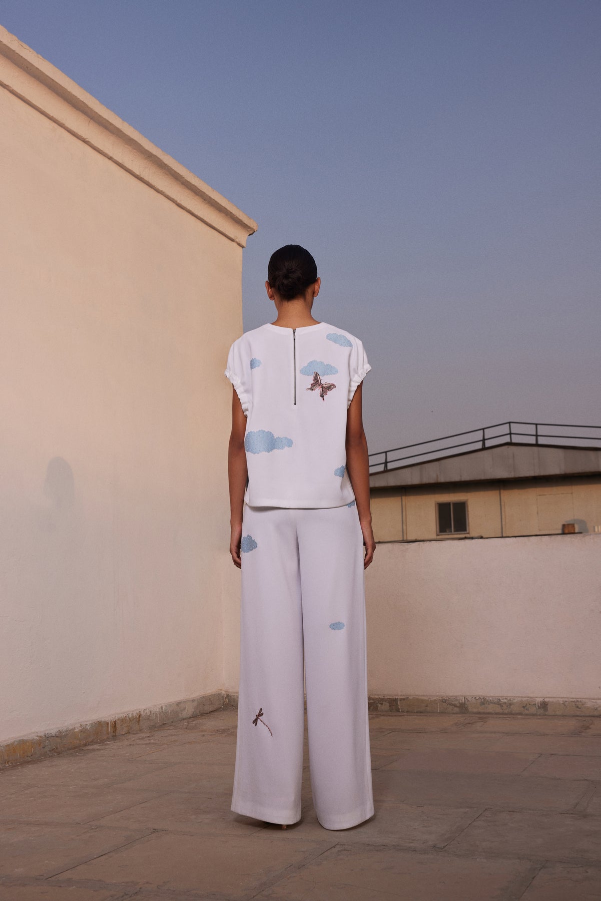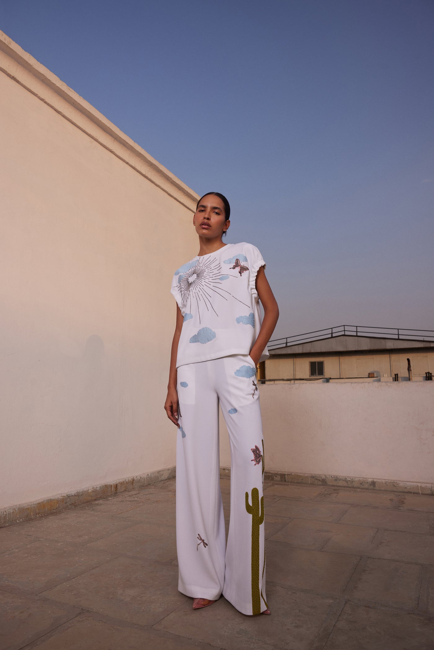 Flared pants featuring intricate cactus embroidery. Includes side concealed zip opening and functional pockets.