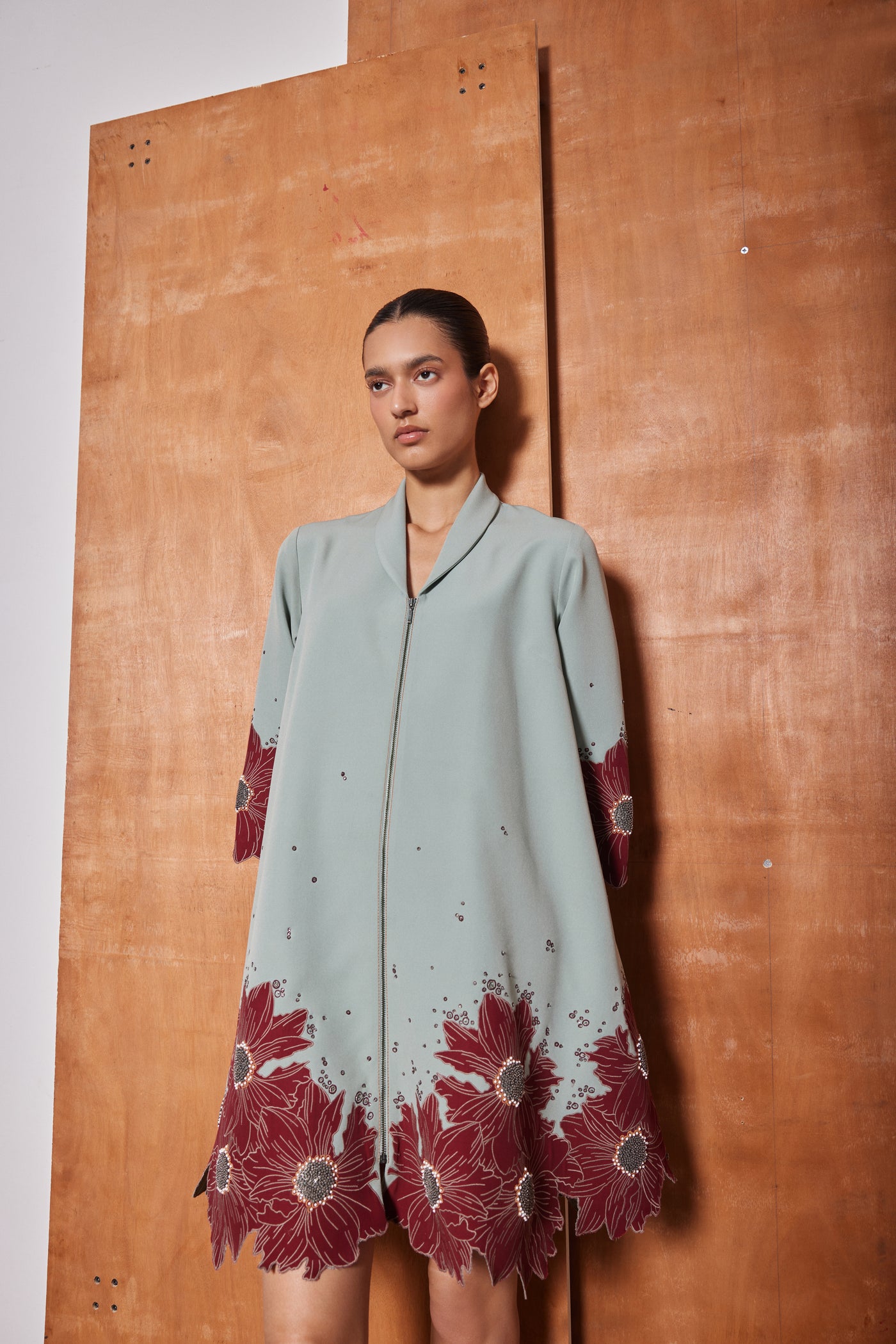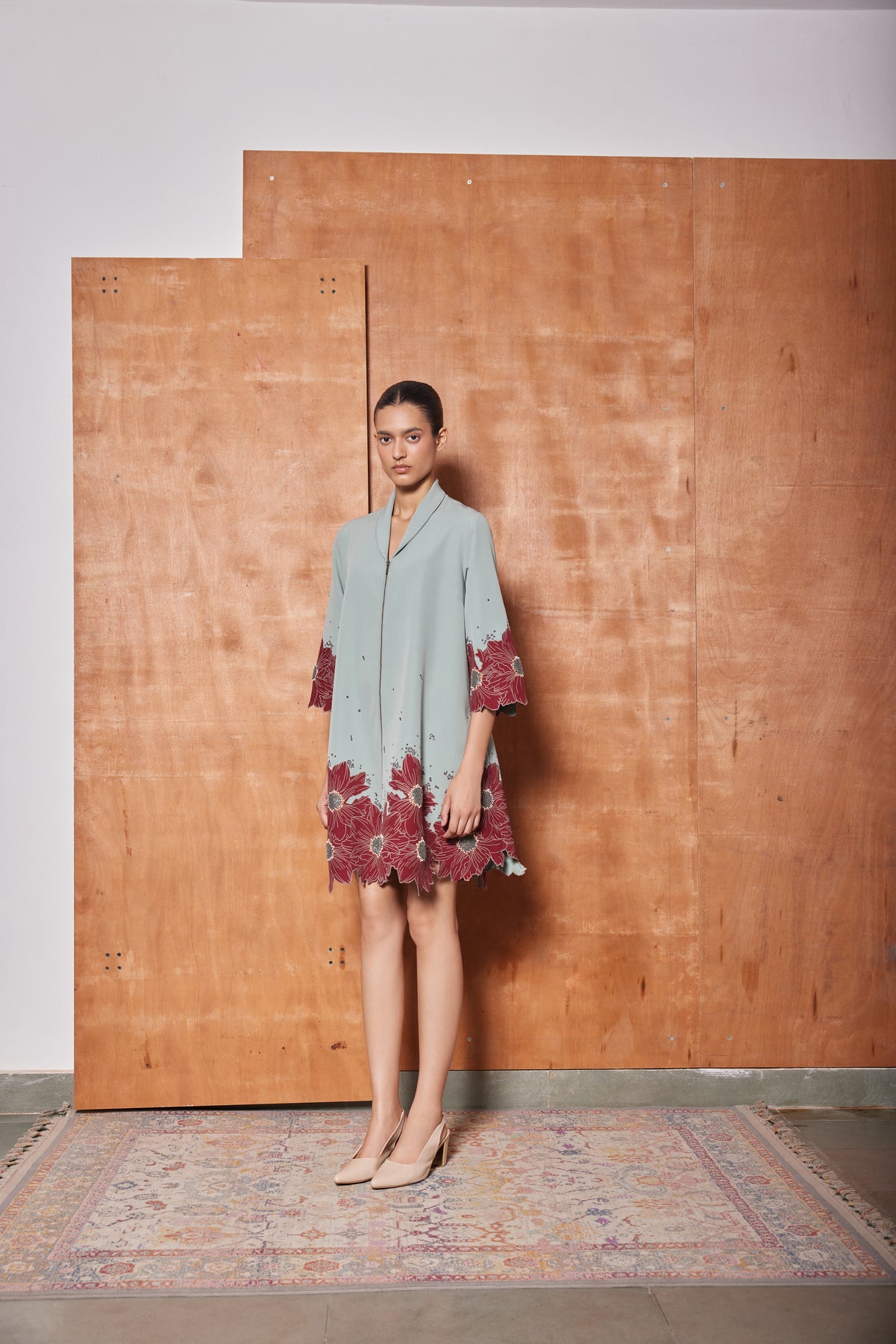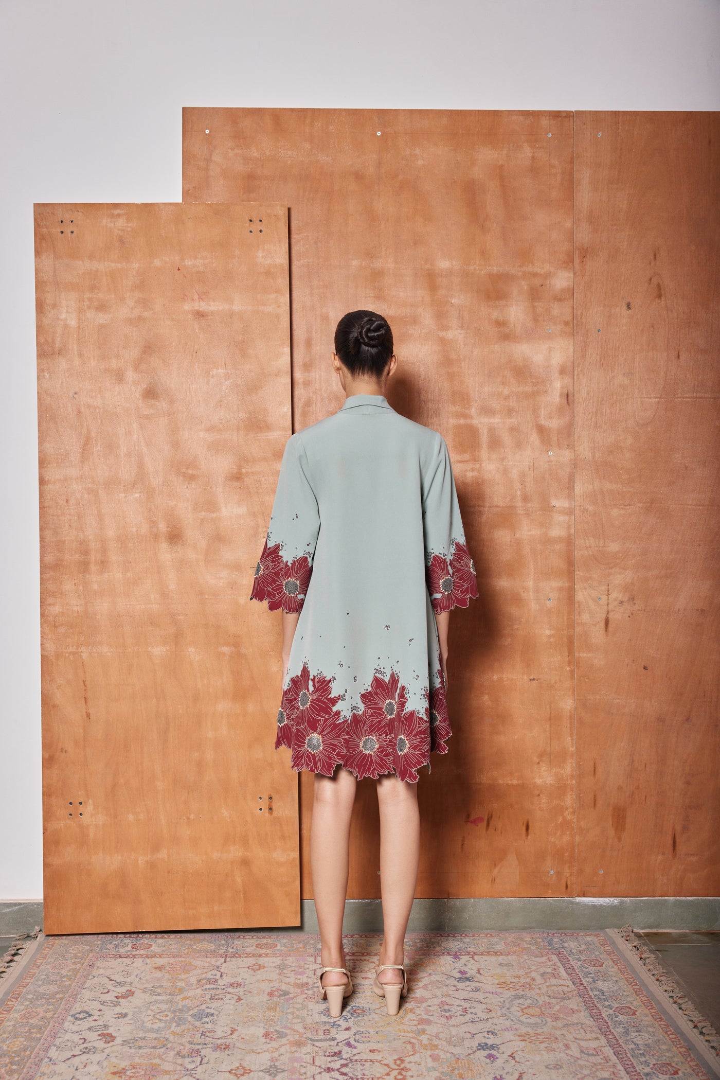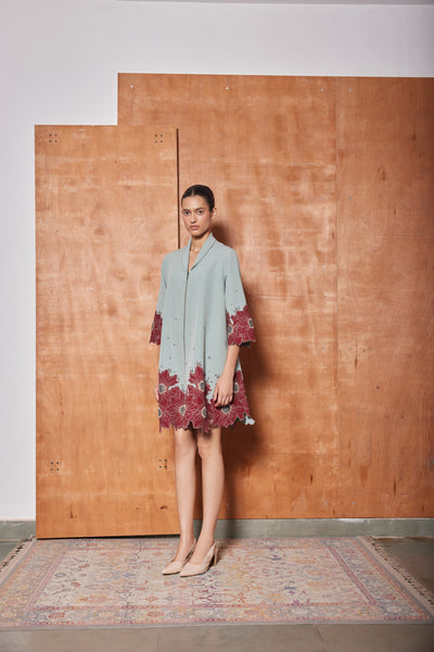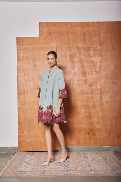 Shawl collar flared dress with appliqué floral border and embroidery. Features a shawl collar, metal zip opening, and topstitch detailing. Scallop embroidery is finished at the sleeves and hemline.