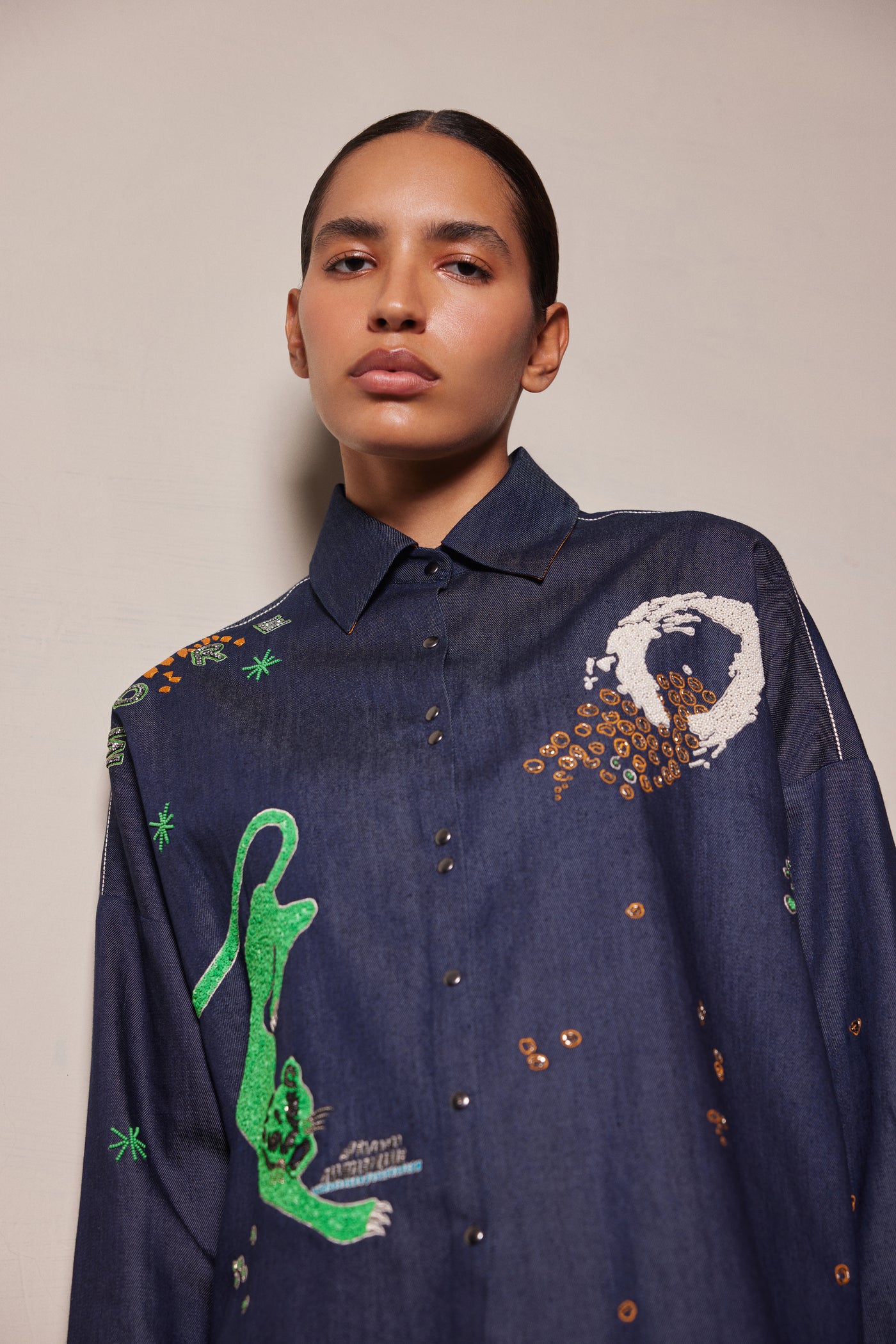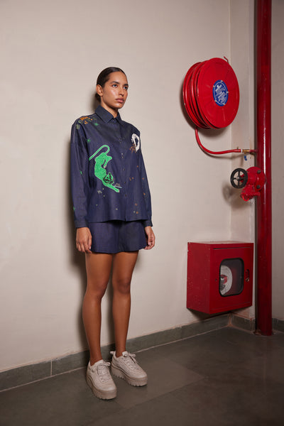 A baggy shirt with Funky Panther embroidery. It features metal snap buttons and top-stitching detail. It also has contrast color facing under the collar and hemline. Paired with matching shorts.