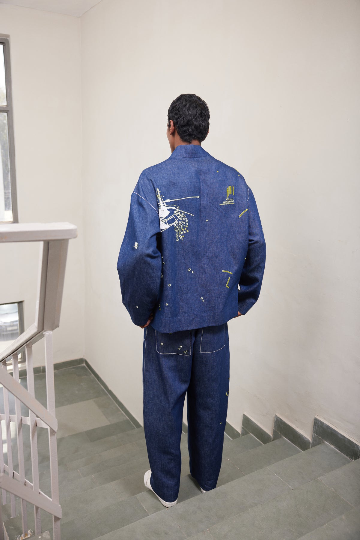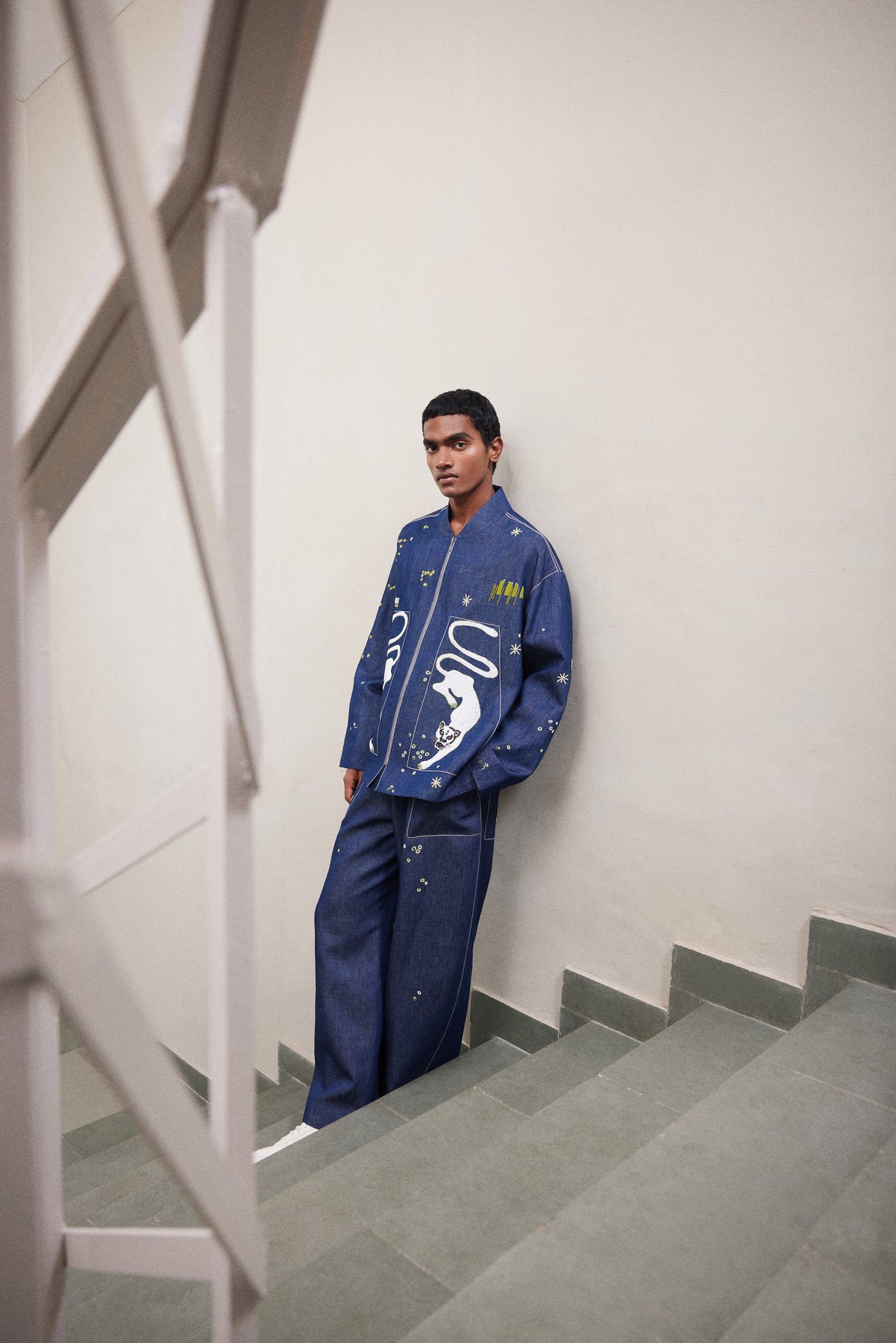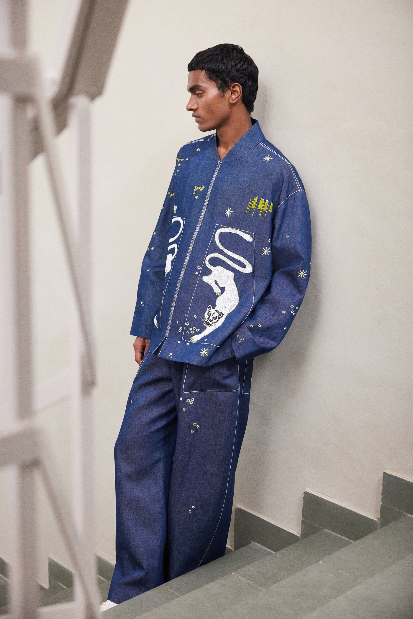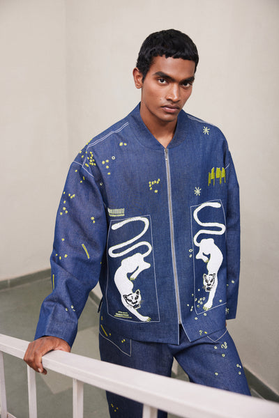 Jacket with intricate hand-embroidered funky panther. It has metal front zip opening, front pockets, top stitching detail, same color rib in hem, band collar and cuff.