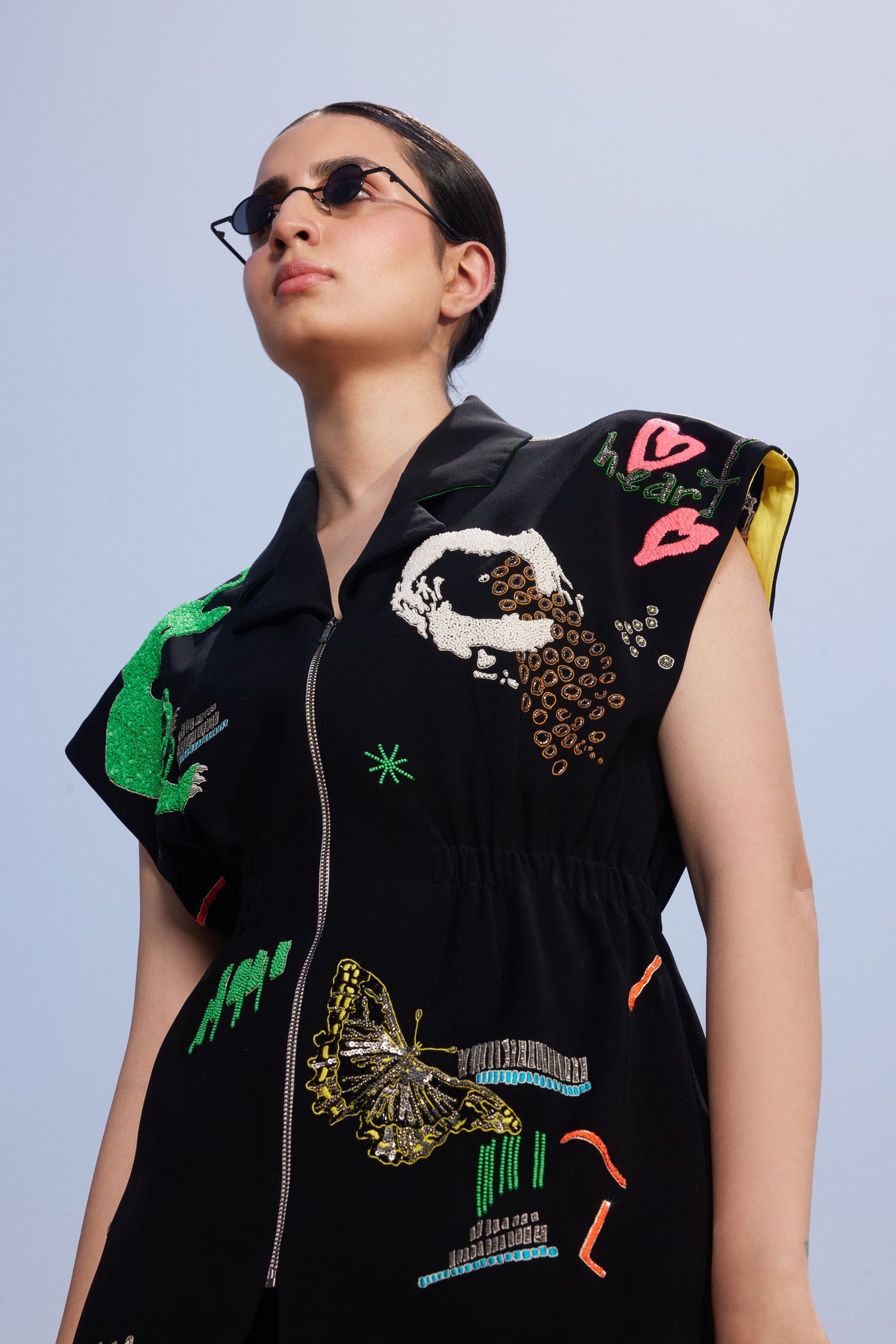 Robe jacket with embroidery of Funky Panther. It features a notch collar, elasticated waist, front metal zip opening, and contrast colour facing under the armholes and waist.