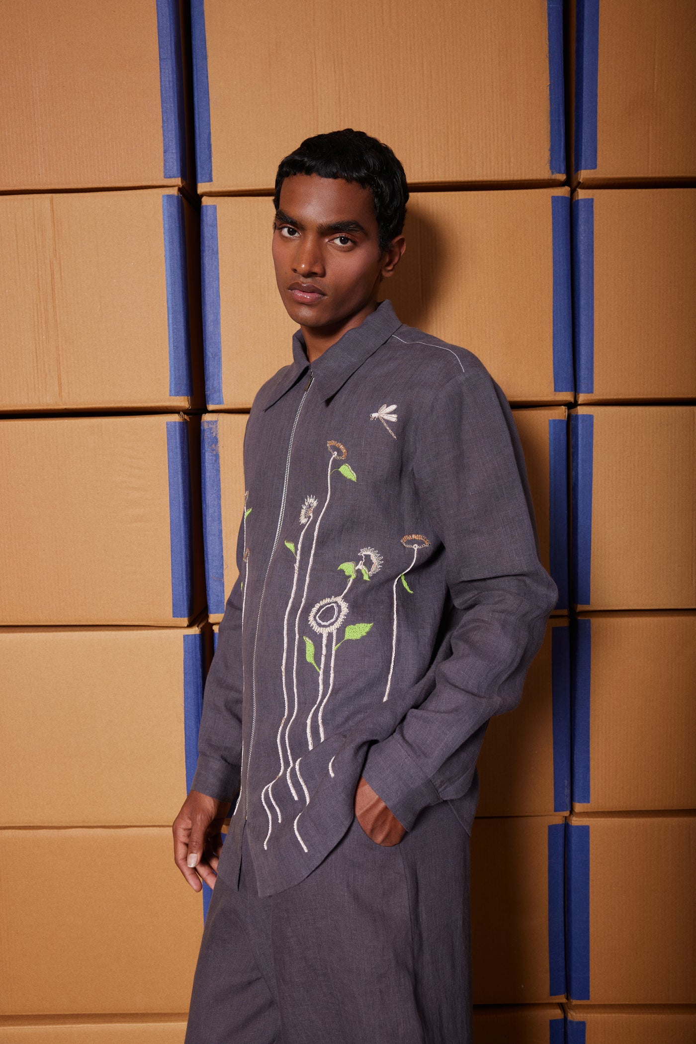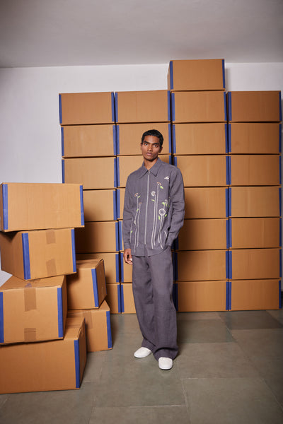 Full sleeves shirt with embroidered Gentle garden. It has front metal zip opening with collar and top stitching detail.