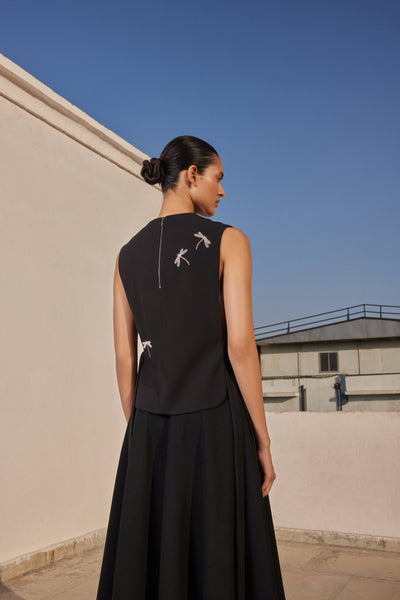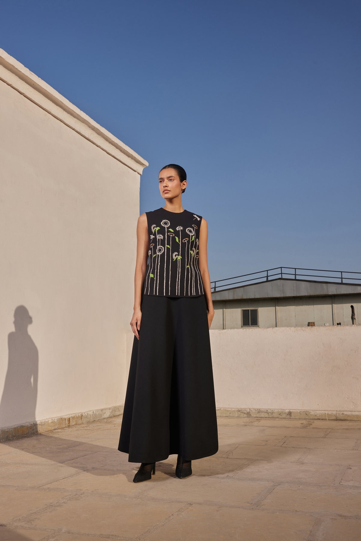 Overlay with intricate hand-embroidered Gentle Garden. It has back metal zip opening and contrast color facing under overlay. It is paired with matching circular skirt.