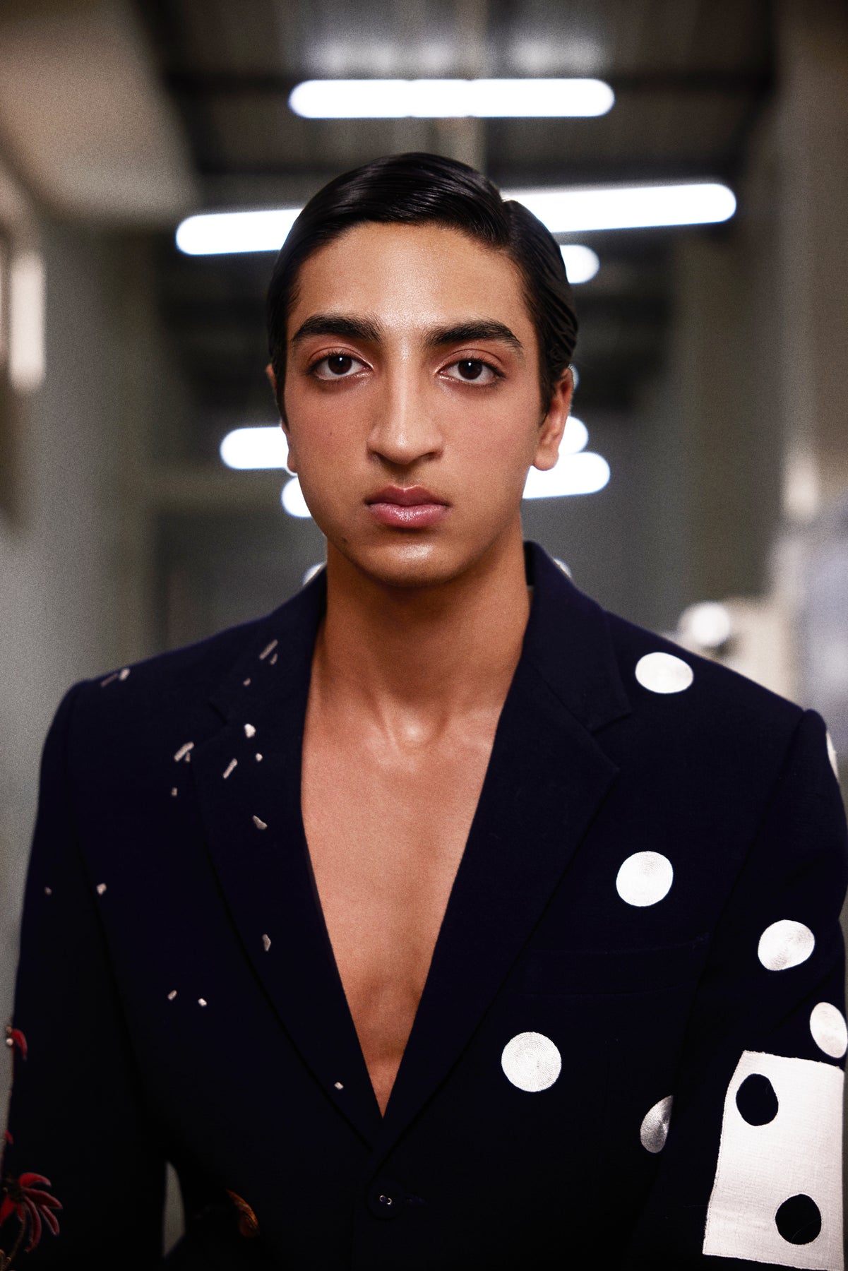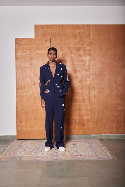 Blazer embroidered with Heart, Telephone, and text. It features a coat collar, fabric-covered buttons, shoulder pads, and satin lining.