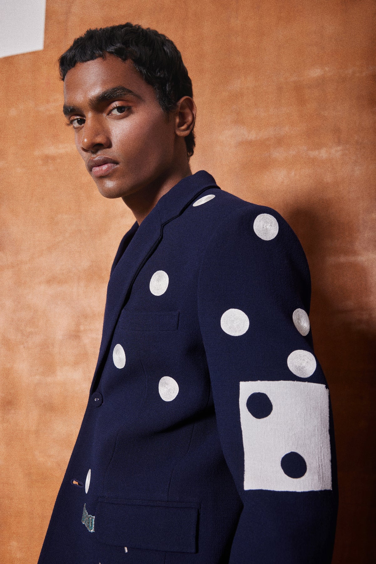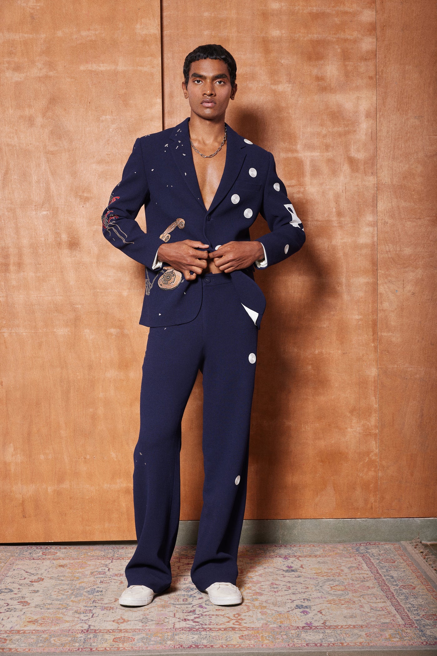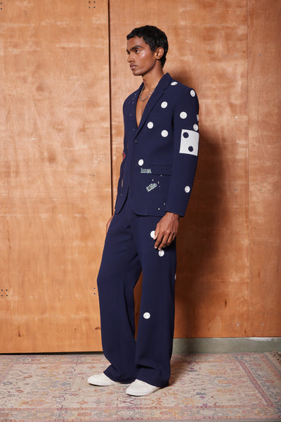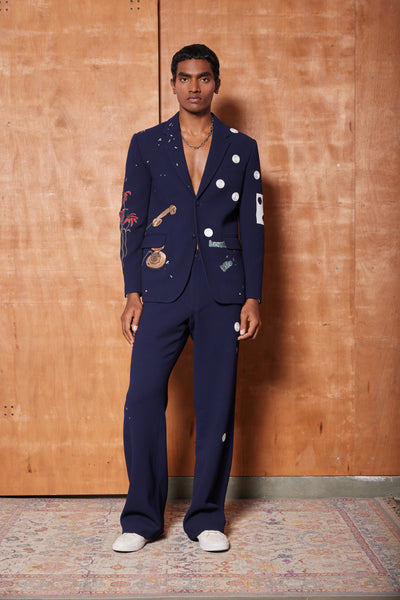 Blazer embroidered with Heart, Telephone and texts. It has coat collar, fabric covered buttons, shoulder pads and satin lining. It is paired with matching embroidered straight pants.