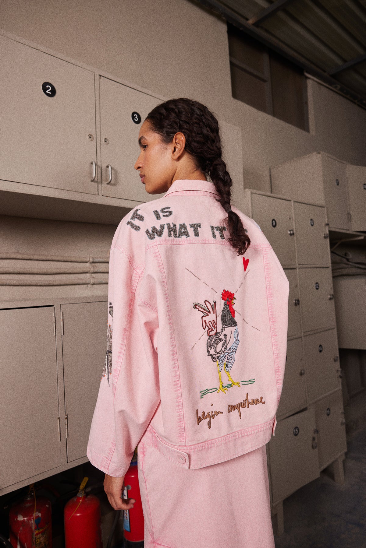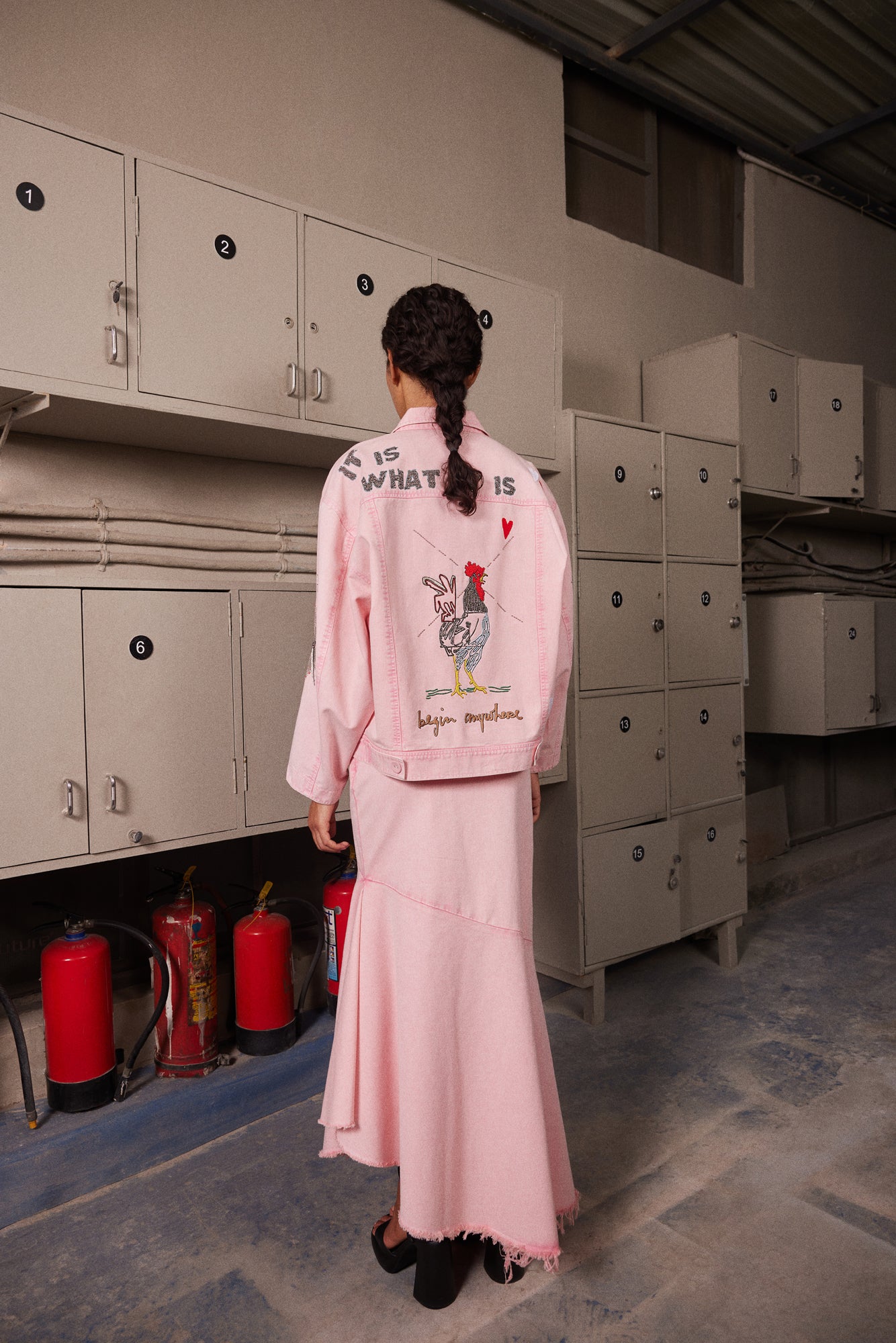 Oversized Jacket with Embroidery of Heart and Crown. It has a collar and hand-embroidered back. It is paired with a matching asymmetric skirt.