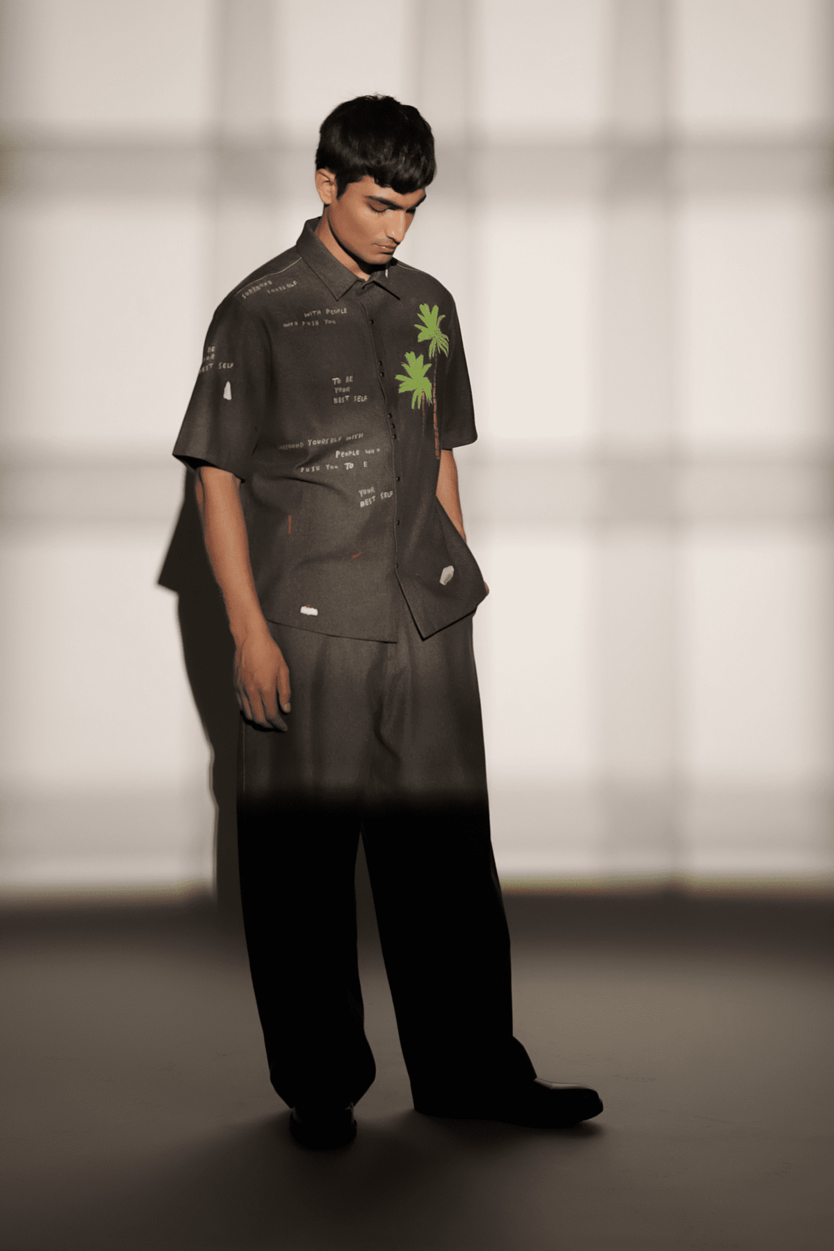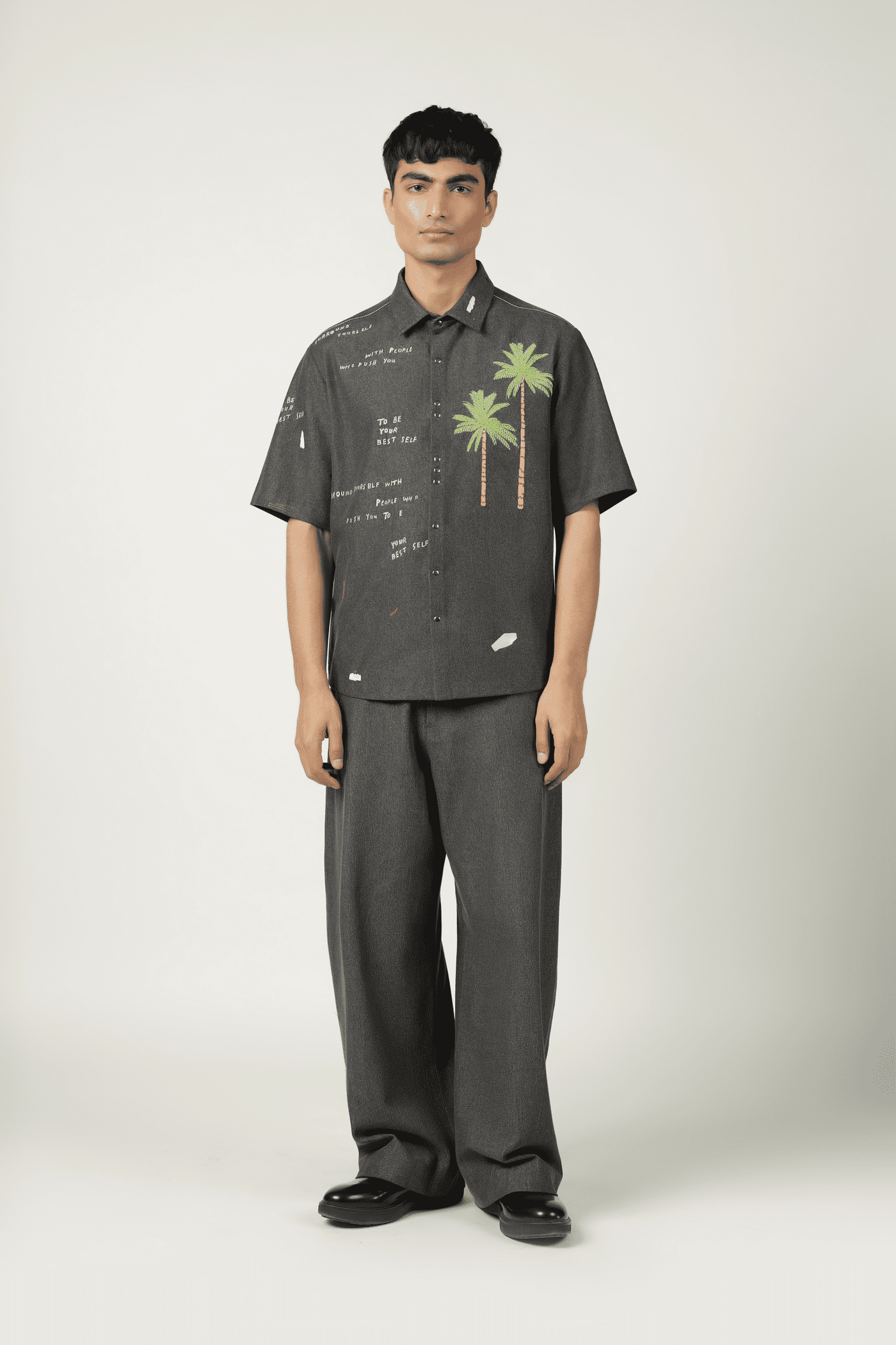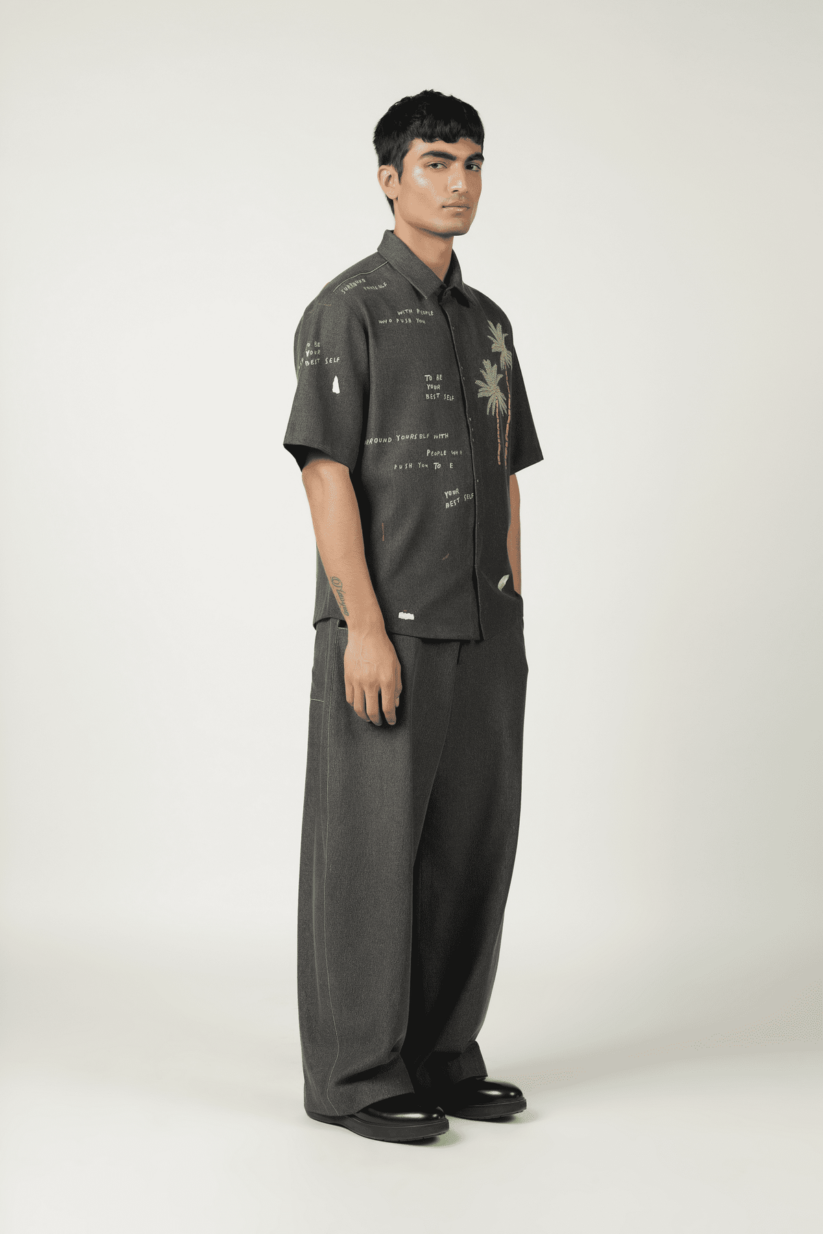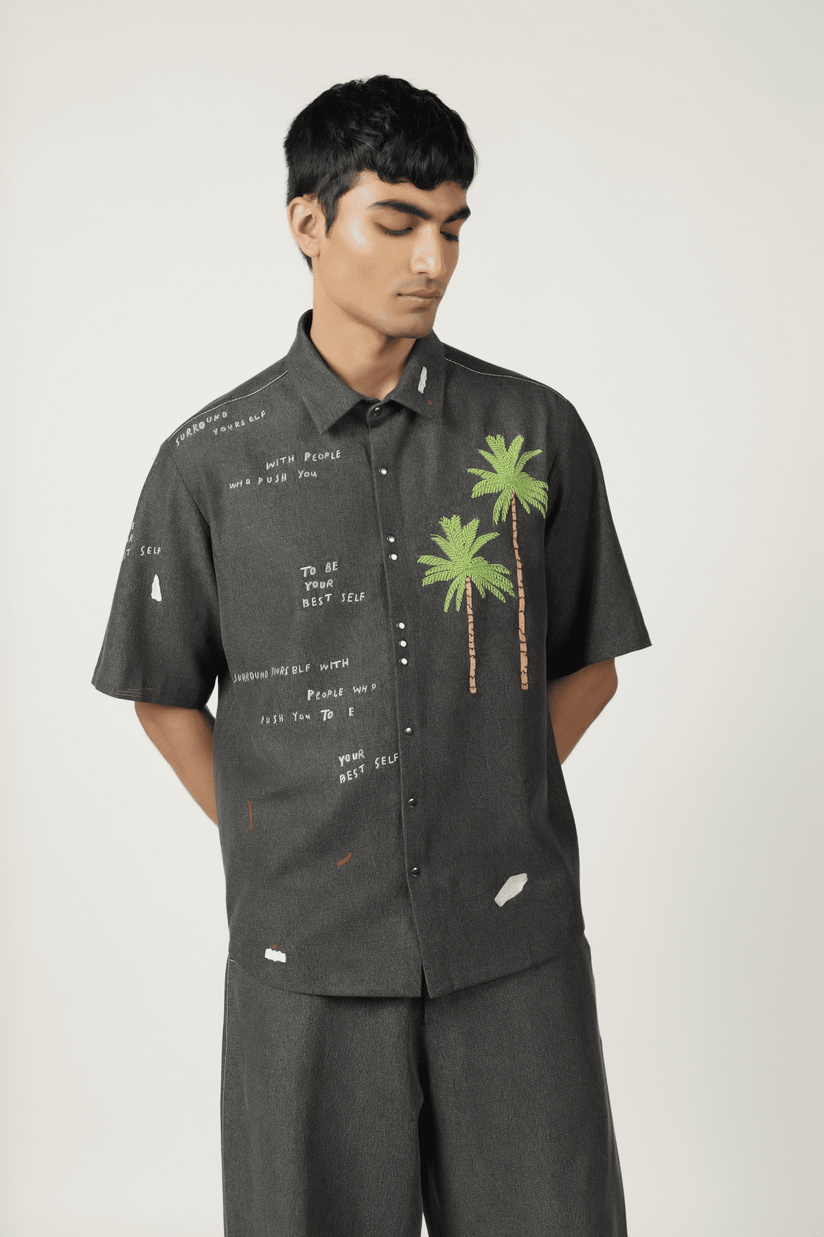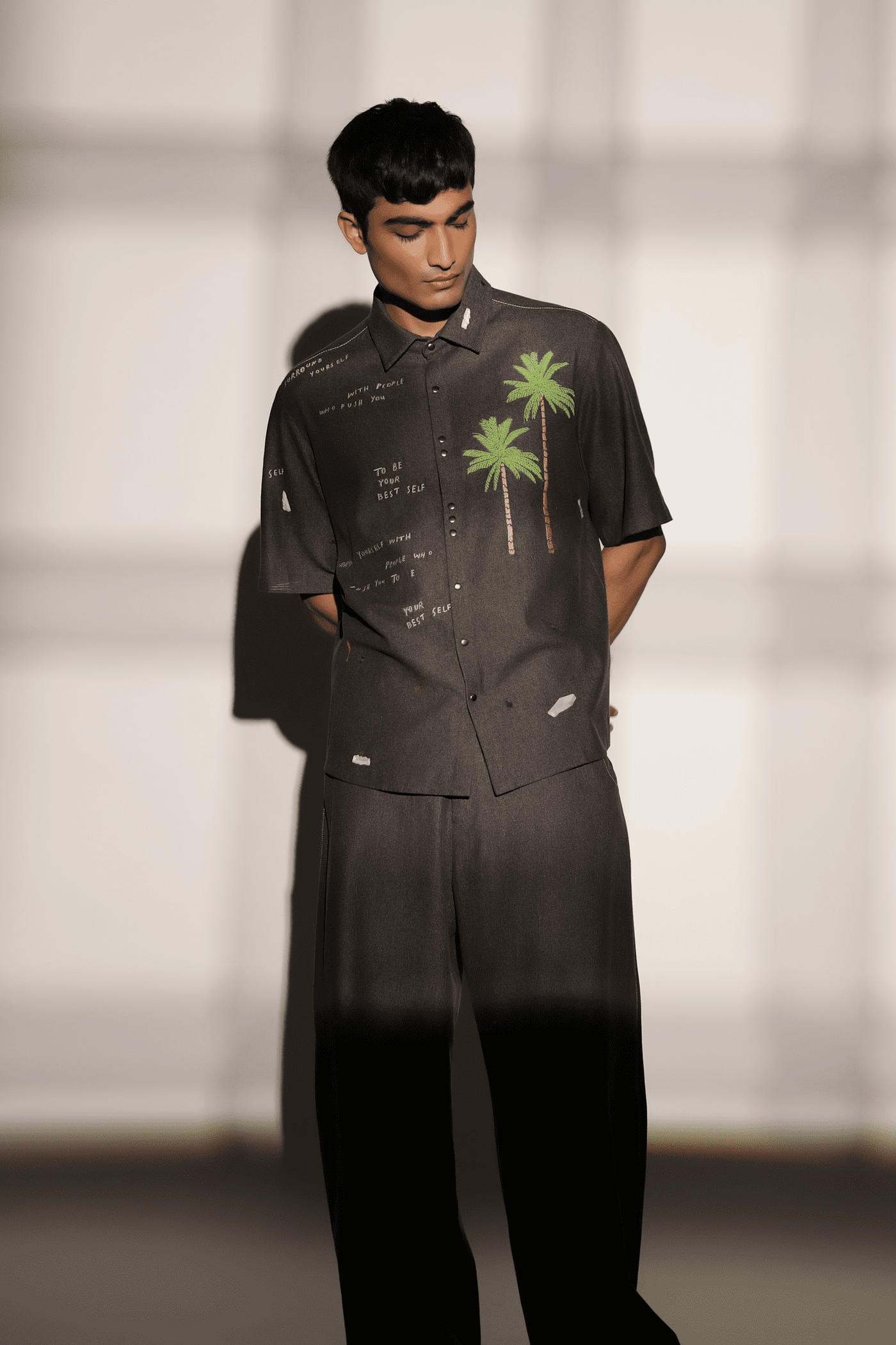 Holiday half sleeve shirt with tree, text and abstract shapes embroidery. The garment has collar and gun metal snap buttons. It also has a top stitching detail on back yoke and shoulder. It is paired with matching pants.