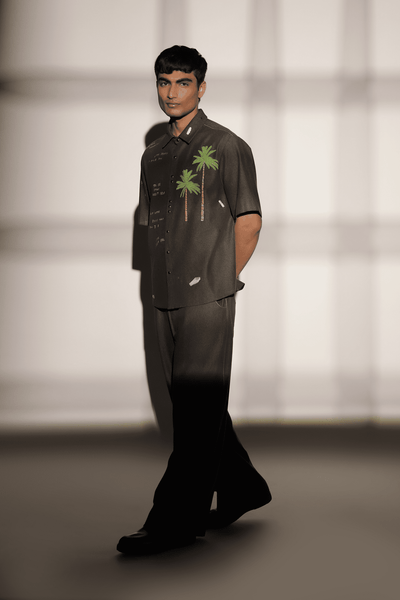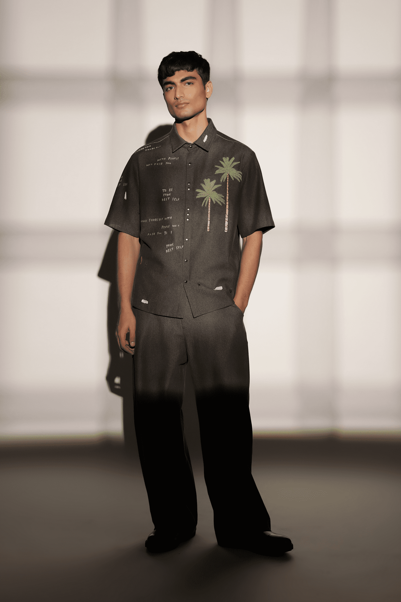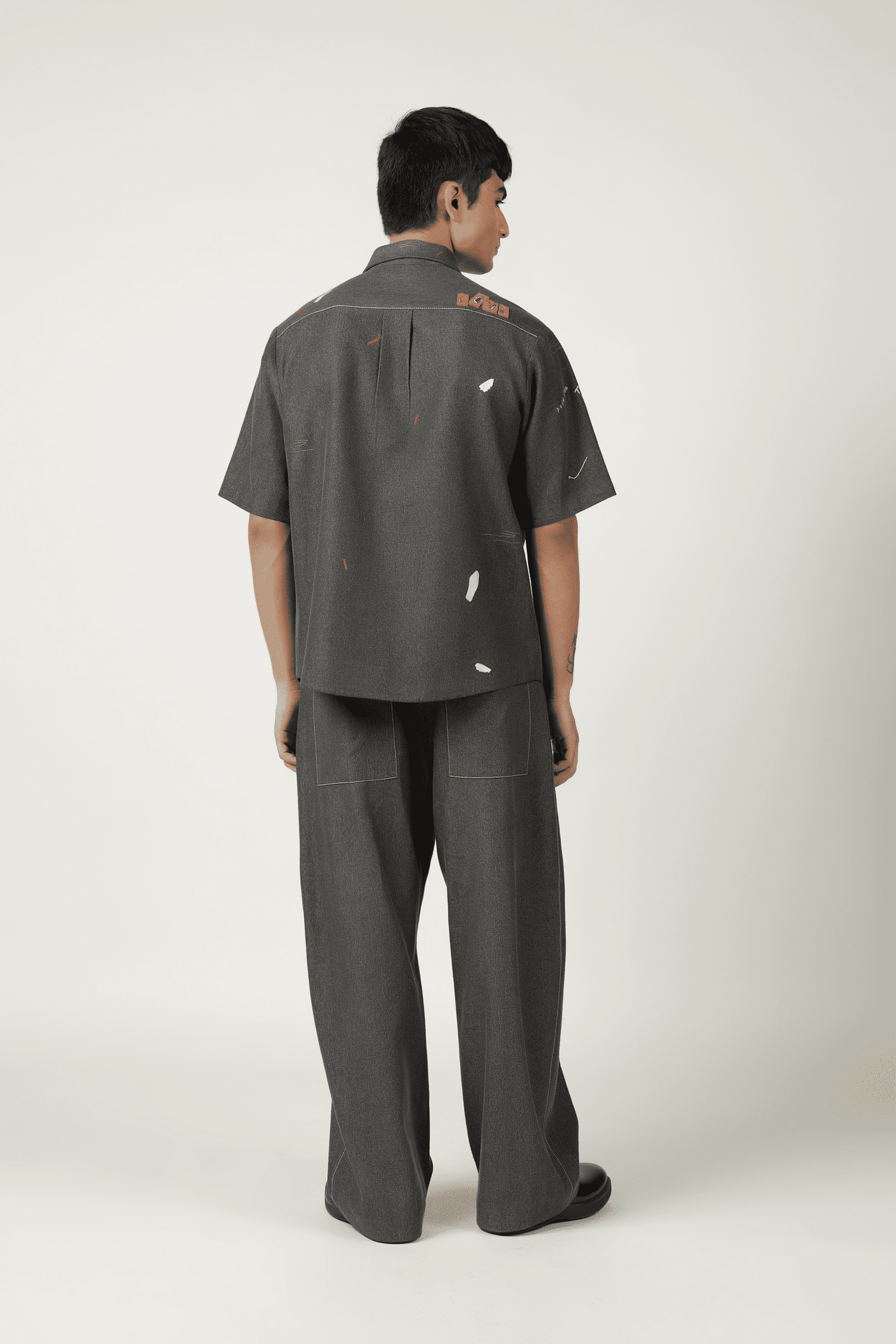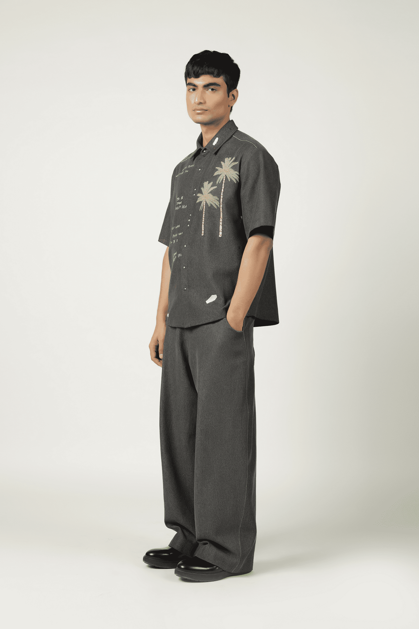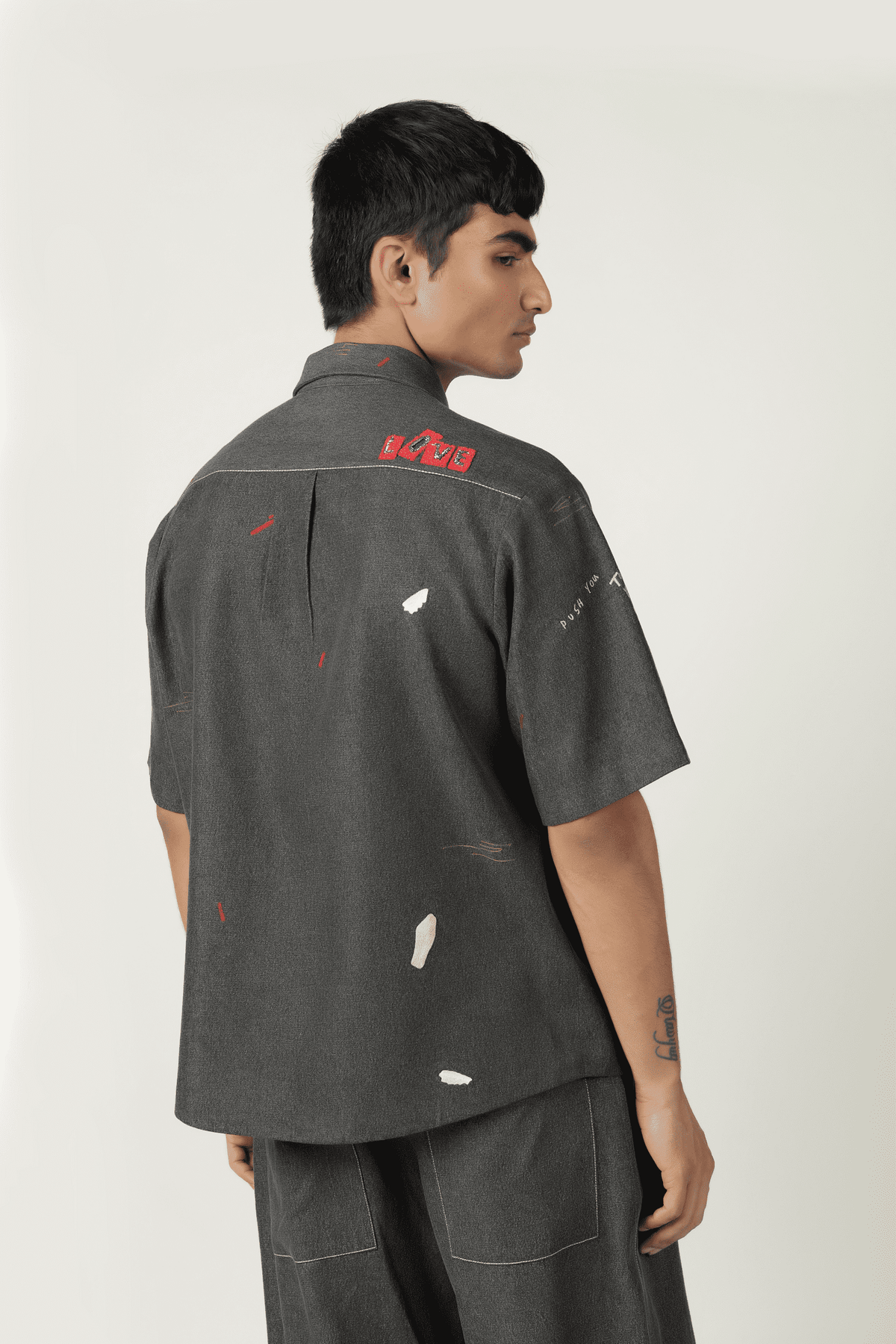 Holiday half sleeve shirt with tree, text and abstract shapes embroidery. The garment has collar and gun metal snap buttons. It also has a top stitching detail on back yoke and shoulder. It is paired with matching pants.