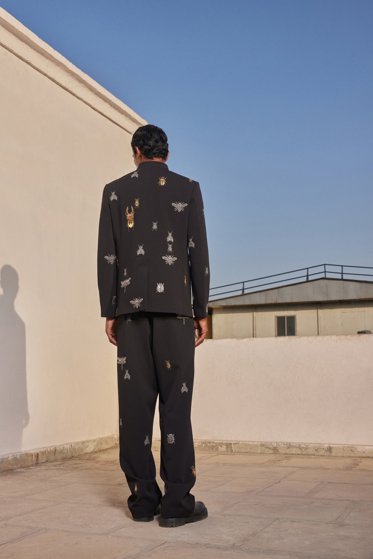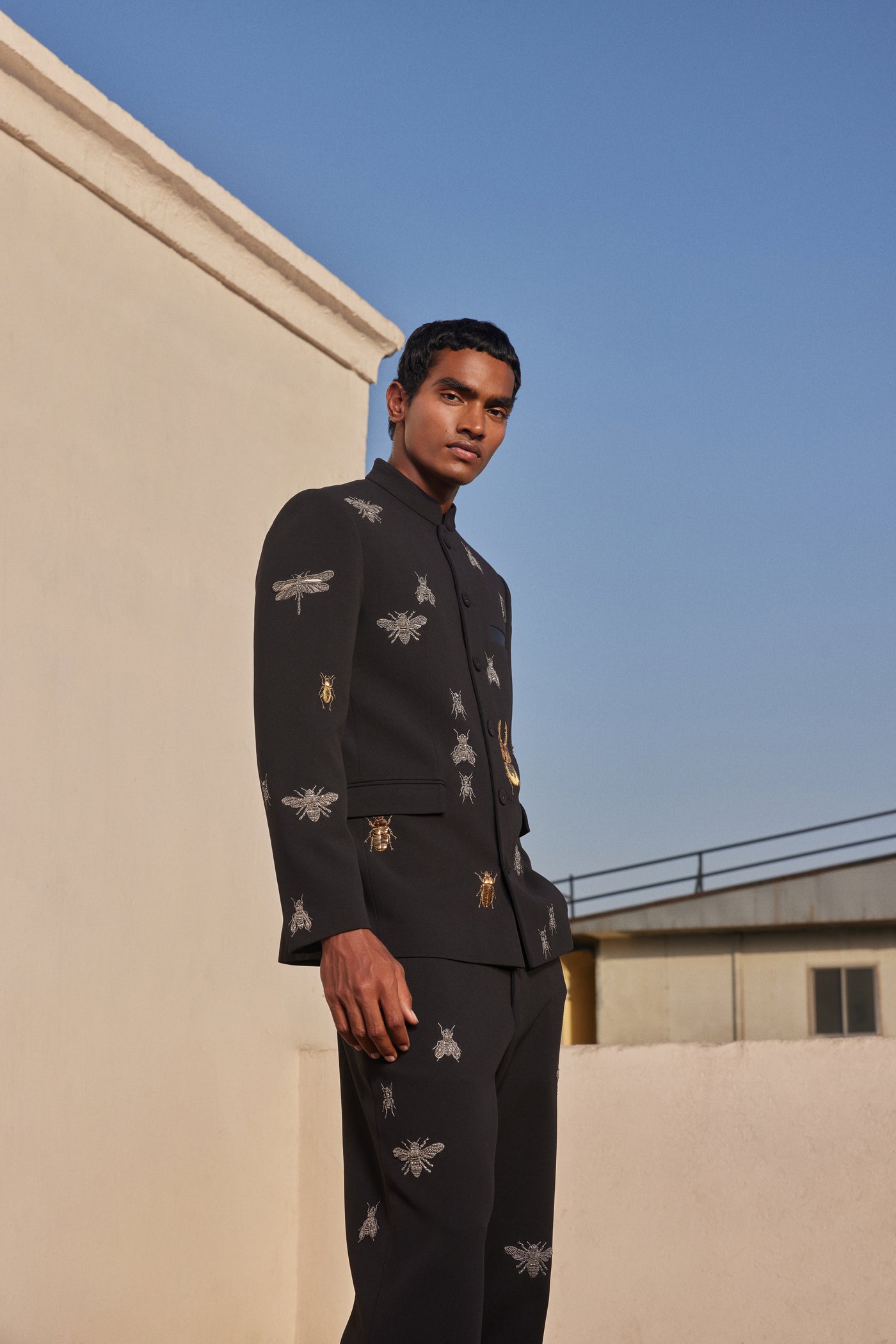 Bandhgala jacket with hand-embroidered Insect motif. Features a high collar, fabric-covered buttons, shoulder pads, and satin lining. Paired with matching embroidered pants.