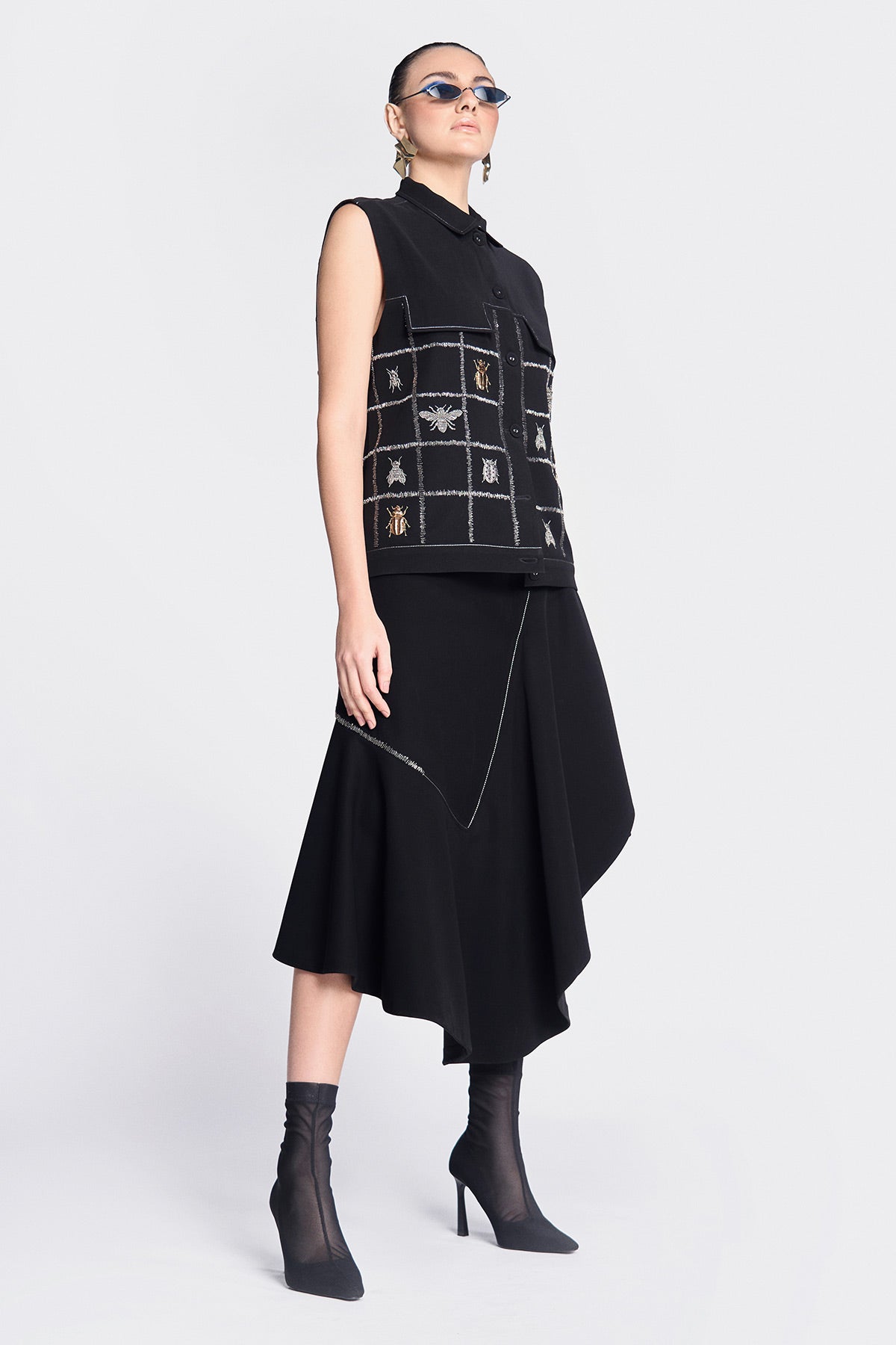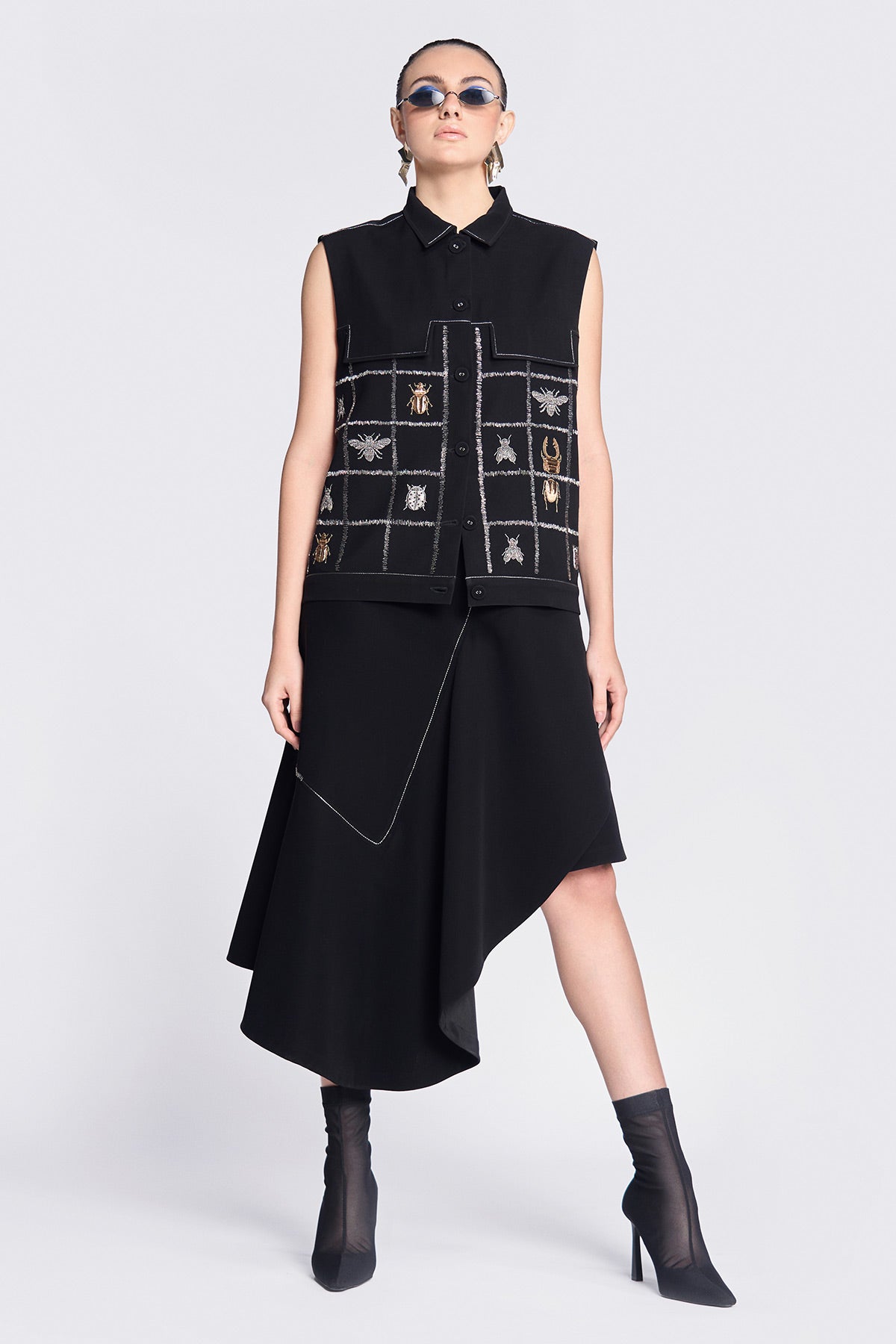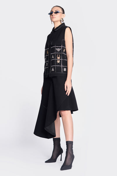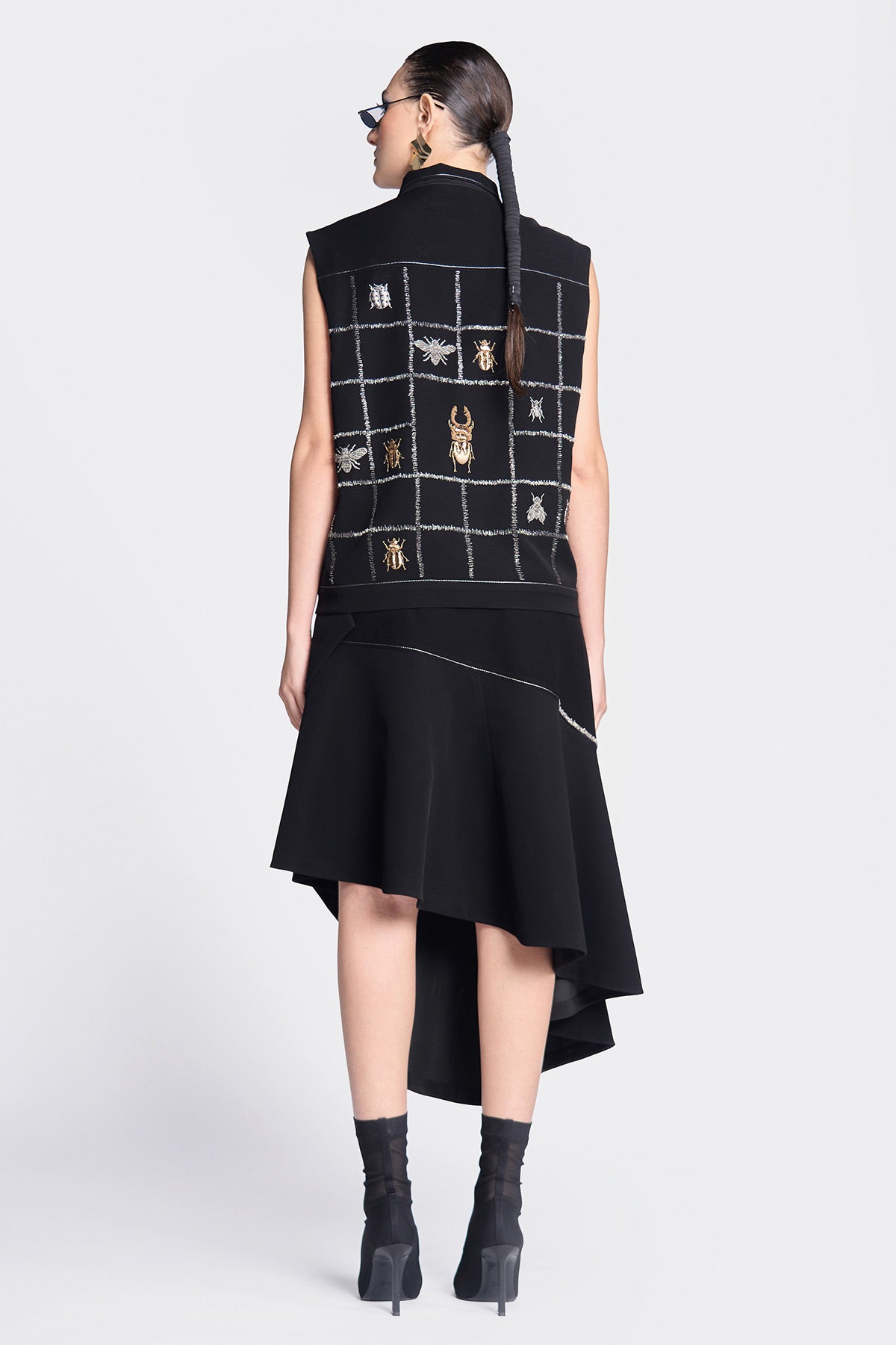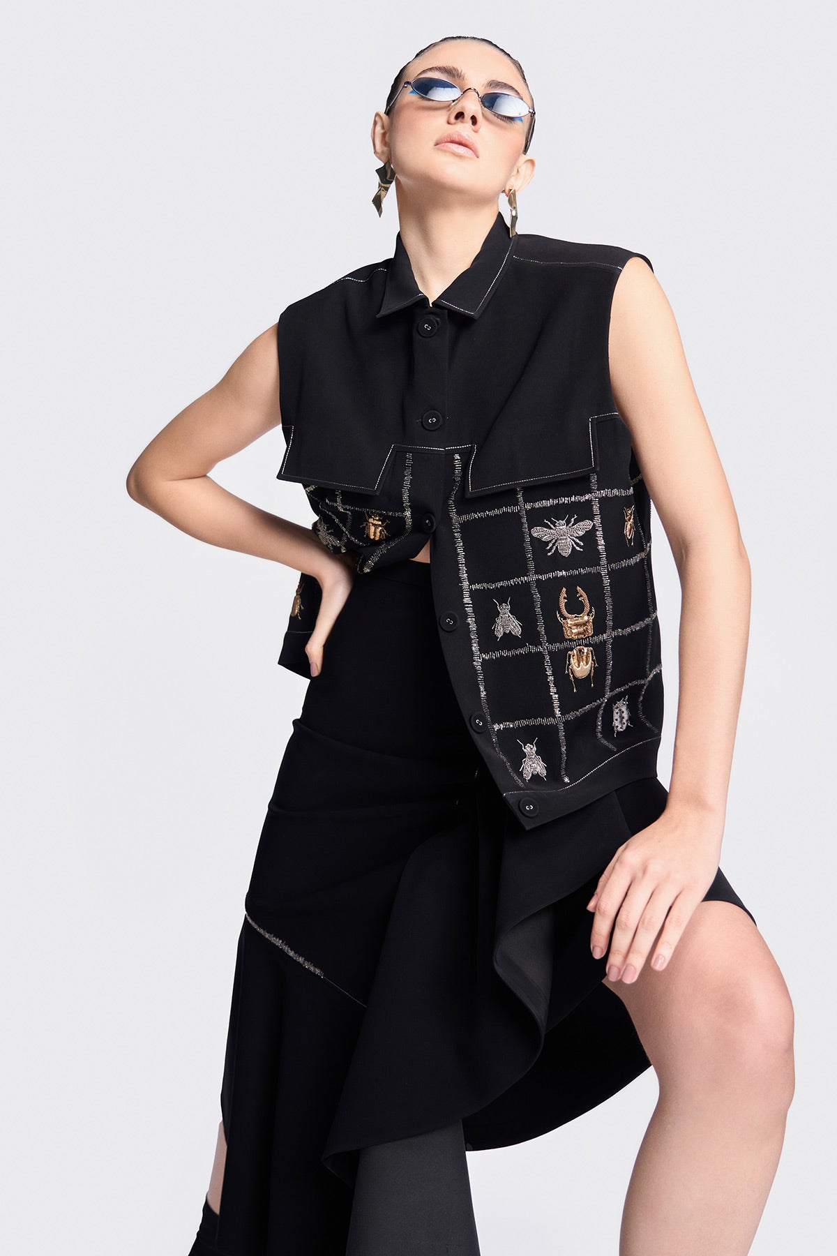 Sleeveless Vest With Intricate Hand-embroidered Insects and Checks. It Has a Collar, Fabric-covered Buttons, Side Conceal Pockets, Metal Thread Top Stitching Detail.