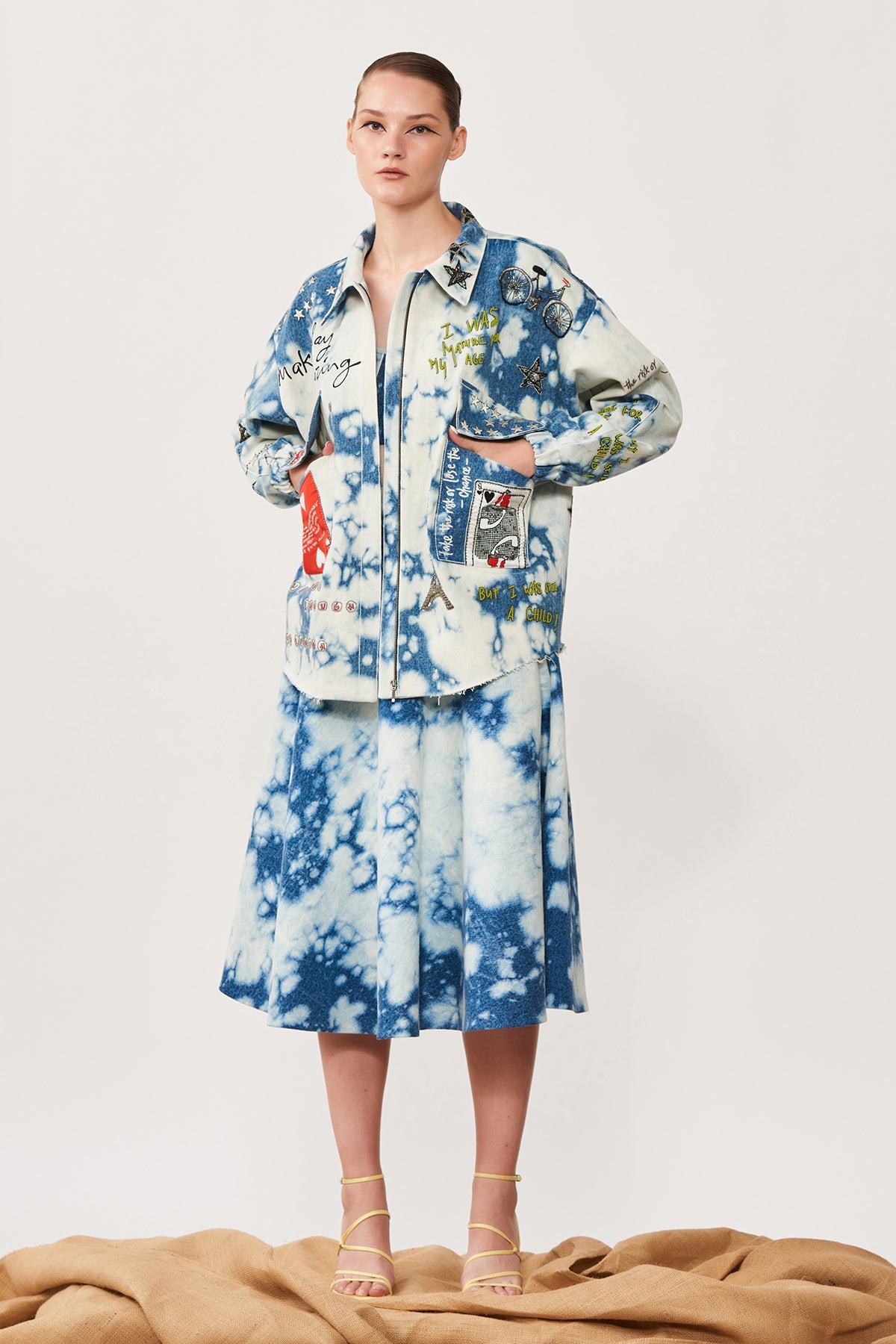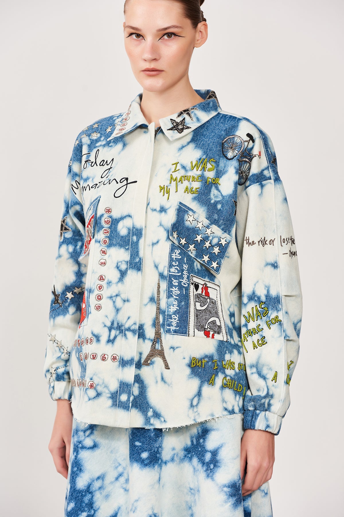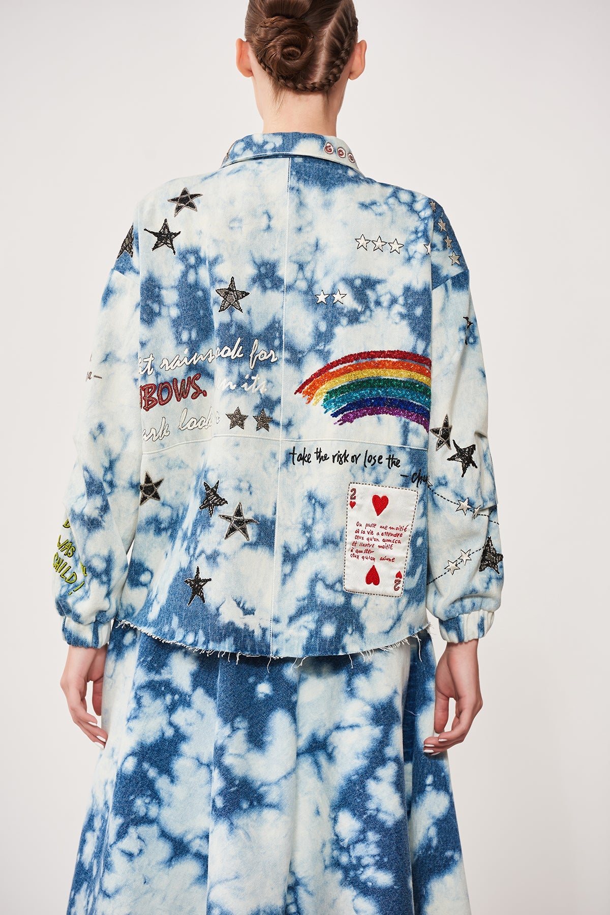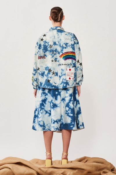Oversized Cloud Washed Denim Jacket Embroidered With Funky Motifs Like Play Queen Card, Post Card, Star, Bicycle Motifs. The Jacket Has Metal Zip, Top Stitching Detail and Raw Edges. Its Paired With Matching Corset and Circular Skirt.