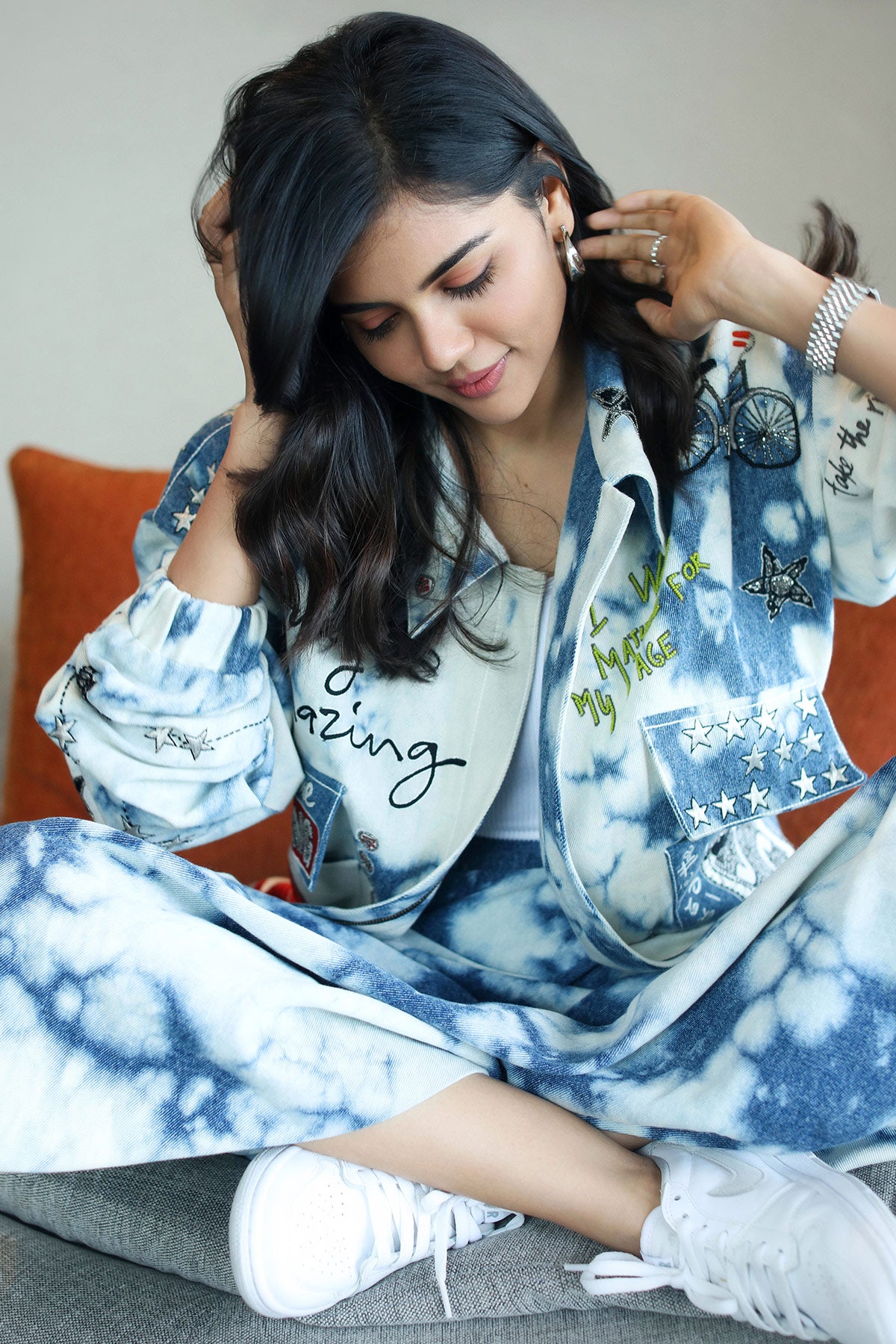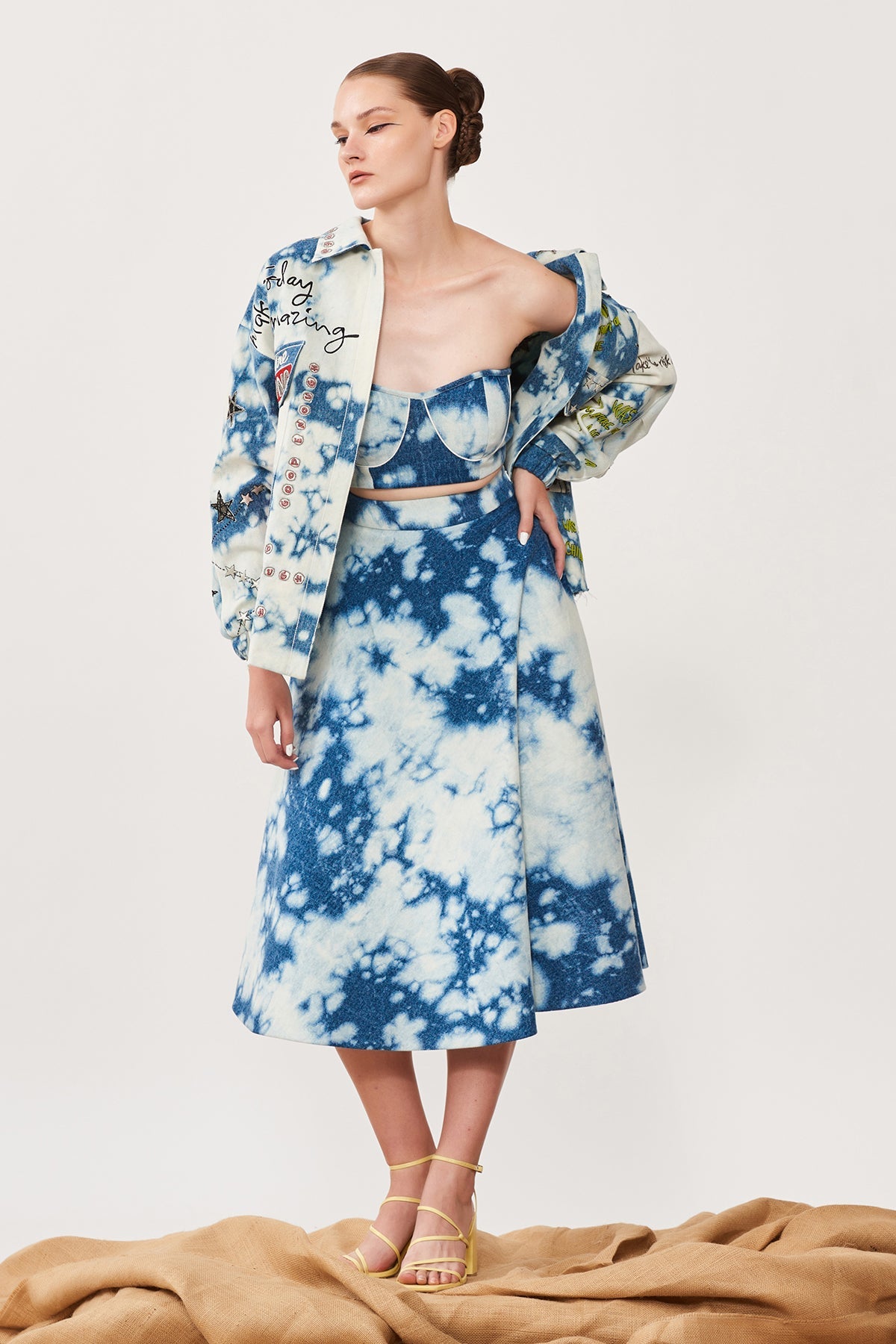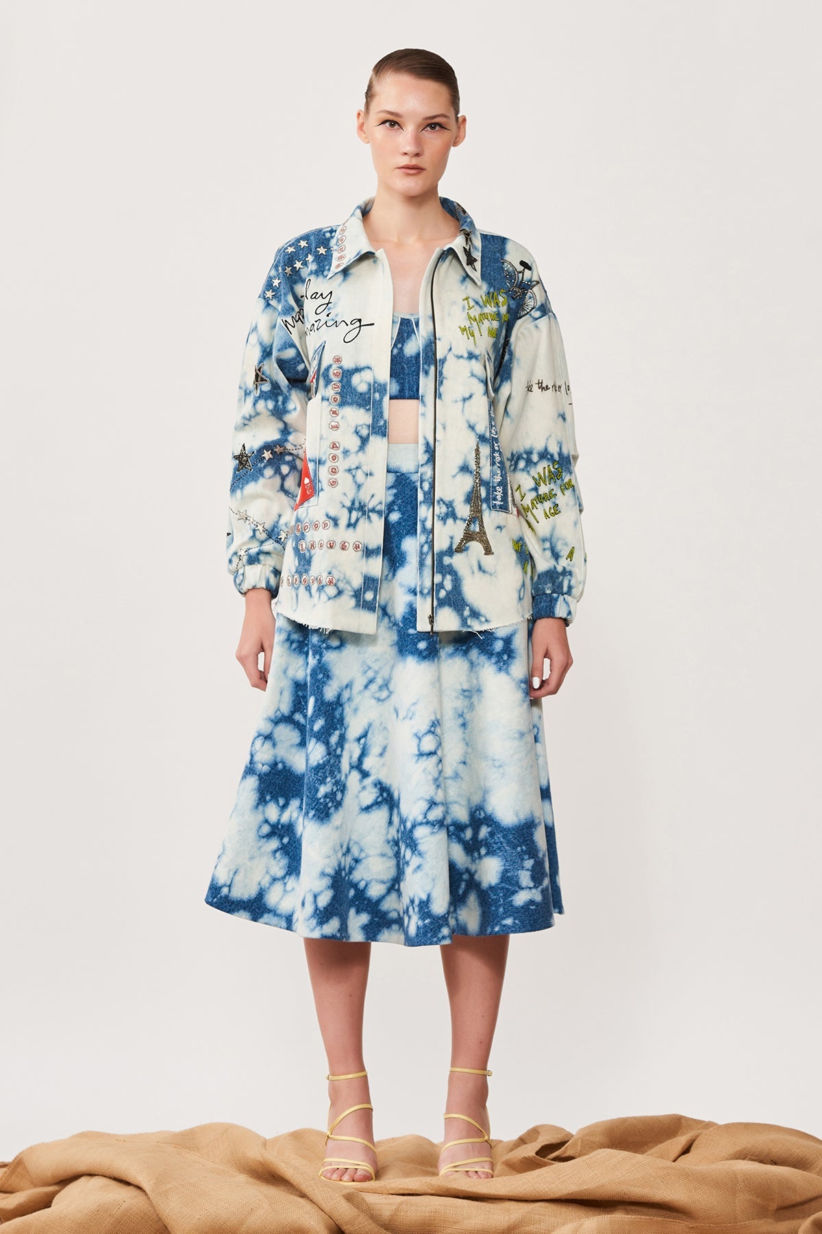Oversized Cloud Washed Denim Jacket Embroidered With Funky Motifs Like Play Queen Card, Post Card, Star, Bicycle Motifs. The Jacket Has Metal Zip, Top Stitching Detail and Raw Edges. Its Paired With Matching Corset and Circular Skirt.