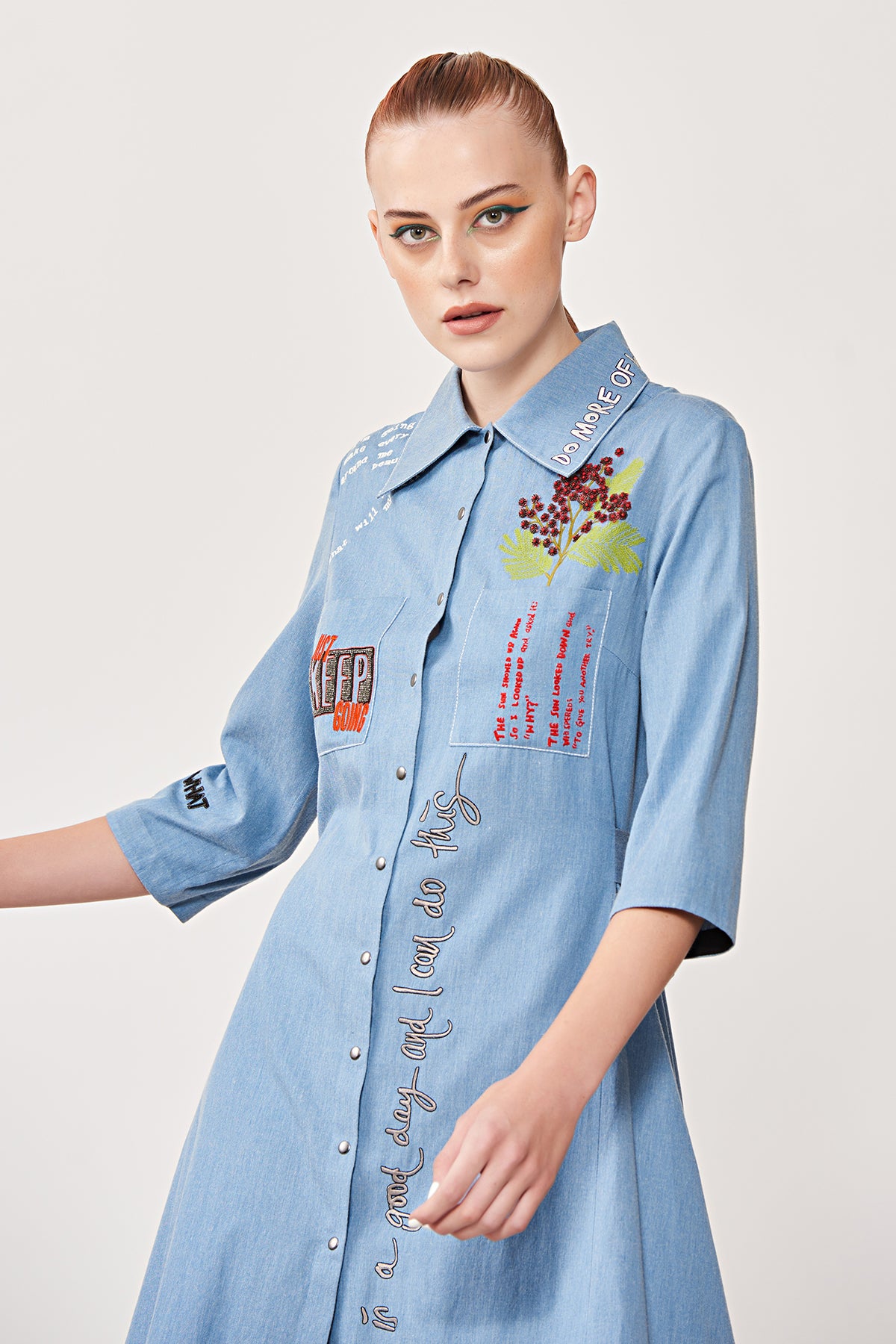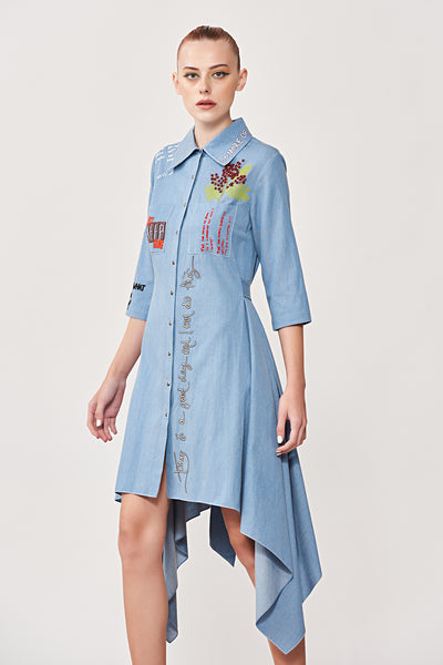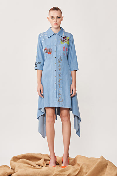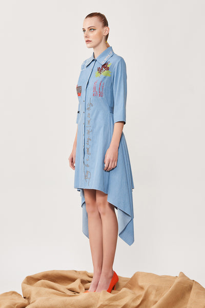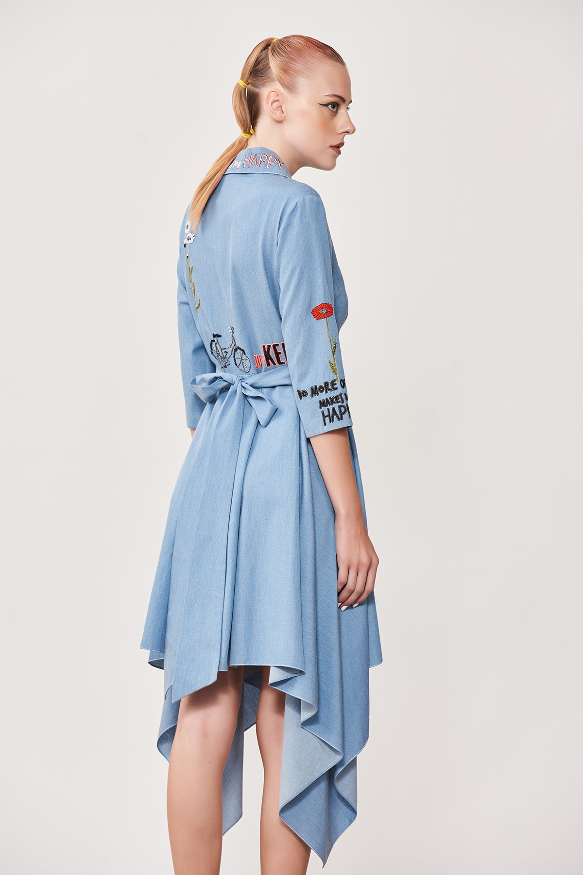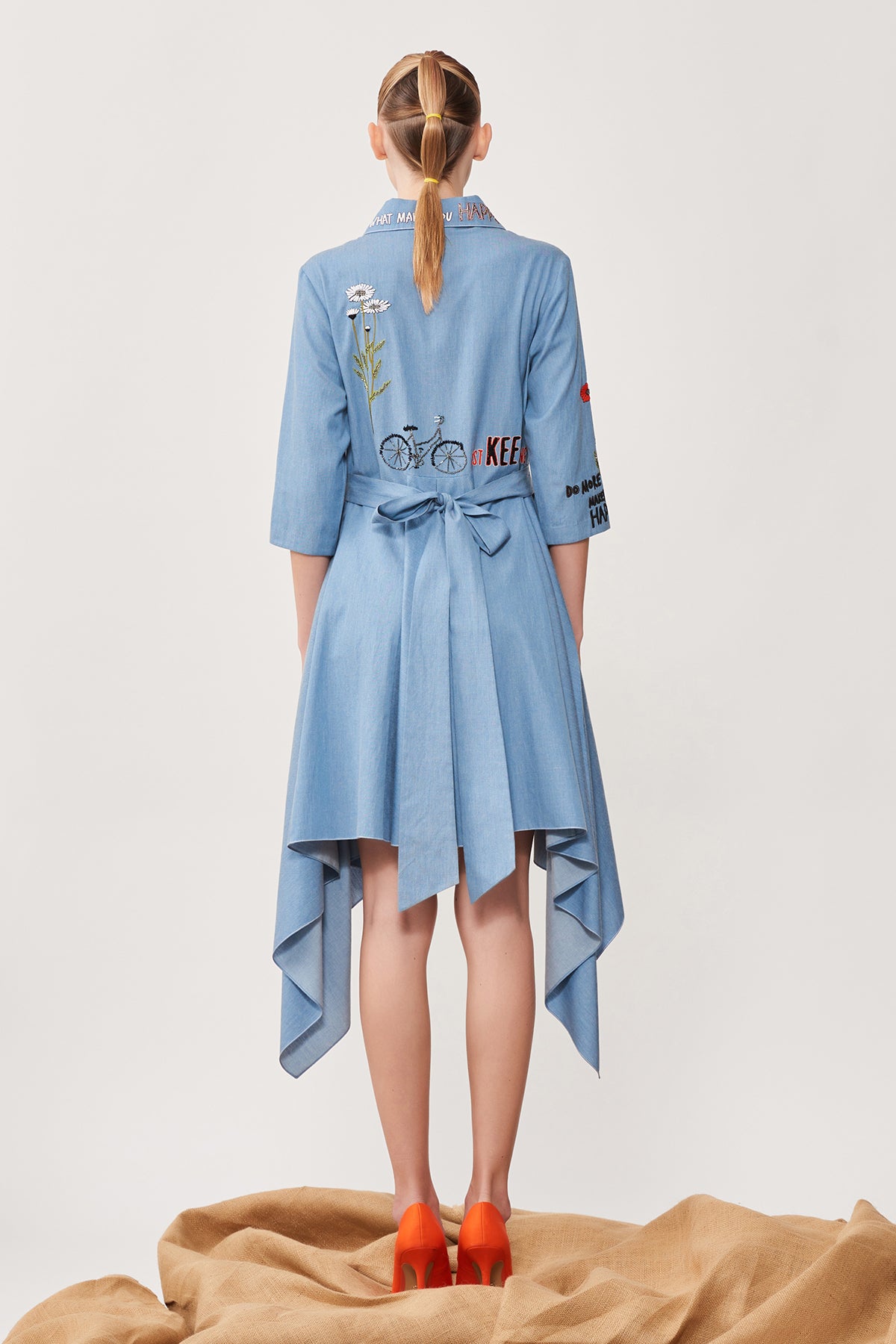 Draped Dress With Keep Going Funky Motifs Embroidery.the Garment Has Snap Buttons, Top Stitching Detail on Pockets and Collar. It Comes Along With Attached Belt at the Back.