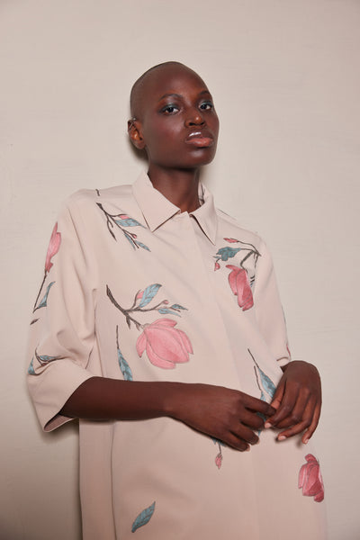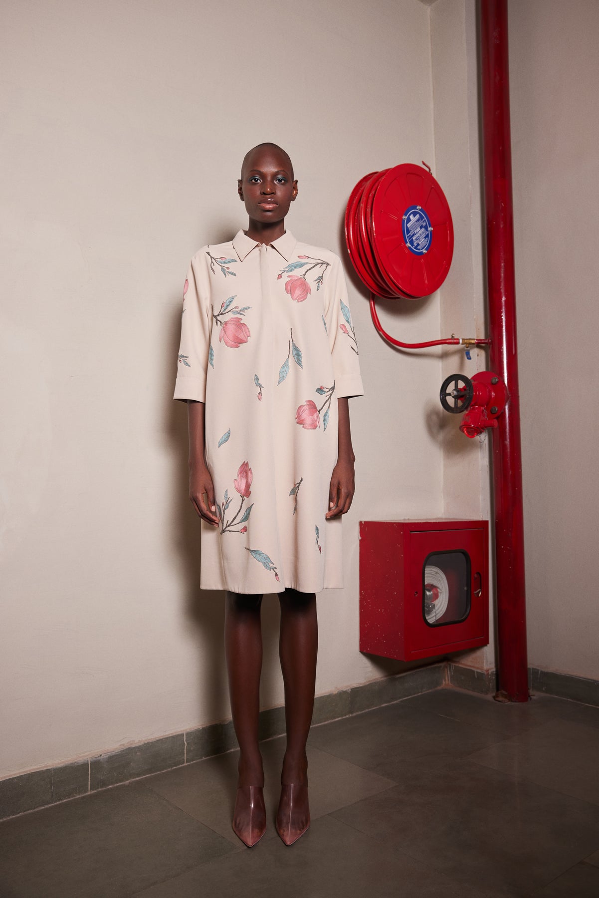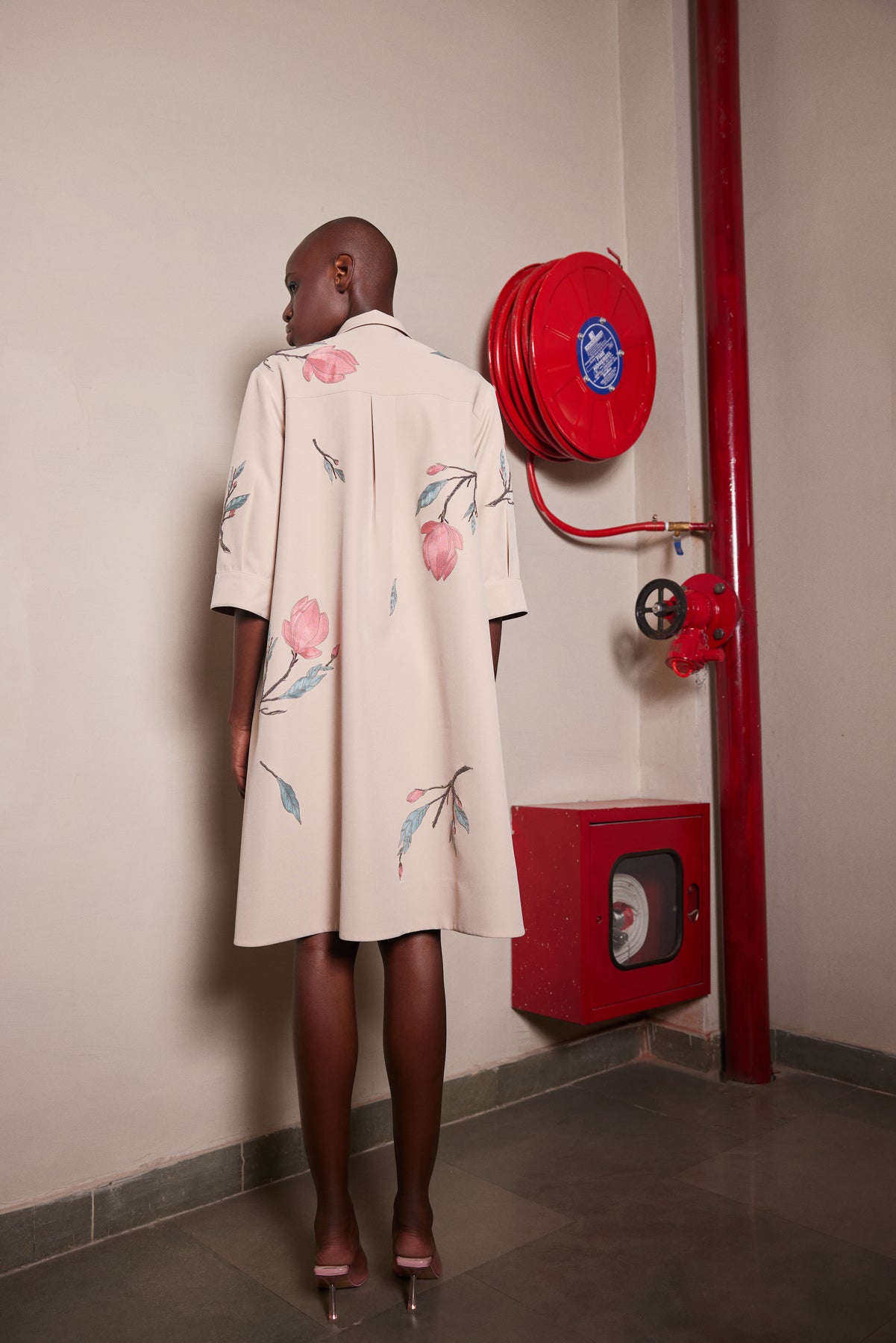 Front open flared dress with Magnolia Blossom embroidery. It has a concealed placket with metal snap buttons and top stitching detail. It has a box pleat at the back. It also has contrast color facing under collar, cuff and hem.