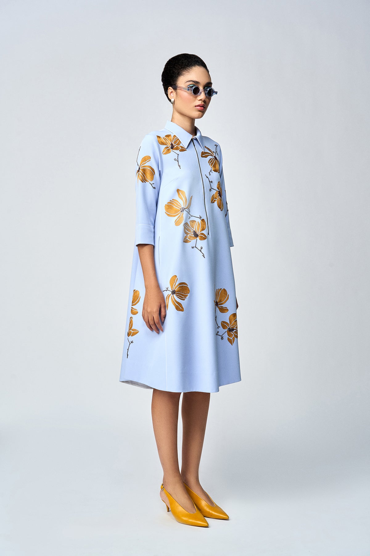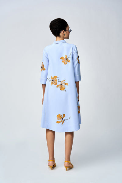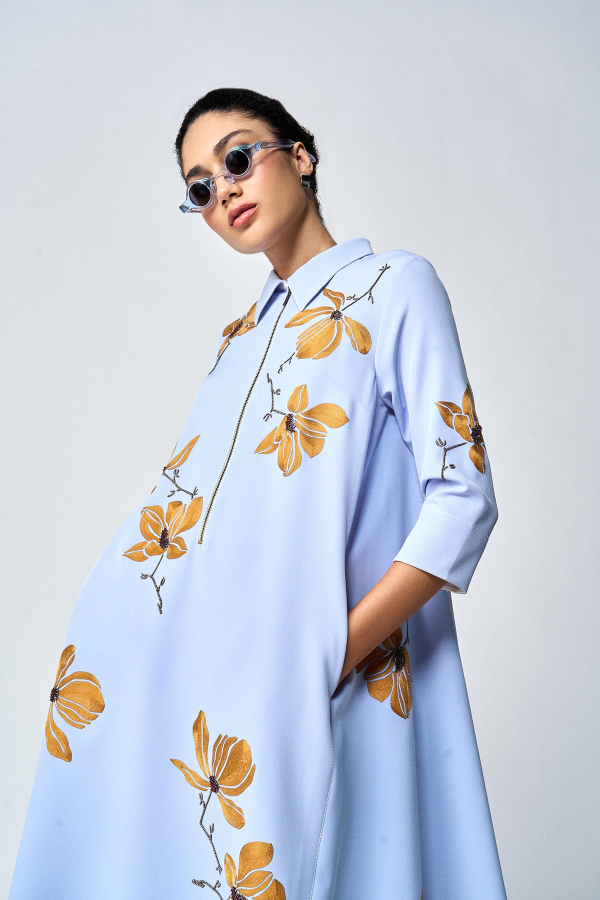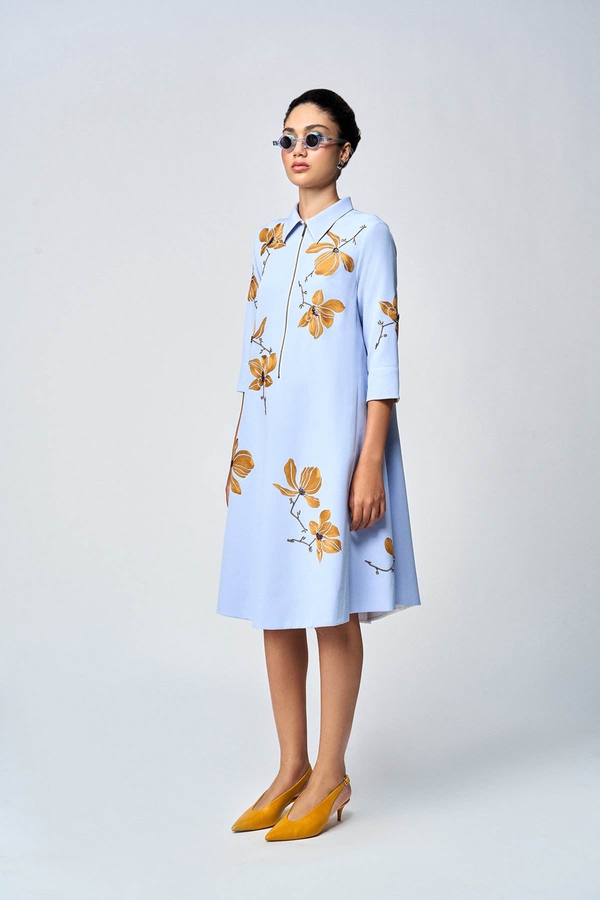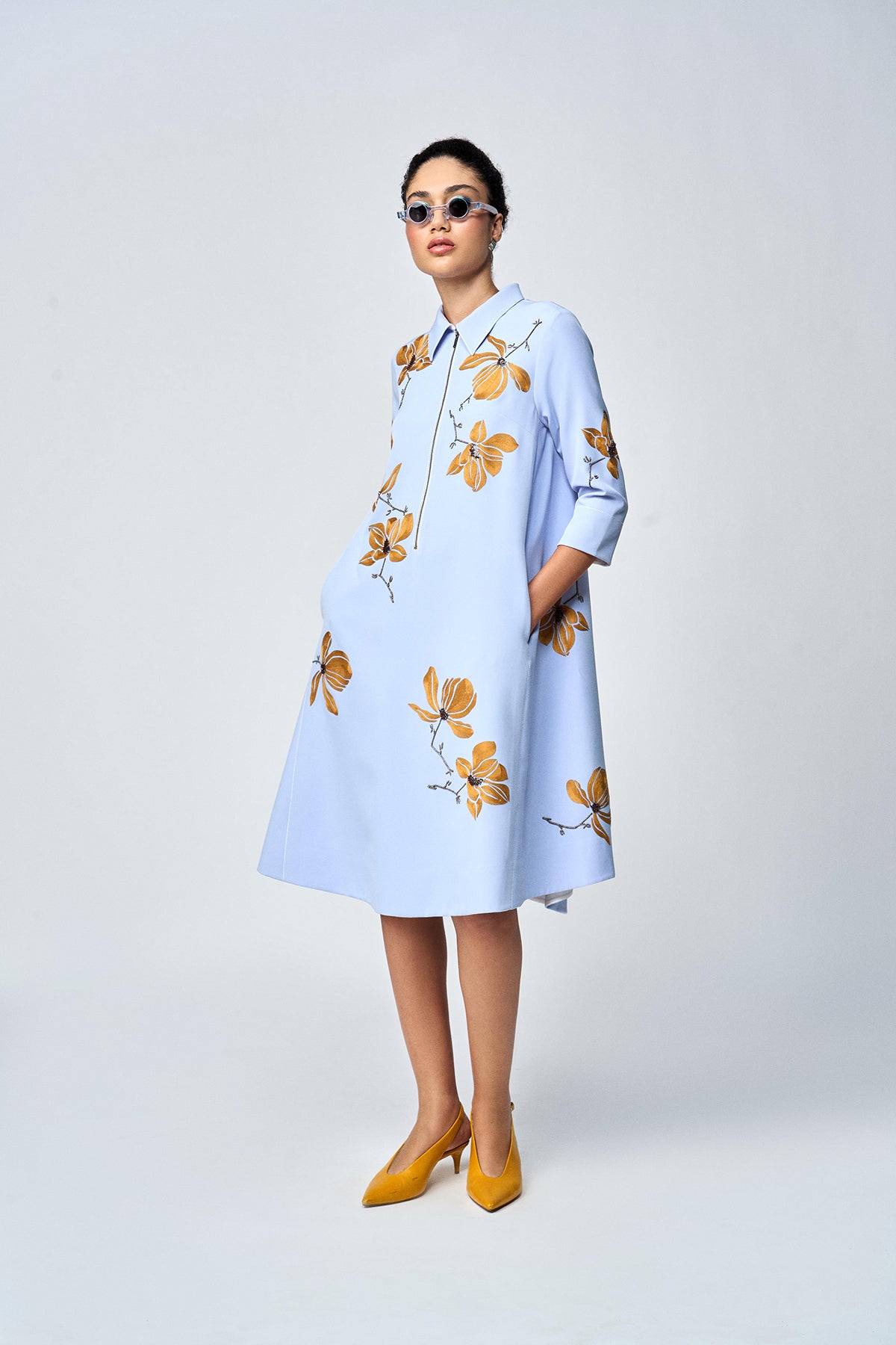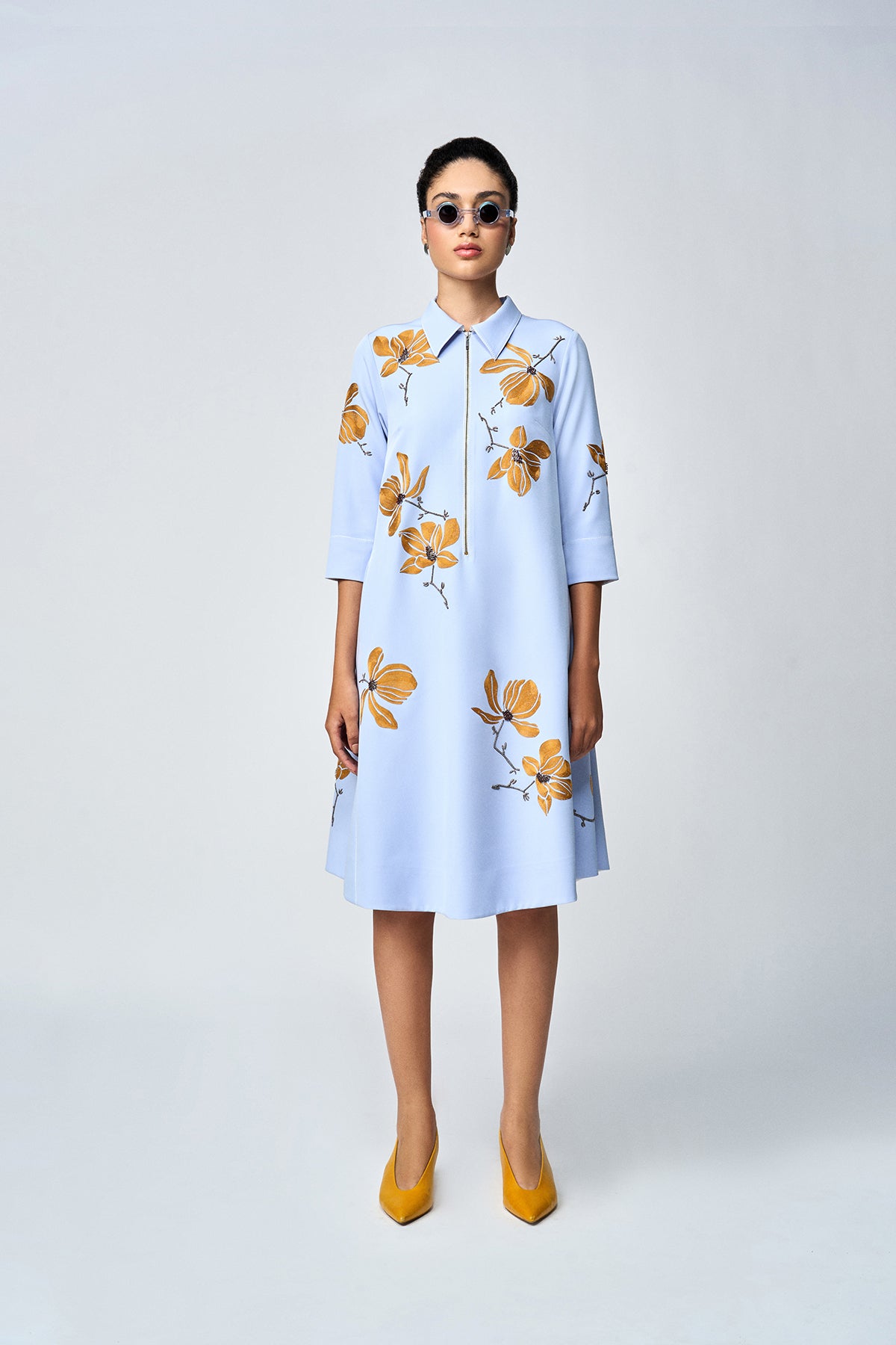 Side triangle dress with magnolia embroidery, featuring a partial metal zip opening with a collar, side concealed pockets, and top stitching detail. It also has contrast color facing under the collar, sleeves, and hem.
