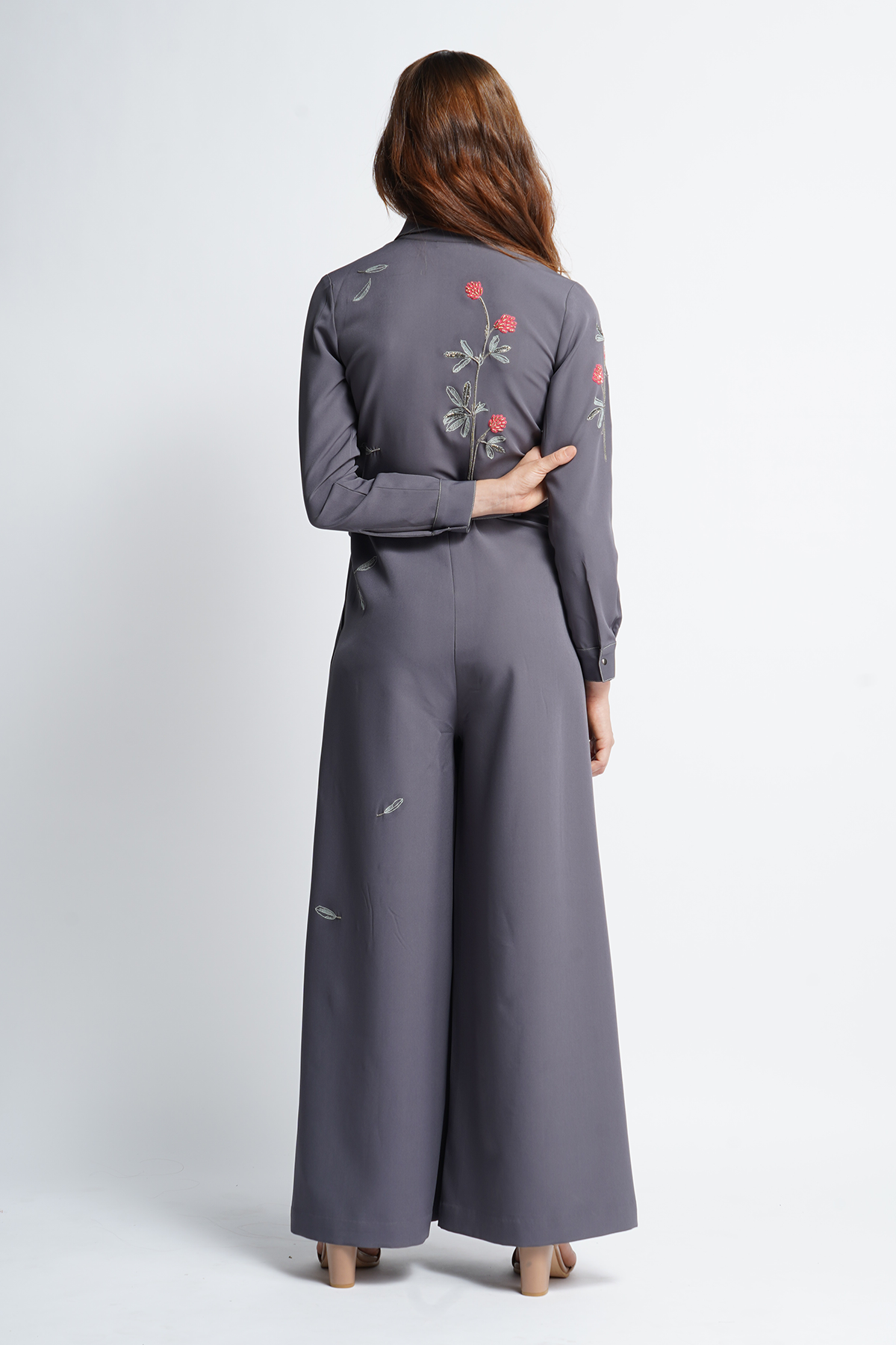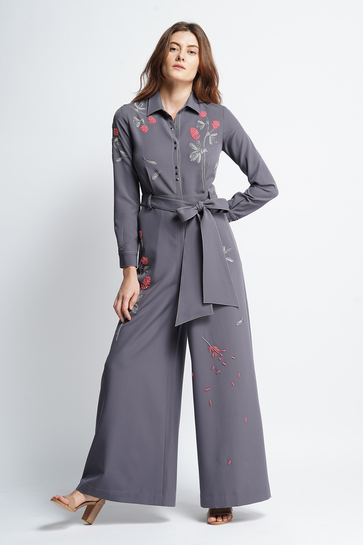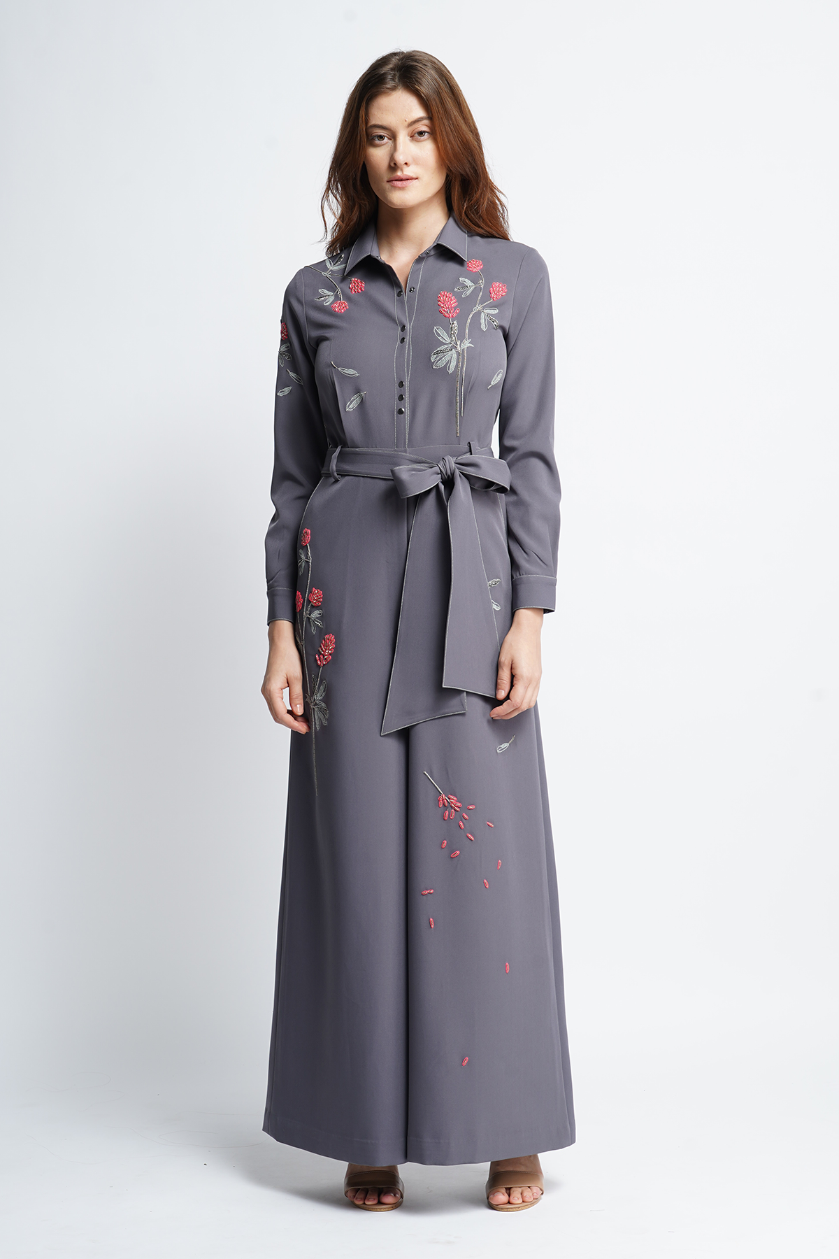 Jumpsuit with meadow plant embroidery. The garment has side pockets, top stitching detail, collar, cuff, seperate belt and snap button fastening.