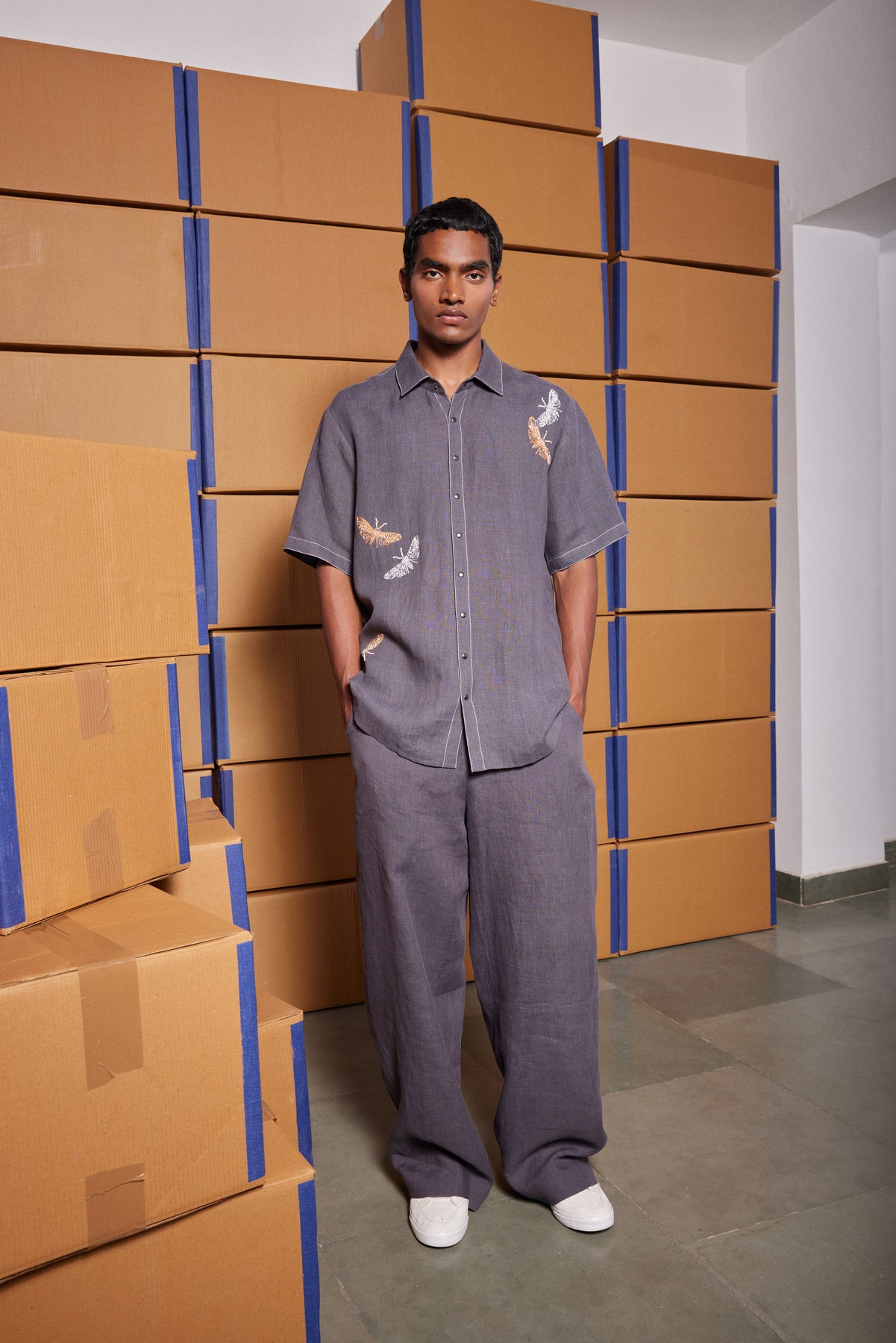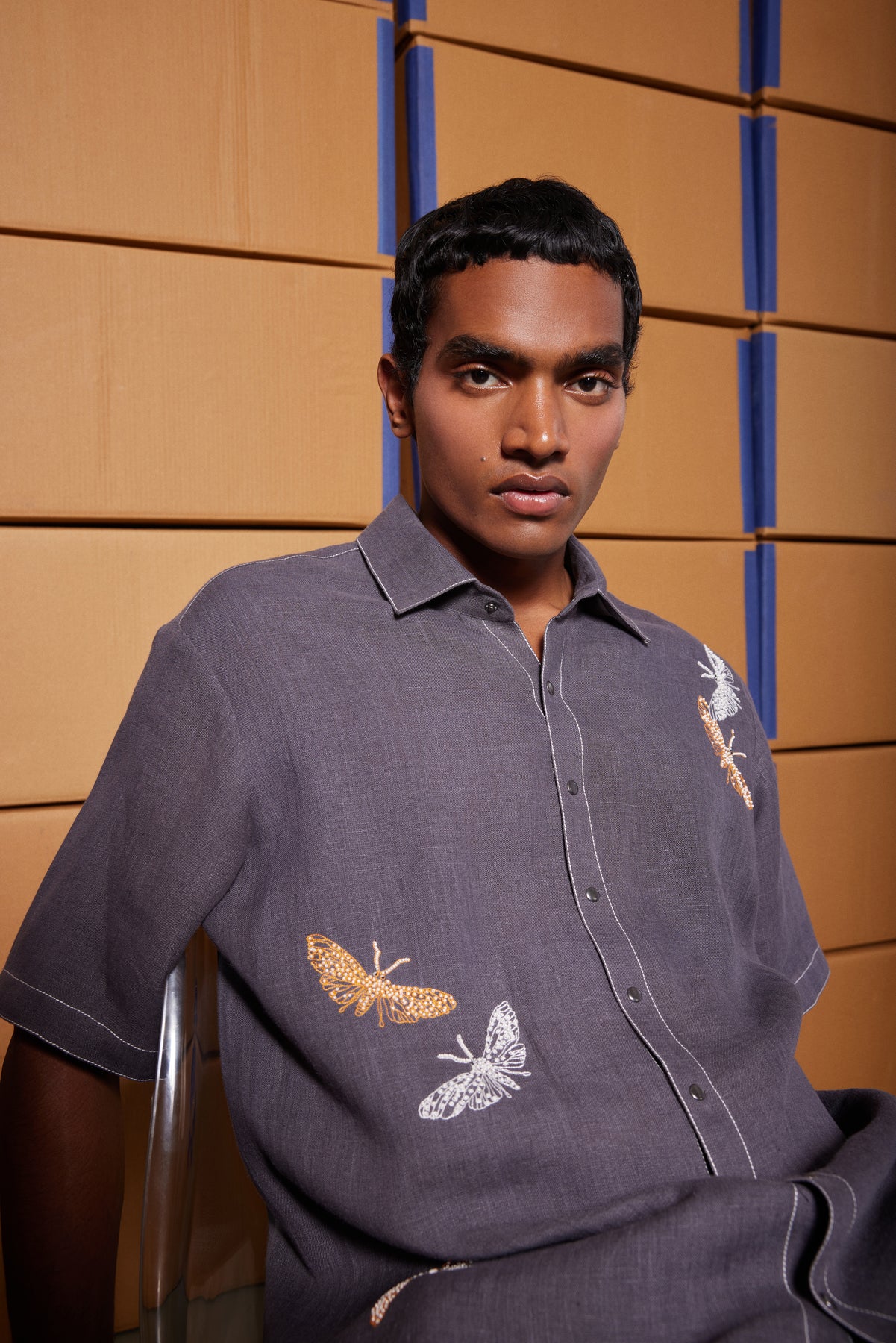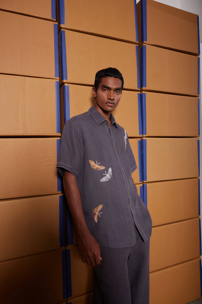 Half sleeves boxy shirt with embroidered Moth. Features a collar, metal snap buttons, and top stitching detail.